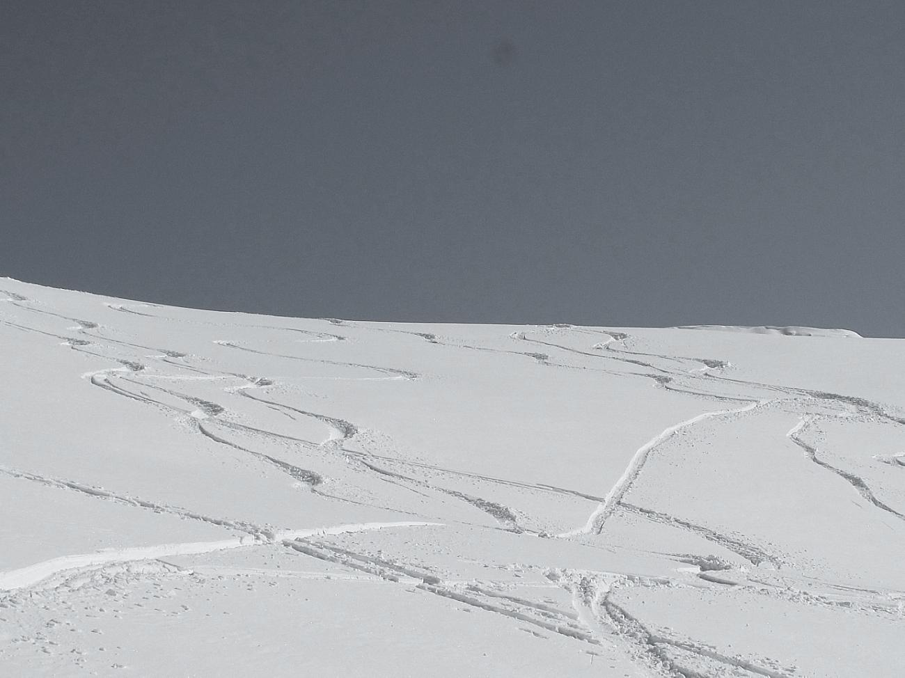 Eravamo convinti di trovare nuova neve e pendii sovraccarichi, invece la perturbazione di ieri non è passata per l’Alta valle. Nella parte inferiore neve piuttosto varia con tratti di crosta morbida alternati ad altri quasi trasformati. Parte superiore con bellissima neve polverosa. Le rocce del Fraiteve si possono aggirare senza problemi con un sicuro traverso in direzione Sud-Est e di qui raggiungere la cima.