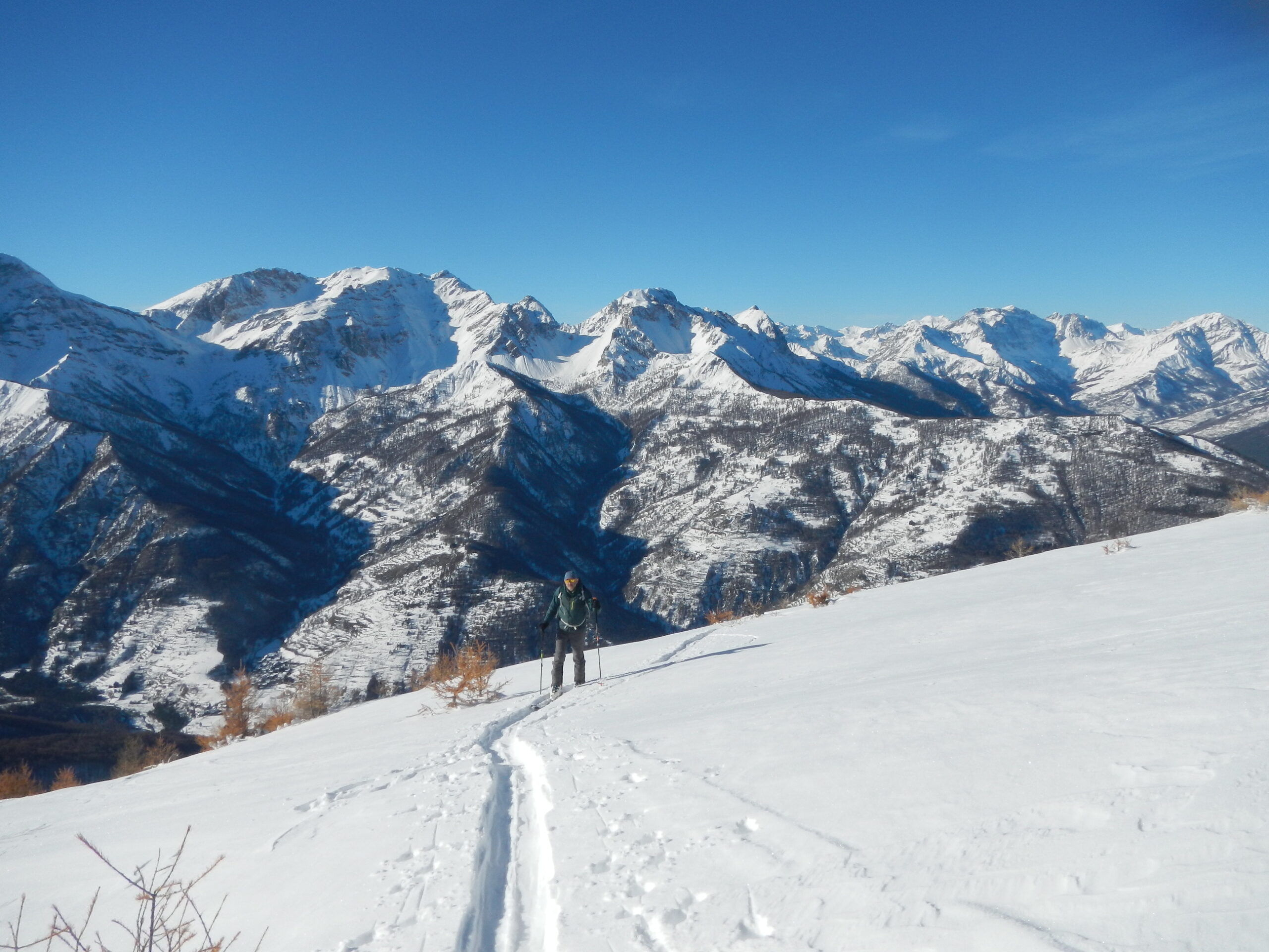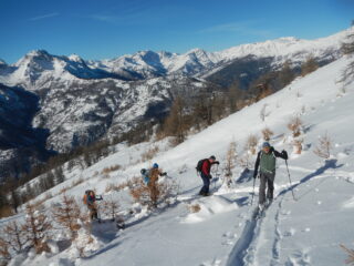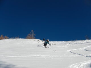 Ci siamo fermati a quota 2421 m. all’inizio del traverso che aggira le rocce che sostengono la cima; il tratto risulta poco innevato con pietre affioranti.