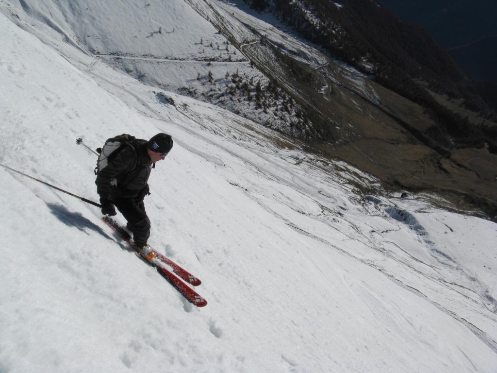 Finalmente il Francais Pelouxe, è vero non nelle condizioni trovate la settimana scorsa ma ancora ben sciabile, a patto che non diano fastidio le innumerevoli tracce. Prima parte paragonabile a quei fuori pista a bordo impianti con numerosi passaggi concentrati in poco spazio, poi man mano che il pendio si allarga, più possibilità di trovare qualche piccolo spazio con farina. Anche la crosta trovata poco prima del colle è sciabilissima. Giunti al colle delle finestre ripellato e risaliti al Pintas dove siamo scesi su primaverile. In compagnia di Ermes.