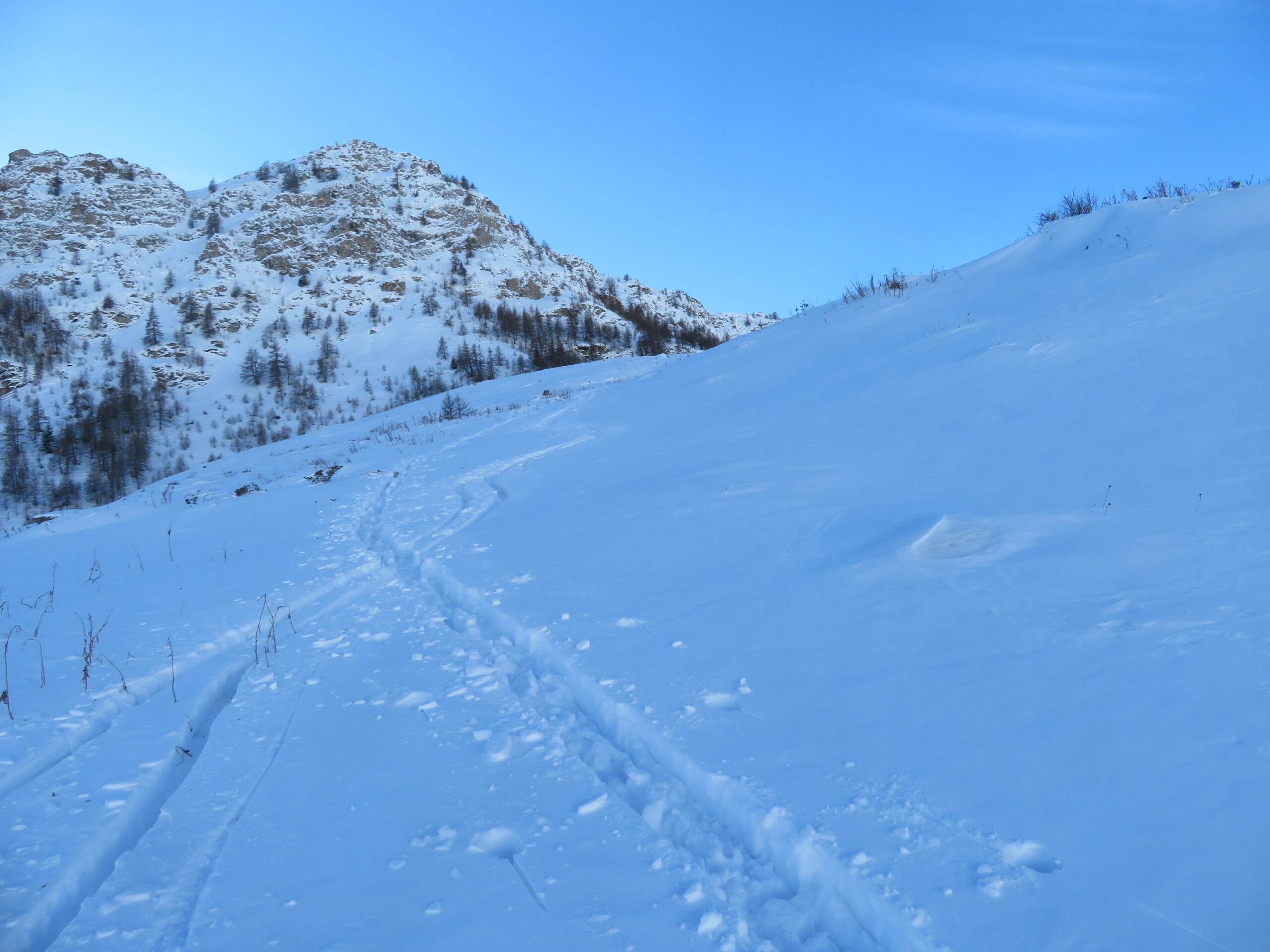 Il manto nevoso alterna tratti di polvere su fondo buono ad altri di polvere senza fondo, con frequenti placche ventate e crosta.