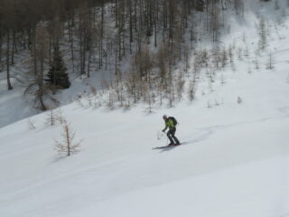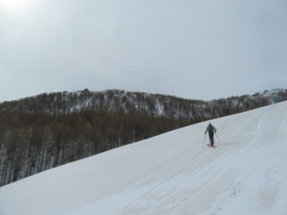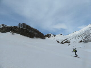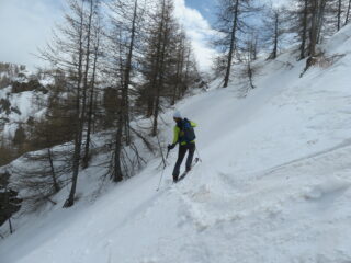 la neve inizia lungo la poderale al boschetto poco dopo la cascata. Siamo saliti per il ripido bosco e per un erto canaletto. Poi lungo la dorsale. Discesa idem.