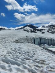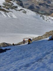 Col senno di poi è stata la scelta giusta: quando il cielo si è aperto abbiamo osservato il ghiacciaio dell’Albaron e a nostro giudizio la parte alta, nei pressi del seracco, non è più in condizioni, e si vedevano anche molte pietre cadute dalla parete sovrastante.