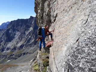 Traversare ancora a sinistra evitando degli strapiombi 5c/6a, poi salire un diedro con due lunghezze fin sotto uno strapiombo 5c.