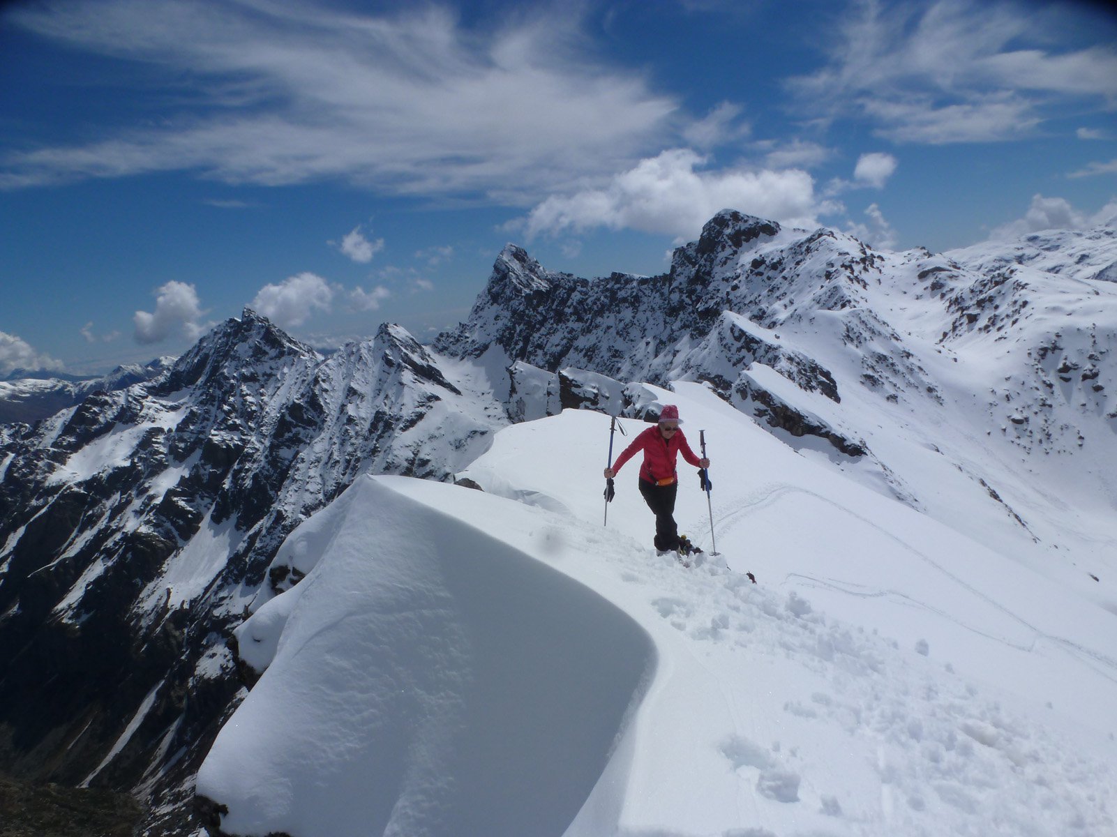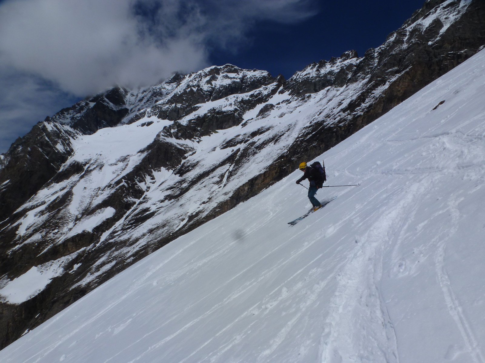 Saliti a Punta Franci (Quota 2803m) Come lo scenario può cambiare in 3 giorni. Oggi neve non assestata e pesante nella parte alta. Scendendo migliora, nel canale fino a 2000m la migliore. In compenso giornata spettacolare.
