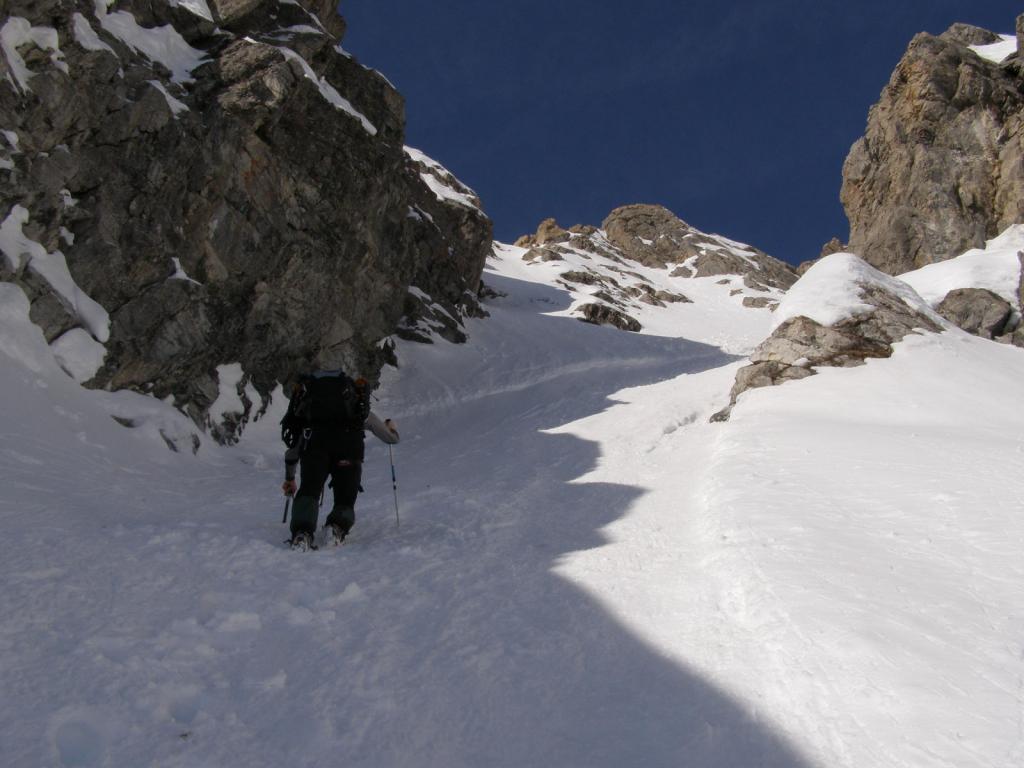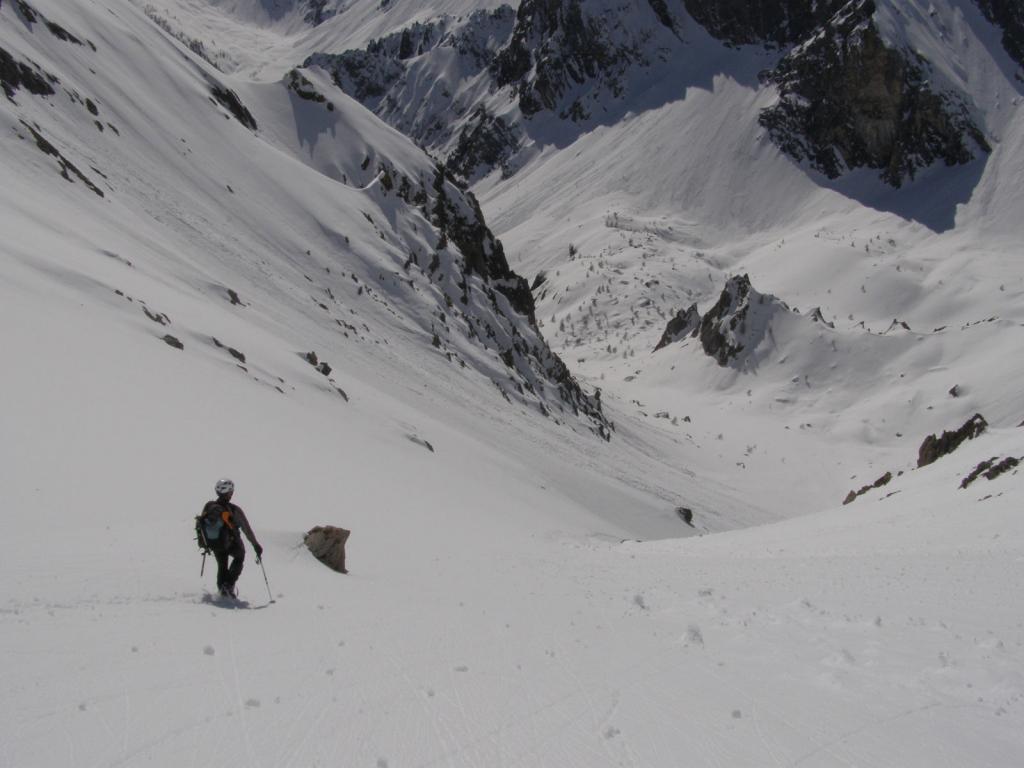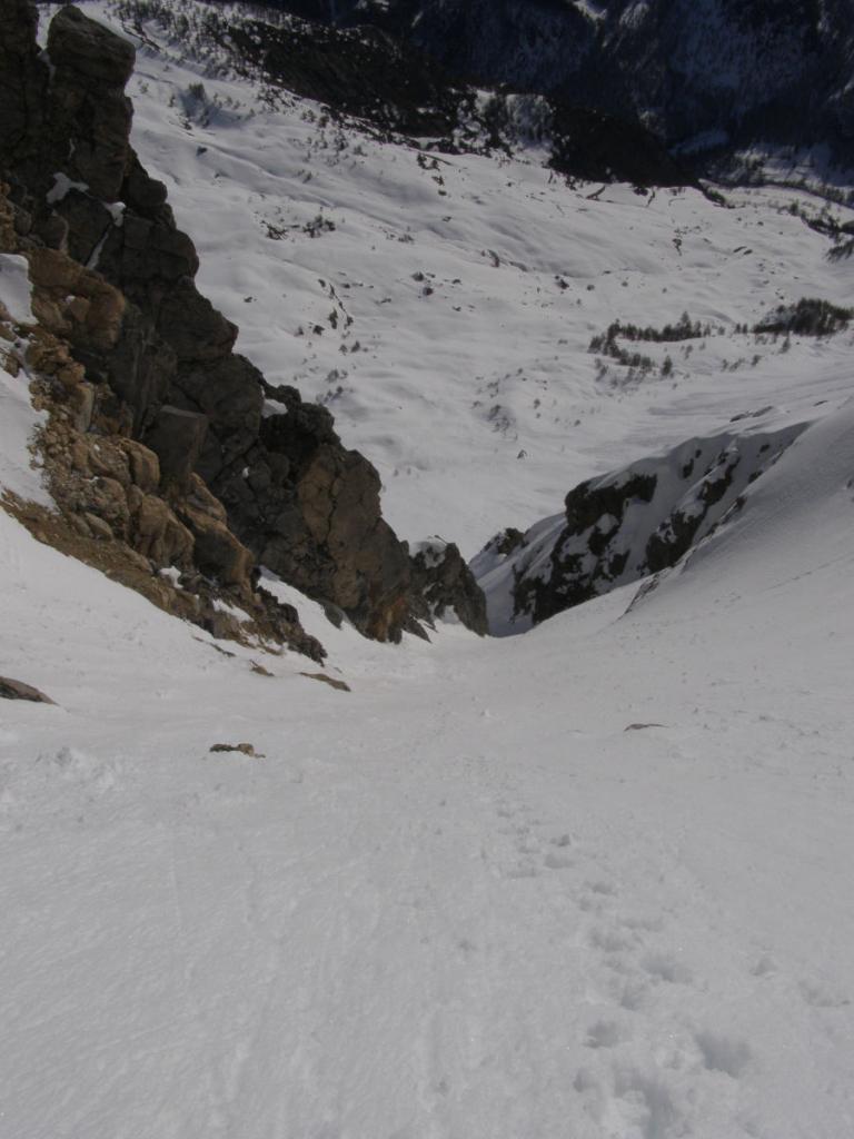 Lo sviluppo è di circa 300 m con pendenze che oscillano tra i 40°-45°. Quasi in cima al canale vi è un grosso masso che lo divide, passare alla sua dx e raggiungere una conca nascosta nei pressi della sella fra la cima N (la più alta) e quella S (pochi metri più bassa).