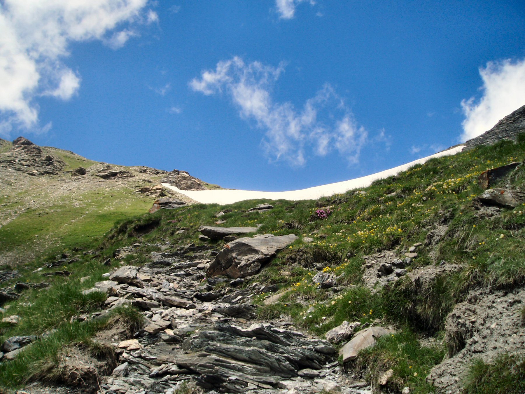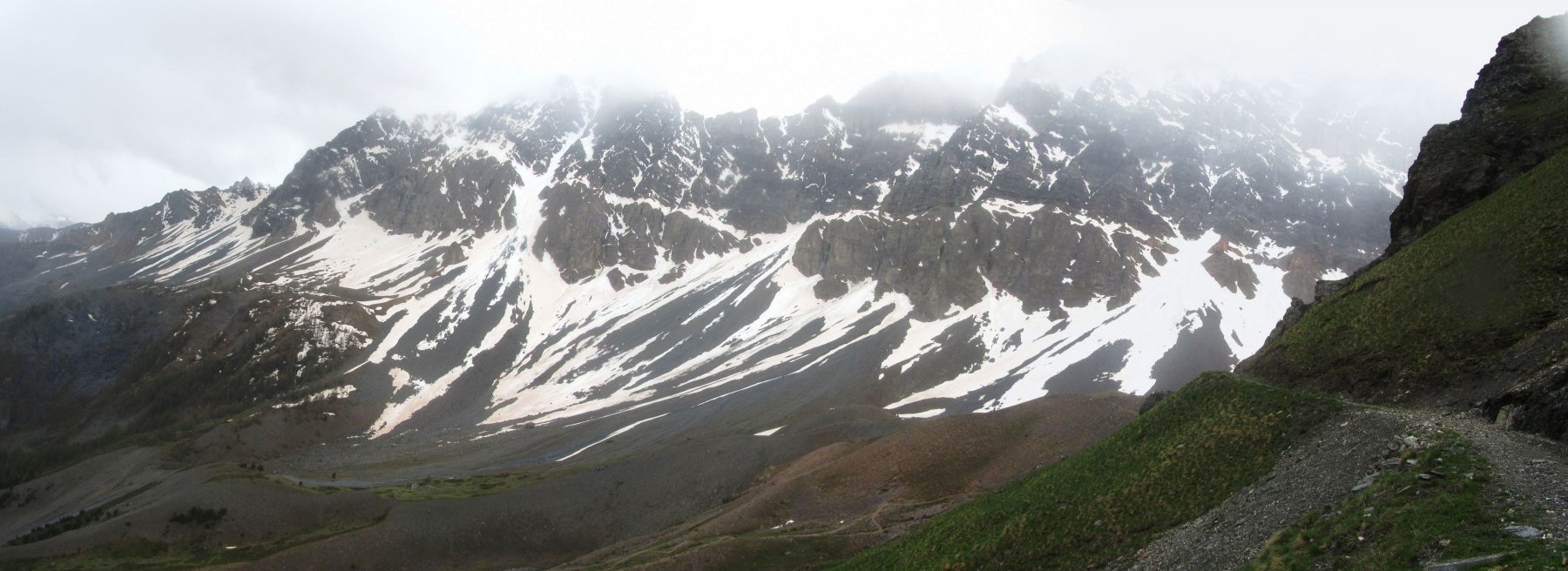 Da li strada per circa 15 min fino al bivio (palina) per il colle della Rho quota 2260; da li sentiero a mezza costa molto ben tracciato e palinato che con qualche saliscendi (più sali che scendi) porta prima la bivio per il col du Petit Argentier (da dove saremmo giunti se fossimo saliti) e poi sempre a mezza costa al colle della Rho (circa 1h15 dal bivio della strada). Percorso splendido con vista notevole.