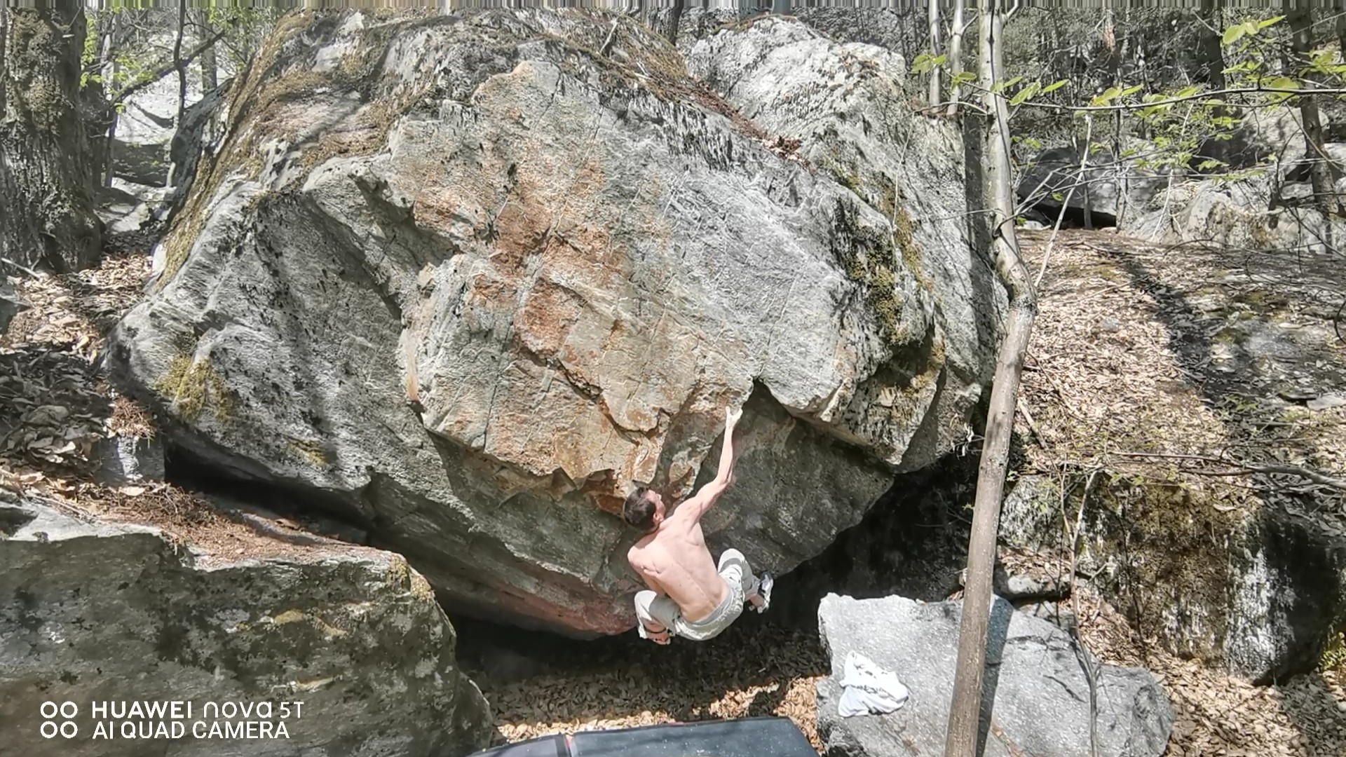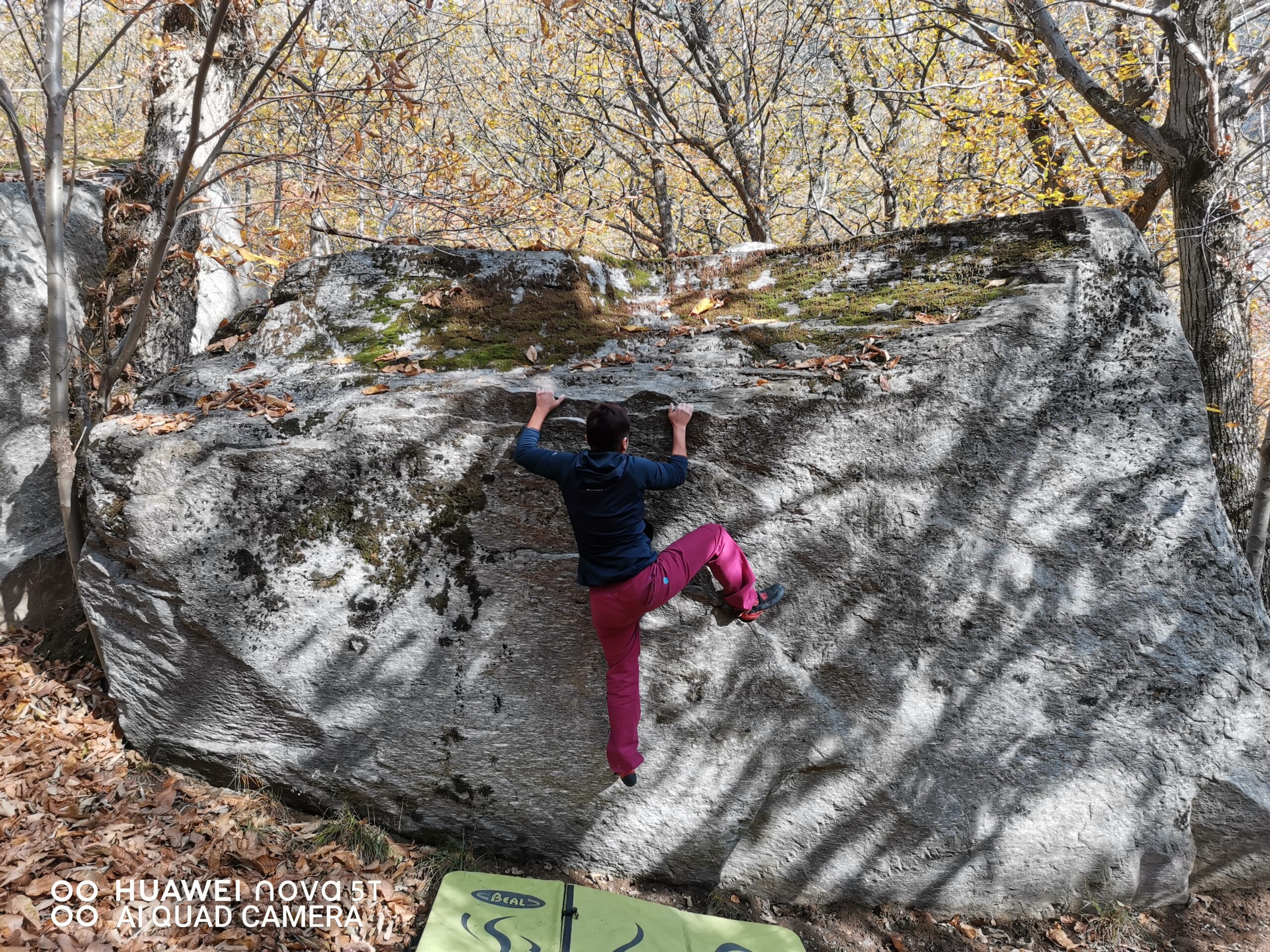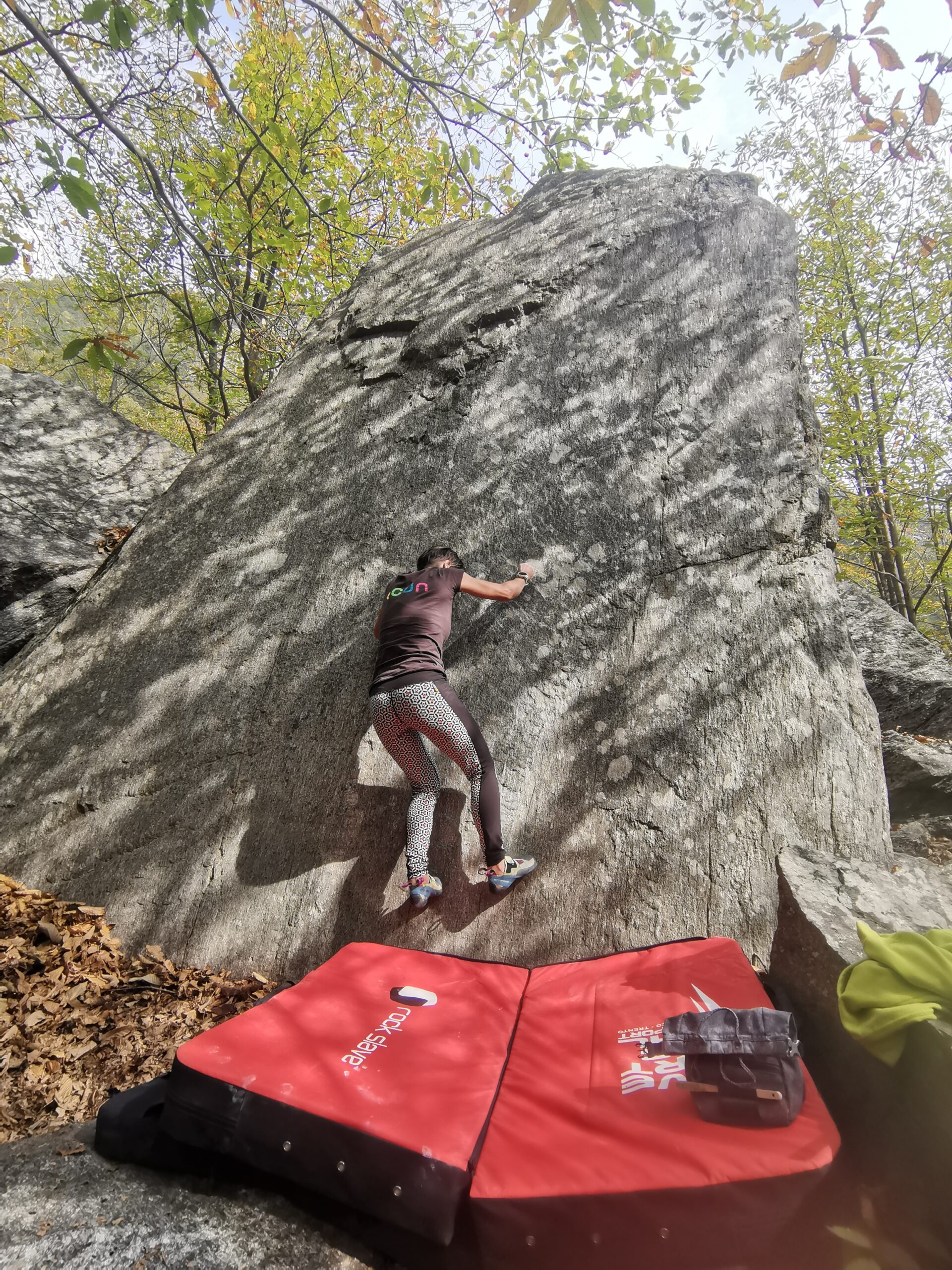 Il settore compressore presenta un trentina di blocchi di ottimo gneiss occhiadino tecnico. Grande varietà di passaggi: placche, strapiombi e tetti con prevalenze di tacche.