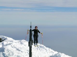 Grazie al consiglio di Franco, che oggi ho saputo era al Briccas e che saluto, siamo saliti al Frioland partendo da Brich siamo saliti fin sotto al Col delle Porte e poi con un lunghissimo traverso sotto cresta fino alla croce di vetta e siamo scesi direttamente dalla cima per un’itinerario che io giudico OS. La foto di luposolitario la illustra perfettamente. Grazie alla giornata splendida e alla neve perfettamente rinvenuta sono riuscito nella mia prima discesa OS sia pur un po’ contratto alla partenza è stata per me una bella soddisfazione. Alla fine del tratto ripido conviene portarsi a sinistra e attraversare poi più alto possibile fino nei pressi di una baita solitaria, di lì attraversare un valloncello, prima in discesa, poi con una trentina di metri di risalita e continuando ad attraversare, ora più agevomente verso sinistra fino a ritrovare l’itinerario di salita. Gli ultimi 100 metri conviene farli a piedi per non mettere e togliere in continuazione. Io ed Enrico con la tavola, Angela, Luca e Marco con gli sci.