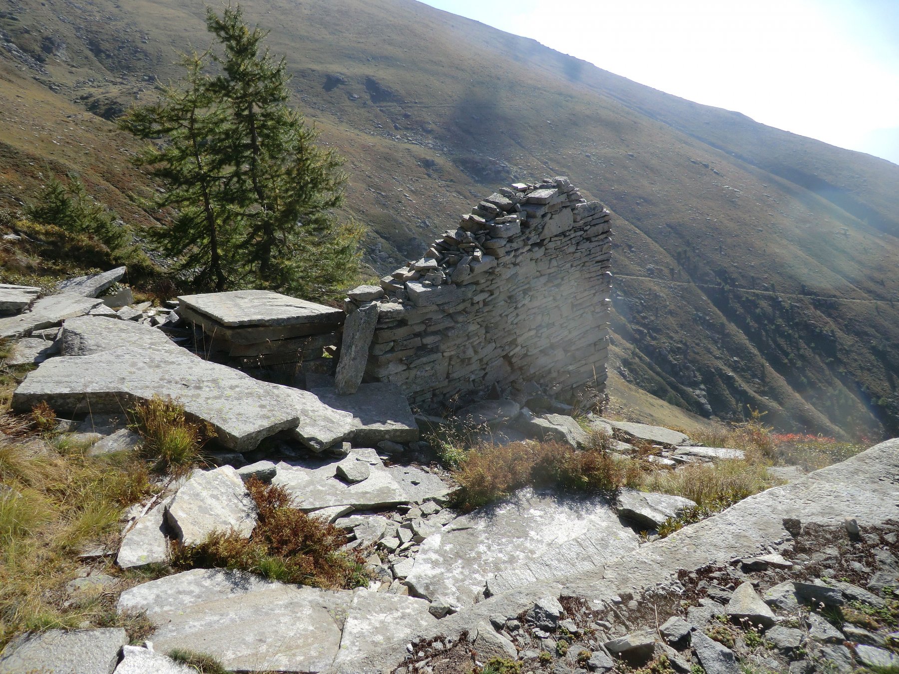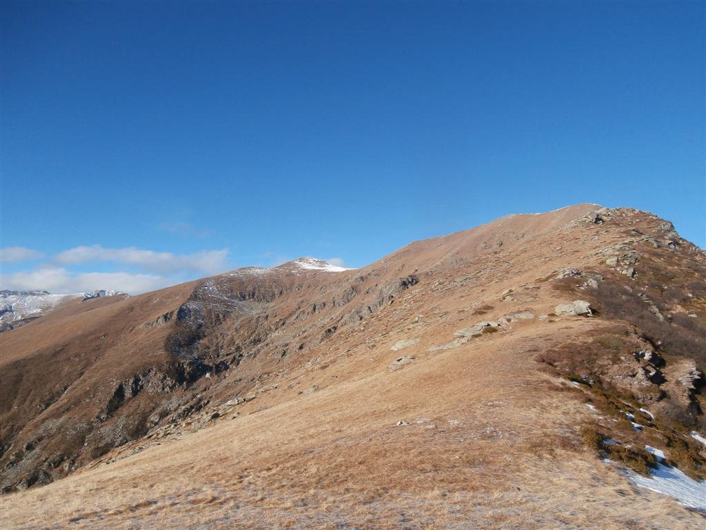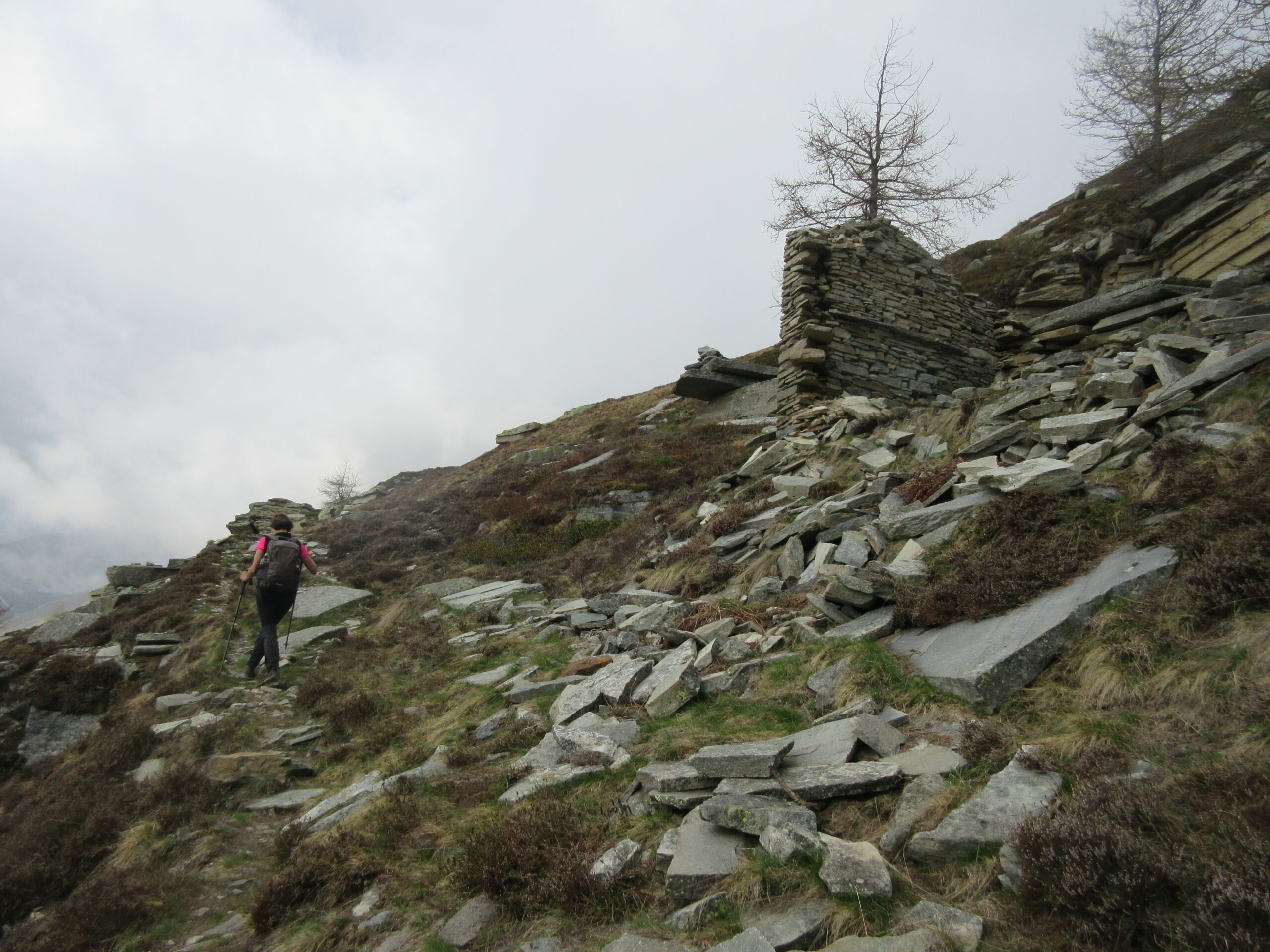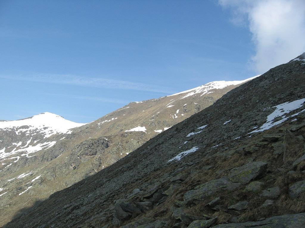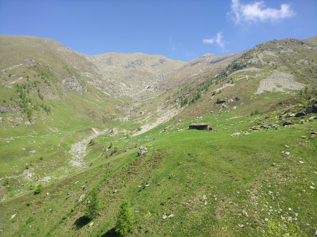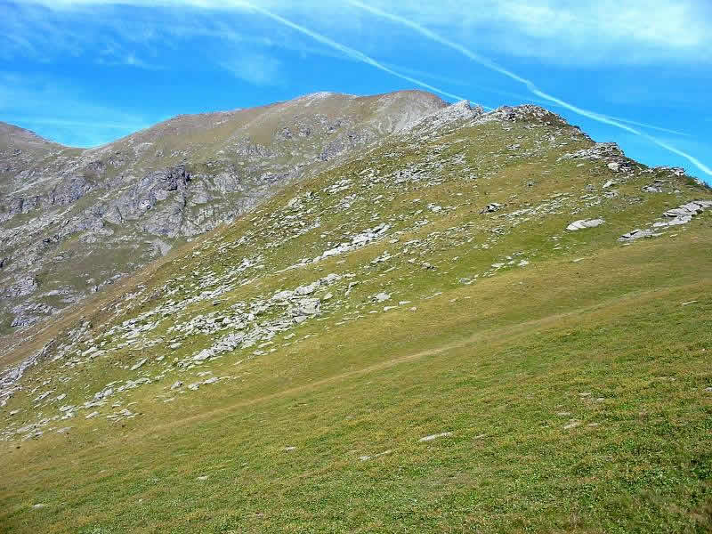 La mulattiera, ora a fondo erboso, compie un lungo traverso a pendenza moderata alle pendici del Briccàs, supera un impluvio (bella sorgente) e conduce ad un’antica cava di lose (resti di un edificio). Da questo punto la mulattiera diventa sentiero, il quale in piano traversa fino a una seconda piccola cava, piega a destra e si porta su un ampio dorso erboso poco pendente (ometti). Trascurare il ramo di destra del sentiero che conduce al colle delle Porte e seguire la traccia a sinistra, sempre segnalata da ometti, che raggiunge la cresta presso una sella a monte del Colle delle Porte.