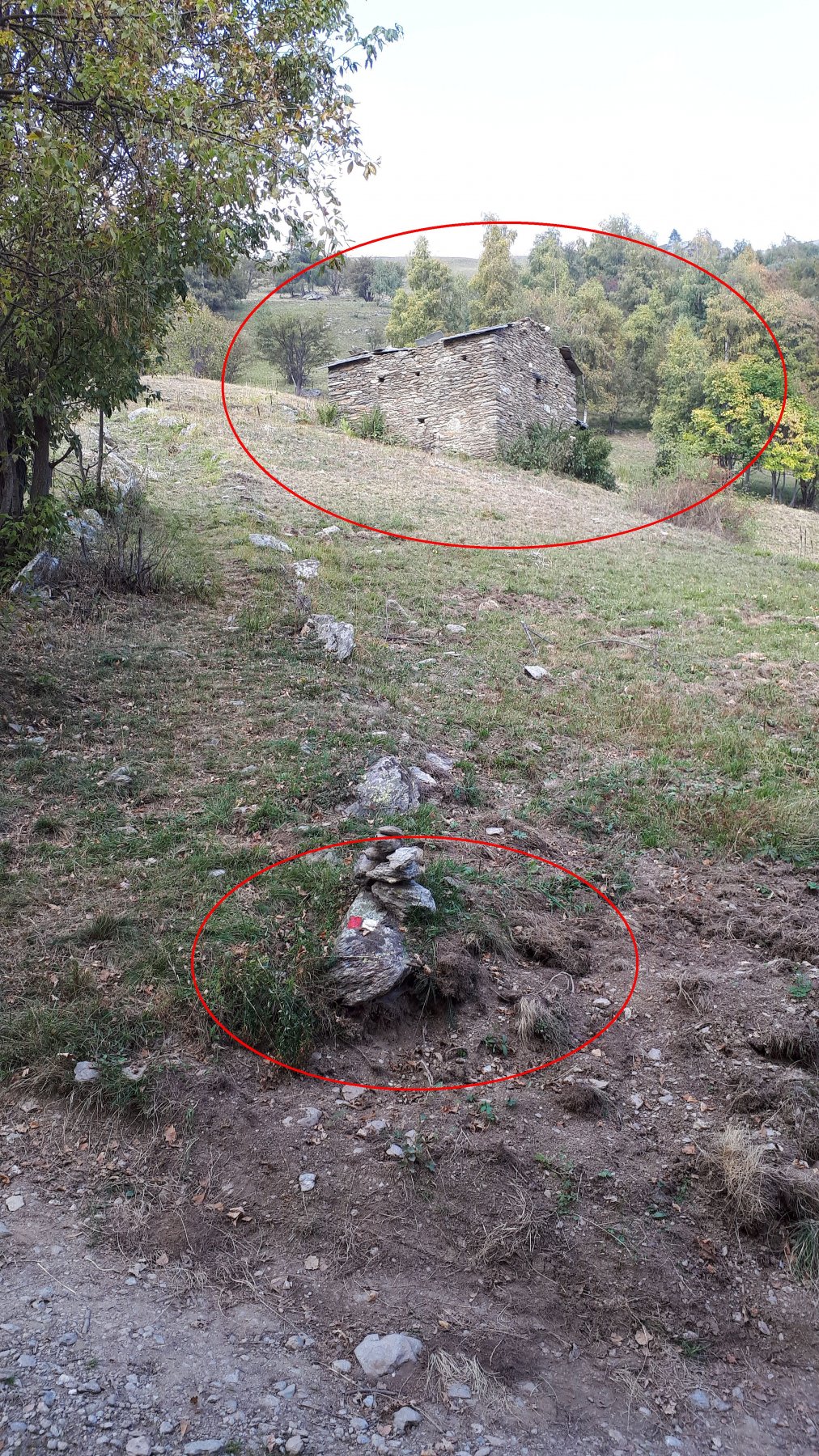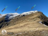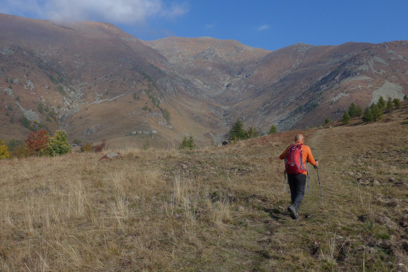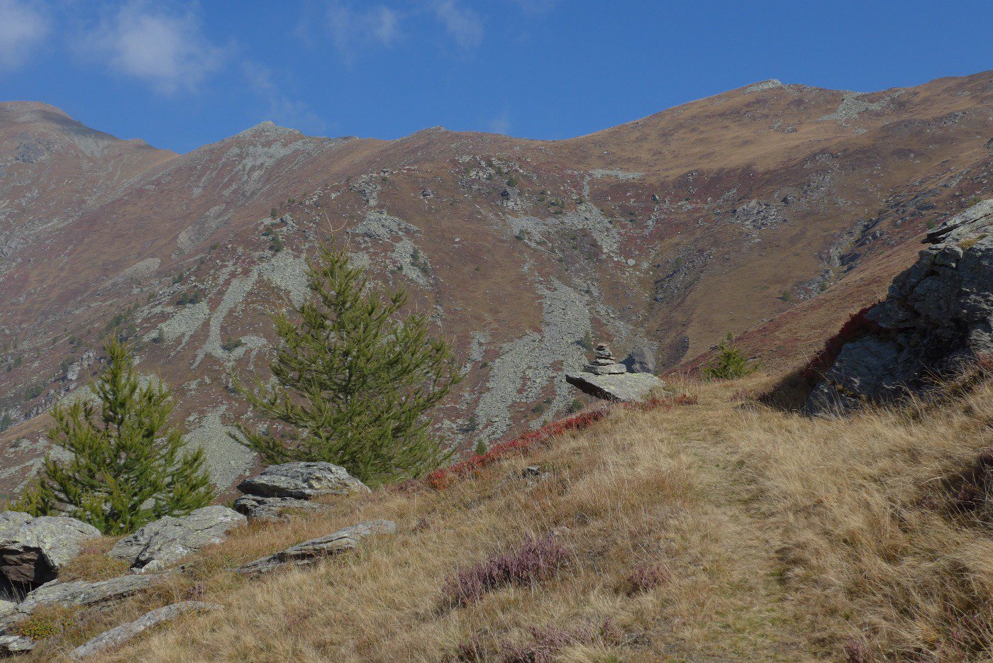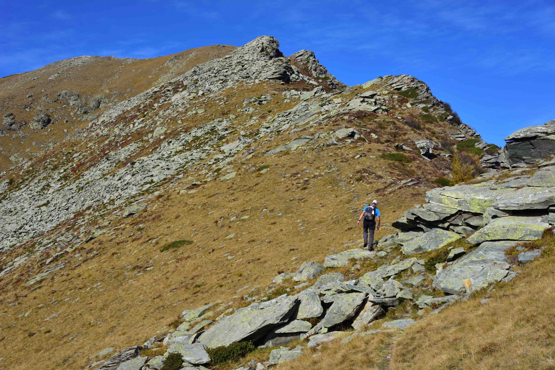 La mulattiera, ora a fondo erboso, compie un lungo traverso a pendenza moderata alle pendici del Briccàs, supera un impluvio (bella sorgente) e conduce ad un’antica cava di lose (resti di un edificio). Da questo punto la mulattiera diventa sentiero, il quale in piano traversa fino a una seconda piccola cava, piega a destra e si porta su un ampio dorso erboso poco pendente (ometti). Trascurare il ramo di destra del sentiero che conduce al colle delle Porte e seguire la traccia a sinistra, sempre segnalata da ometti, che raggiunge la cresta presso una sella a monte del Colle delle Porte.
