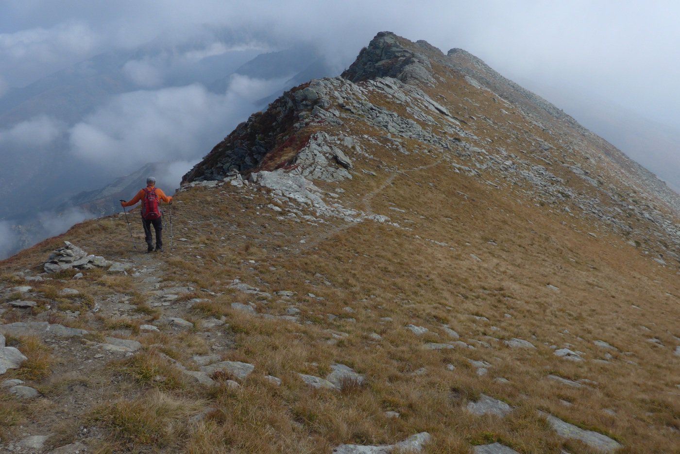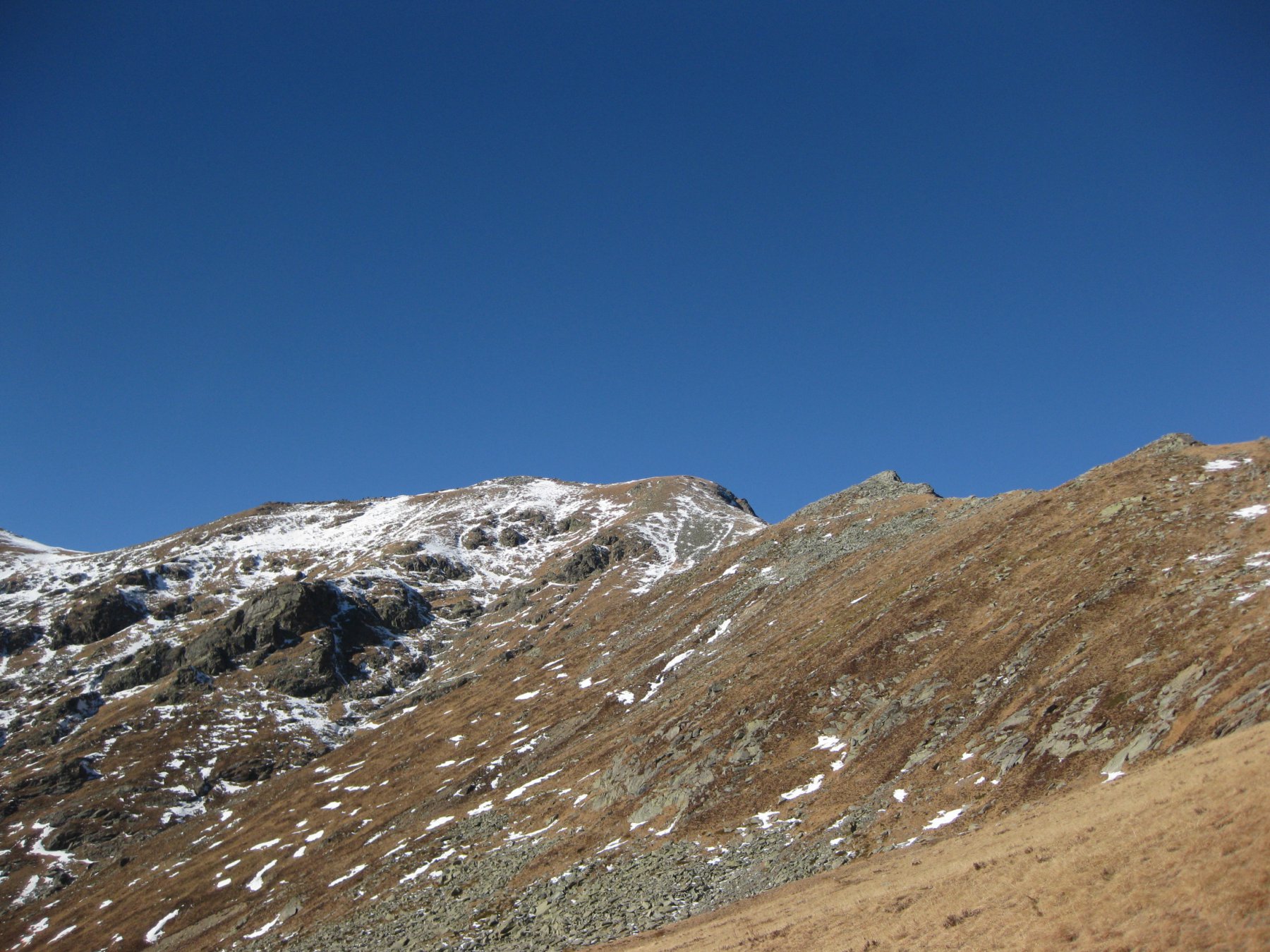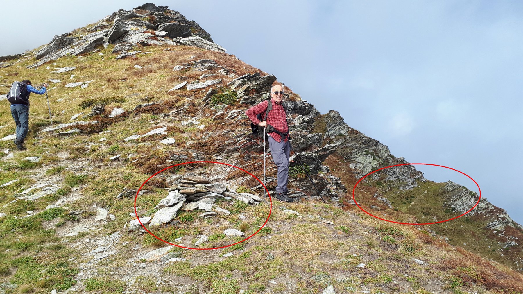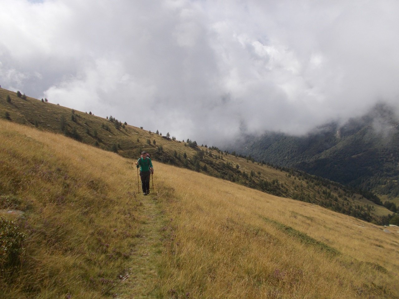 La mulattiera, ora a fondo erboso, compie un lungo traverso a pendenza moderata alle pendici del Briccàs, supera un impluvio (bella sorgente) e conduce ad un’antica cava di lose (resti di un edificio). Da questo punto la mulattiera diventa sentiero, il quale in piano traversa fino a una seconda piccola cava, piega a destra e si porta su un ampio dorso erboso poco pendente (ometti). Trascurare il ramo di destra del sentiero che conduce al colle delle Porte e seguire la traccia a sinistra, sempre segnalata da ometti, che raggiunge la cresta presso una sella a monte del Colle delle Porte.