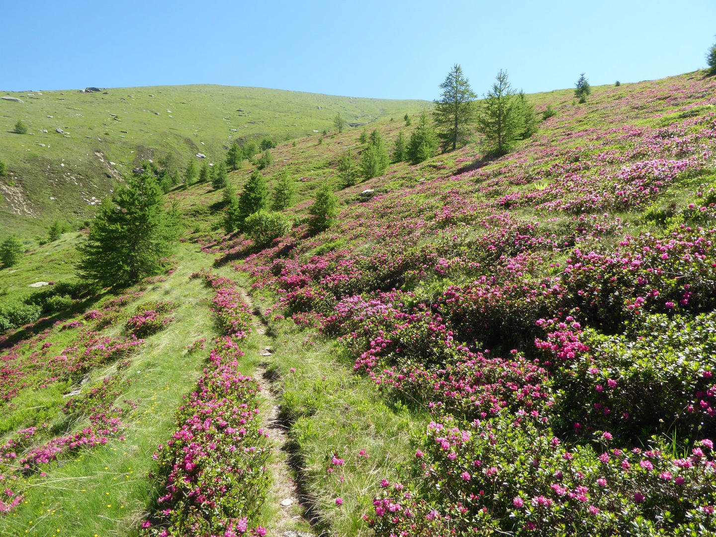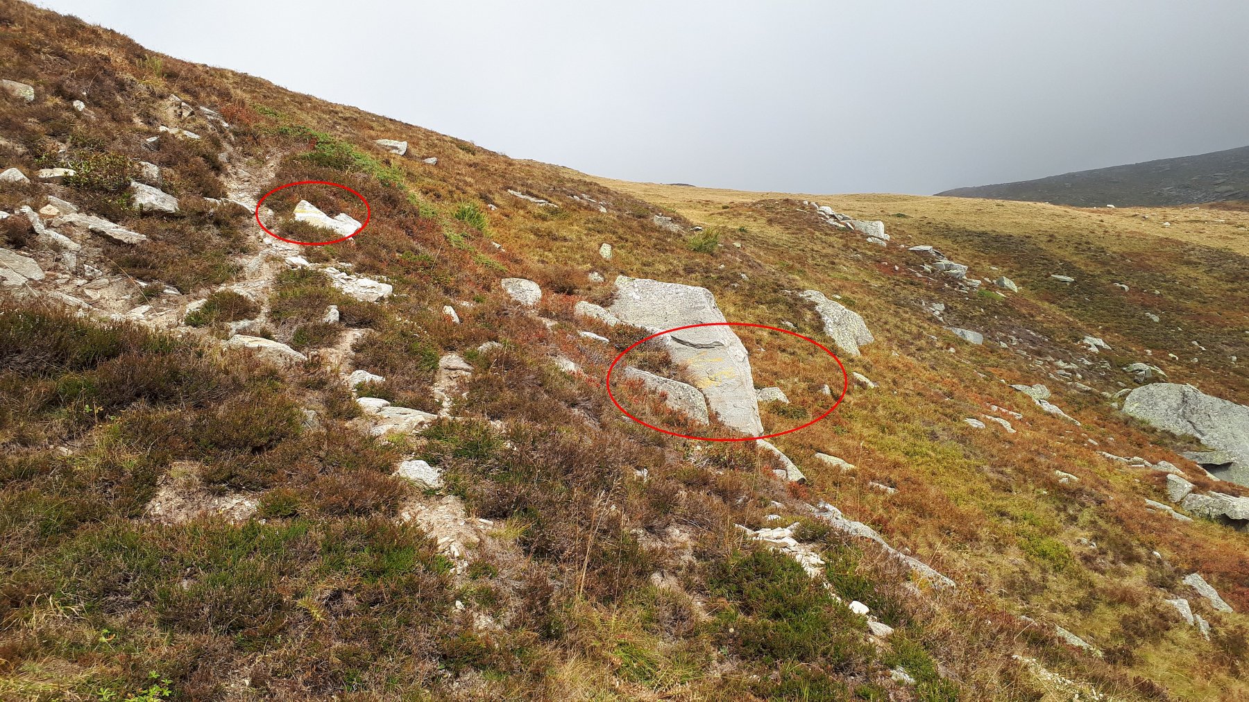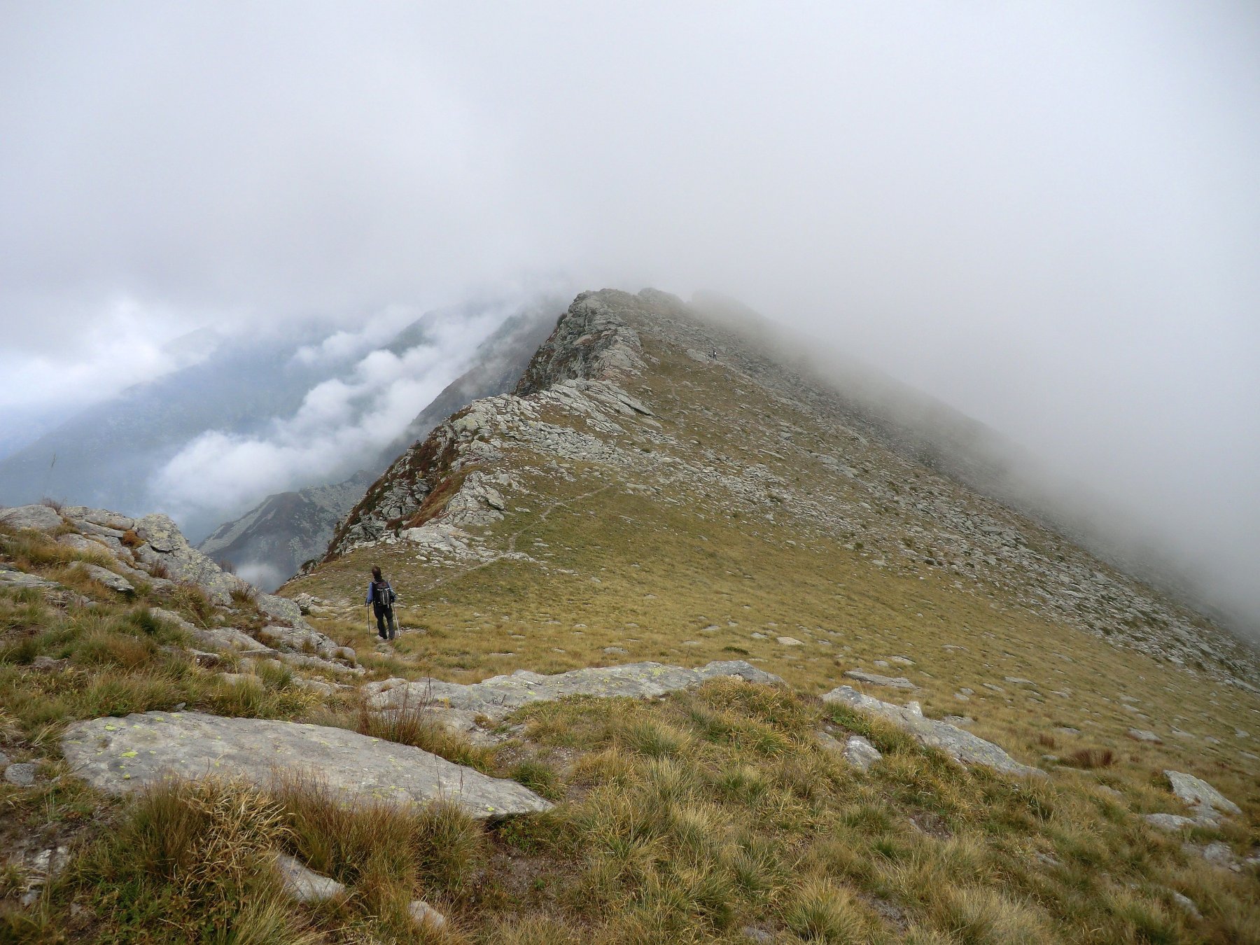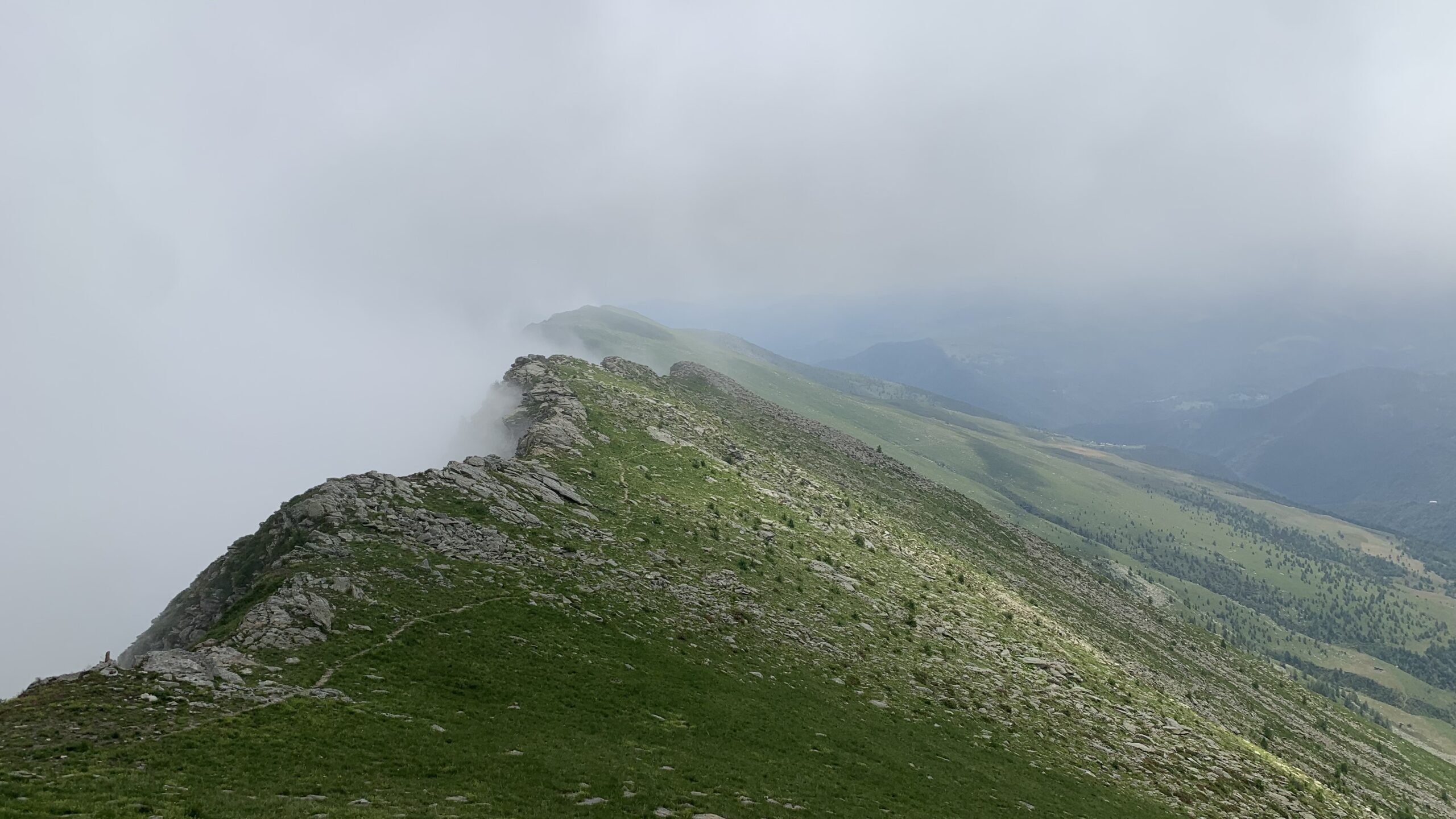 La mulattiera, ora a fondo erboso, compie un lungo traverso a pendenza moderata alle pendici del Briccàs, supera un impluvio (bella sorgente) e conduce ad un’antica cava di lose (resti di un edificio). Da questo punto la mulattiera diventa sentiero, il quale in piano traversa fino a una seconda piccola cava, piega a destra e si porta su un ampio dorso erboso poco pendente (ometti). Trascurare il ramo di destra del sentiero che conduce al colle delle Porte e seguire la traccia a sinistra, sempre segnalata da ometti, che raggiunge la cresta presso una sella a monte del Colle delle Porte.