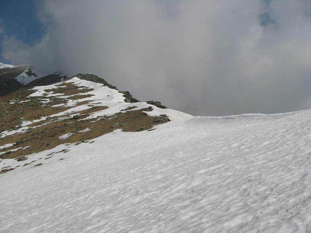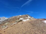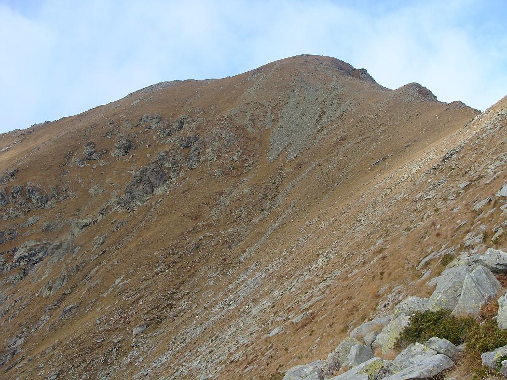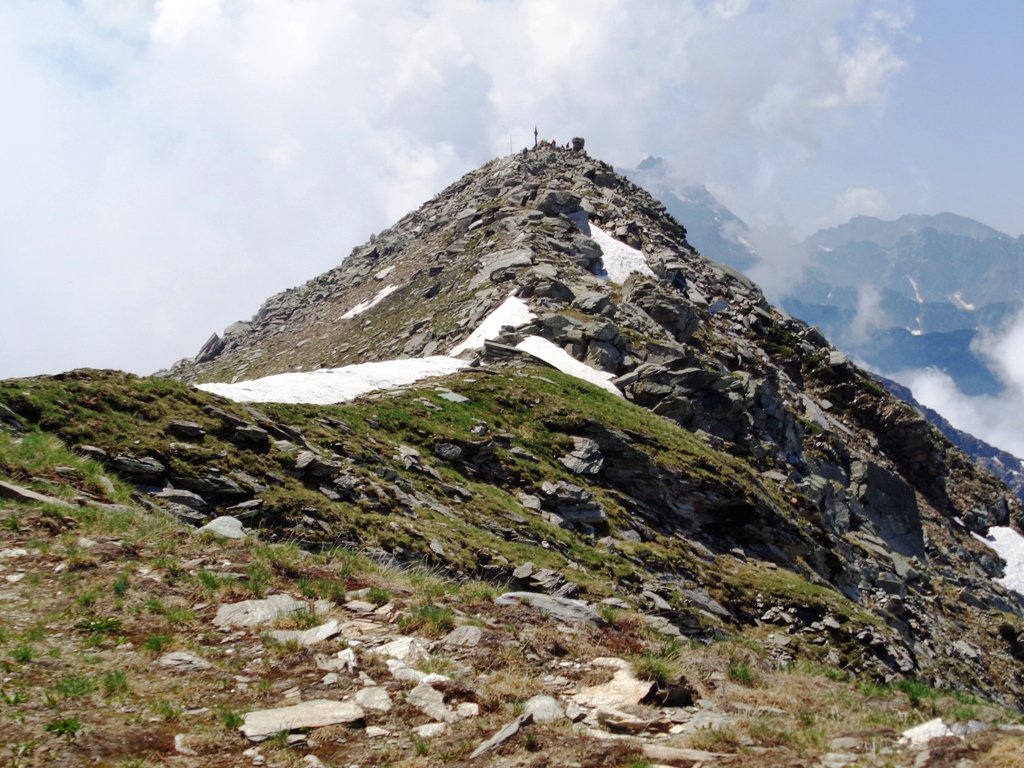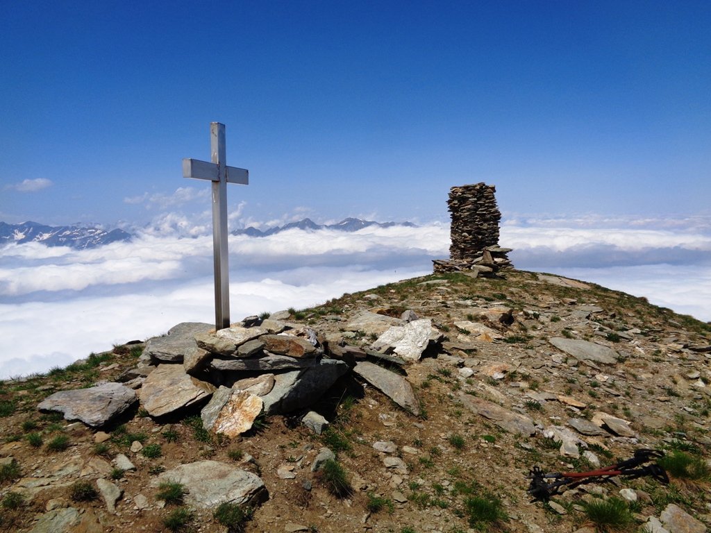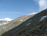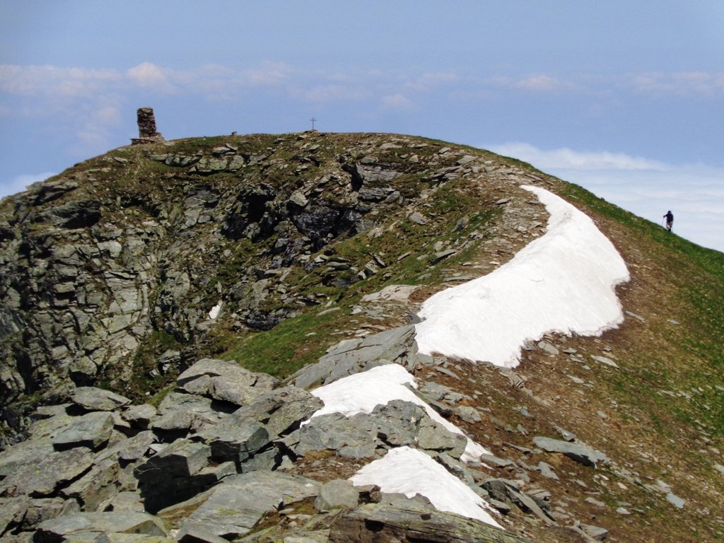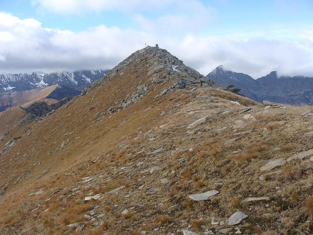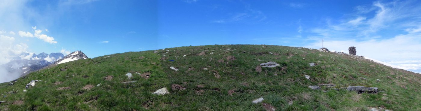 Qui terminano i segnali bianco-rossi recentemente ripristinati. Seguire quindi la traccia che si tiene in cresta o sul versante valle Po e con un ultimo tratto più ripido conduce prima all’anticima 2720 m e quindi per la breve e ampia cresta di blocchi alla vetta del Frioland m 2735 (due croci, grossi ometti e libro di vetta).