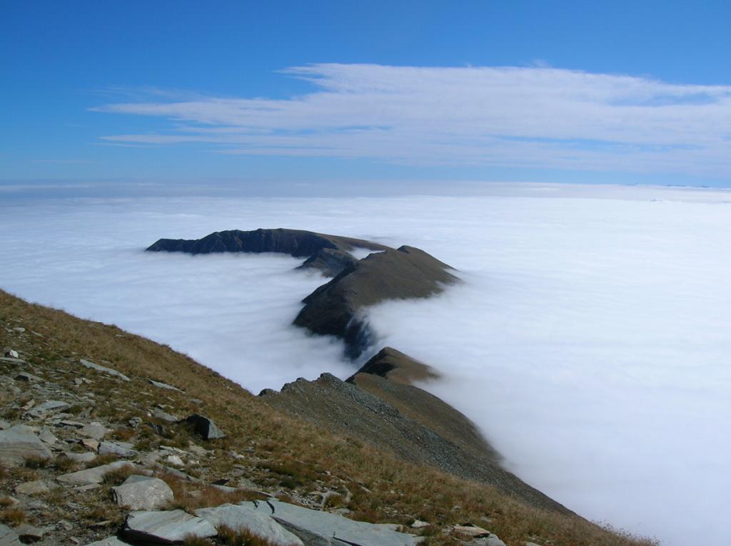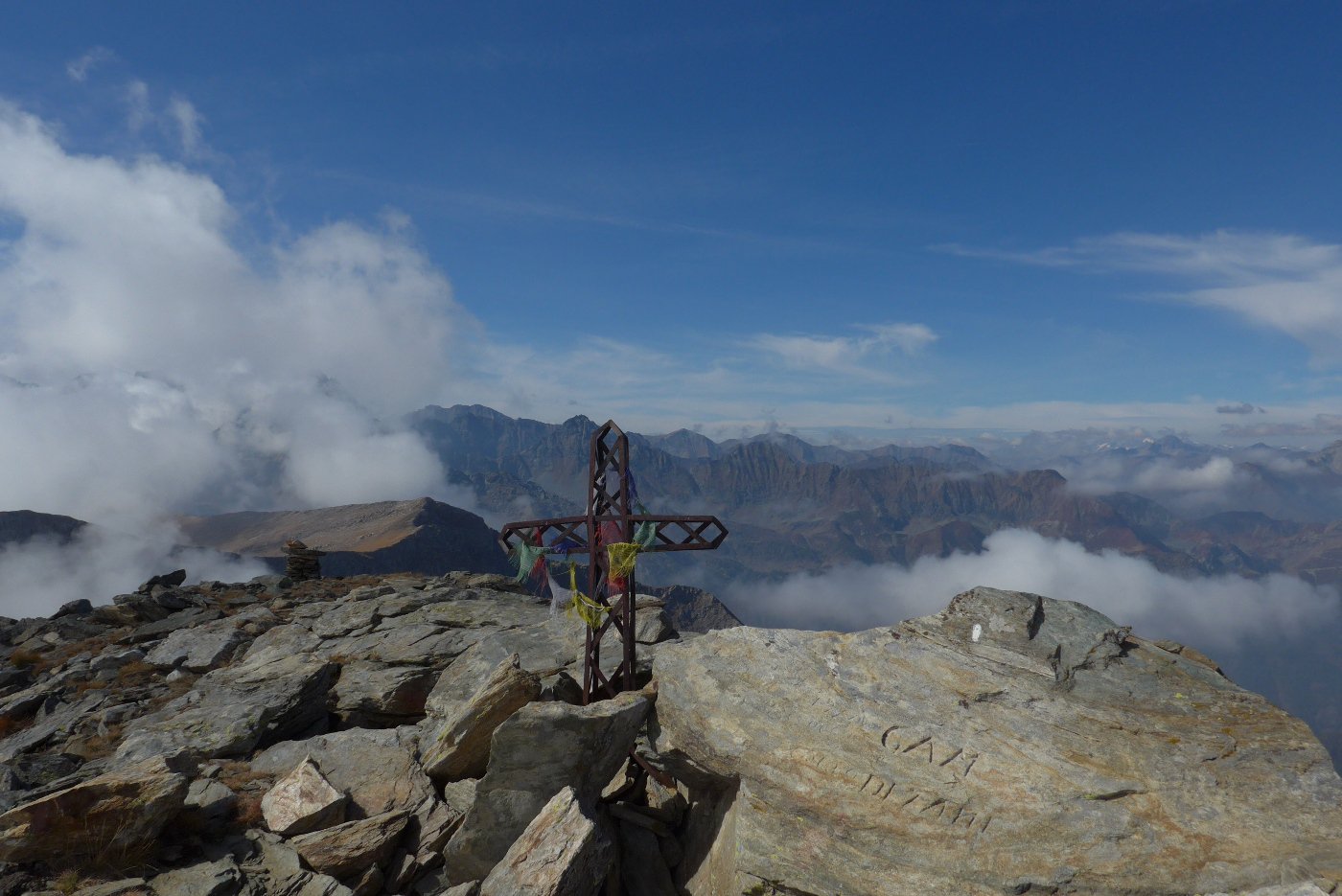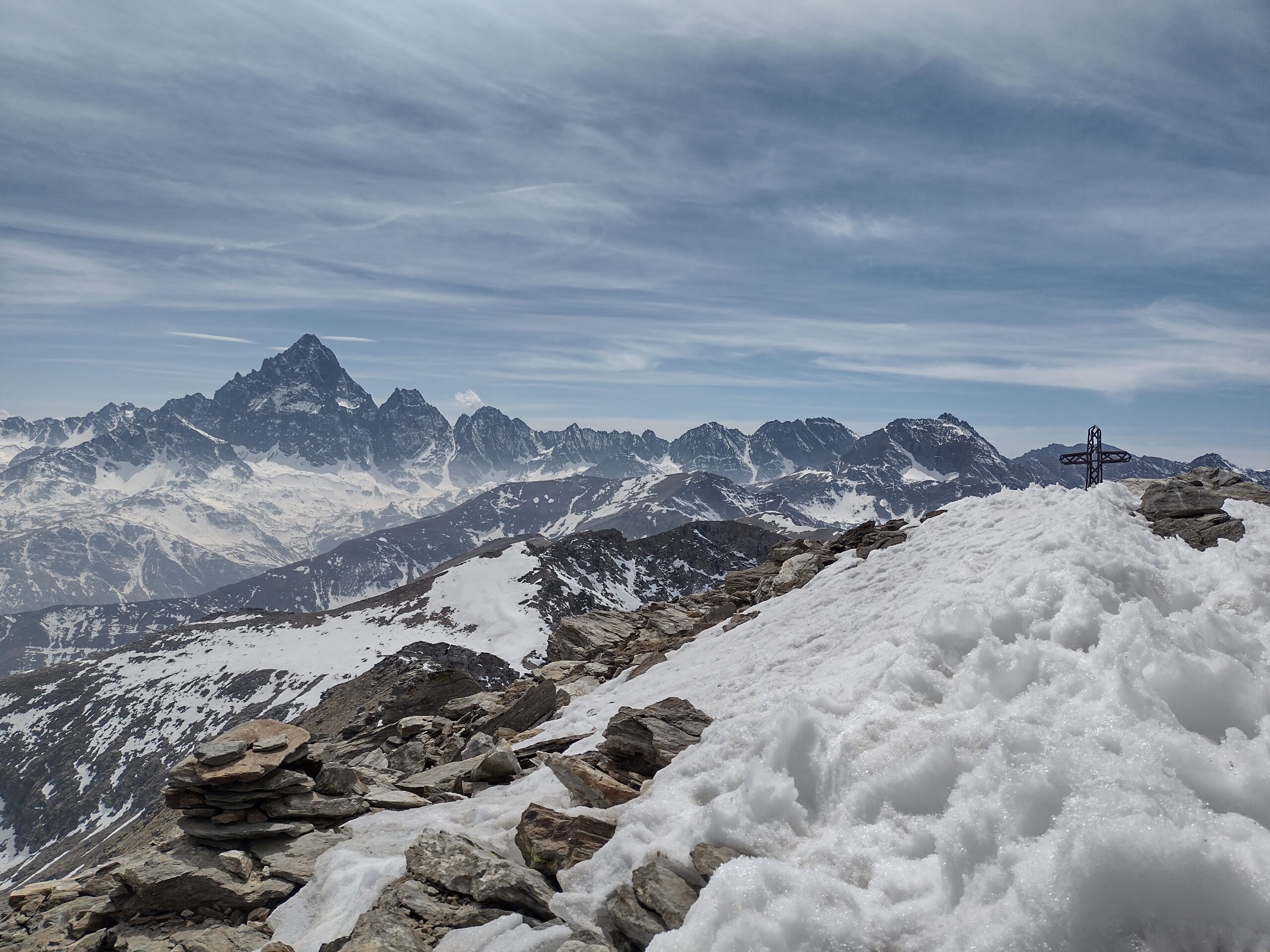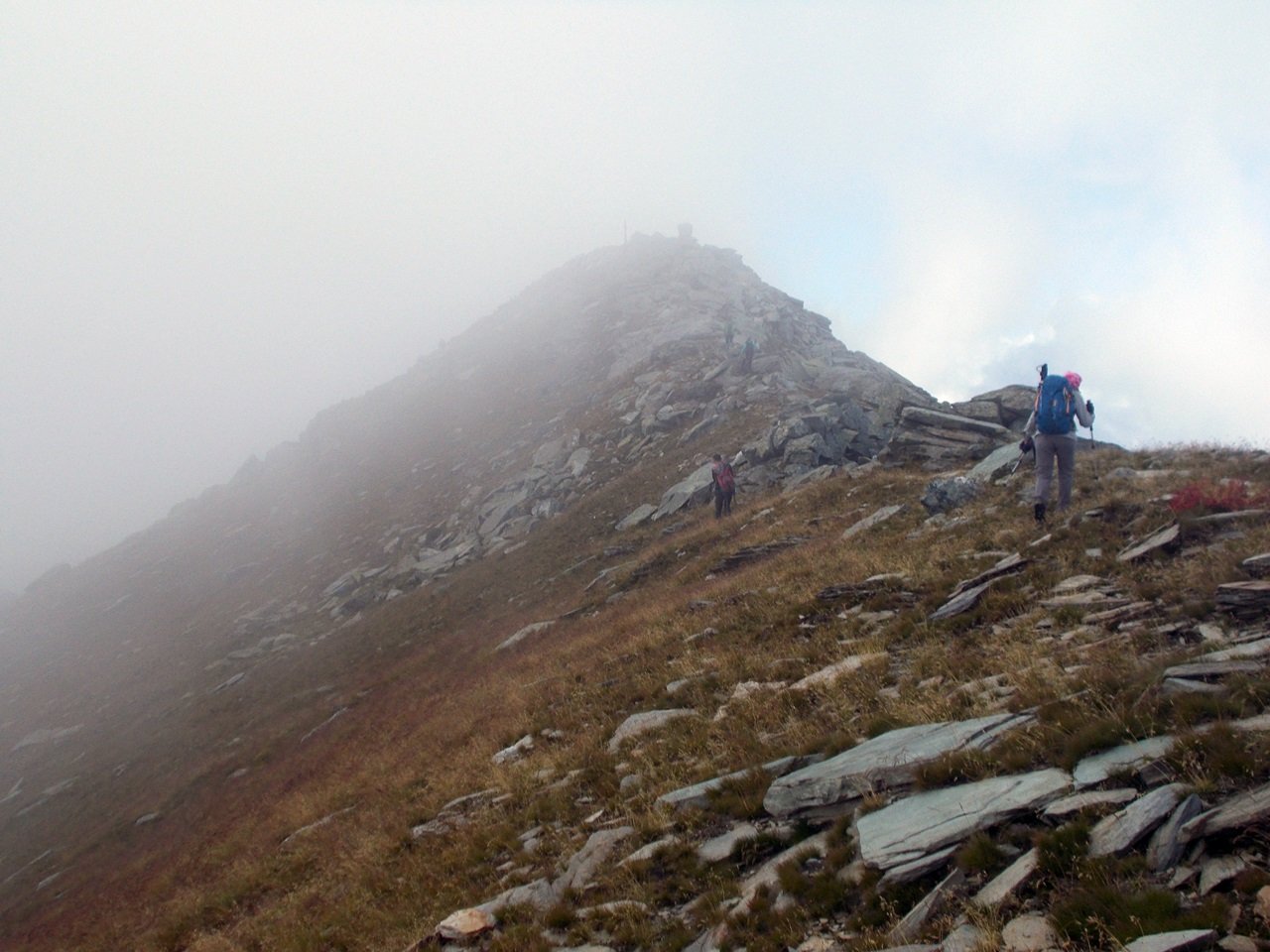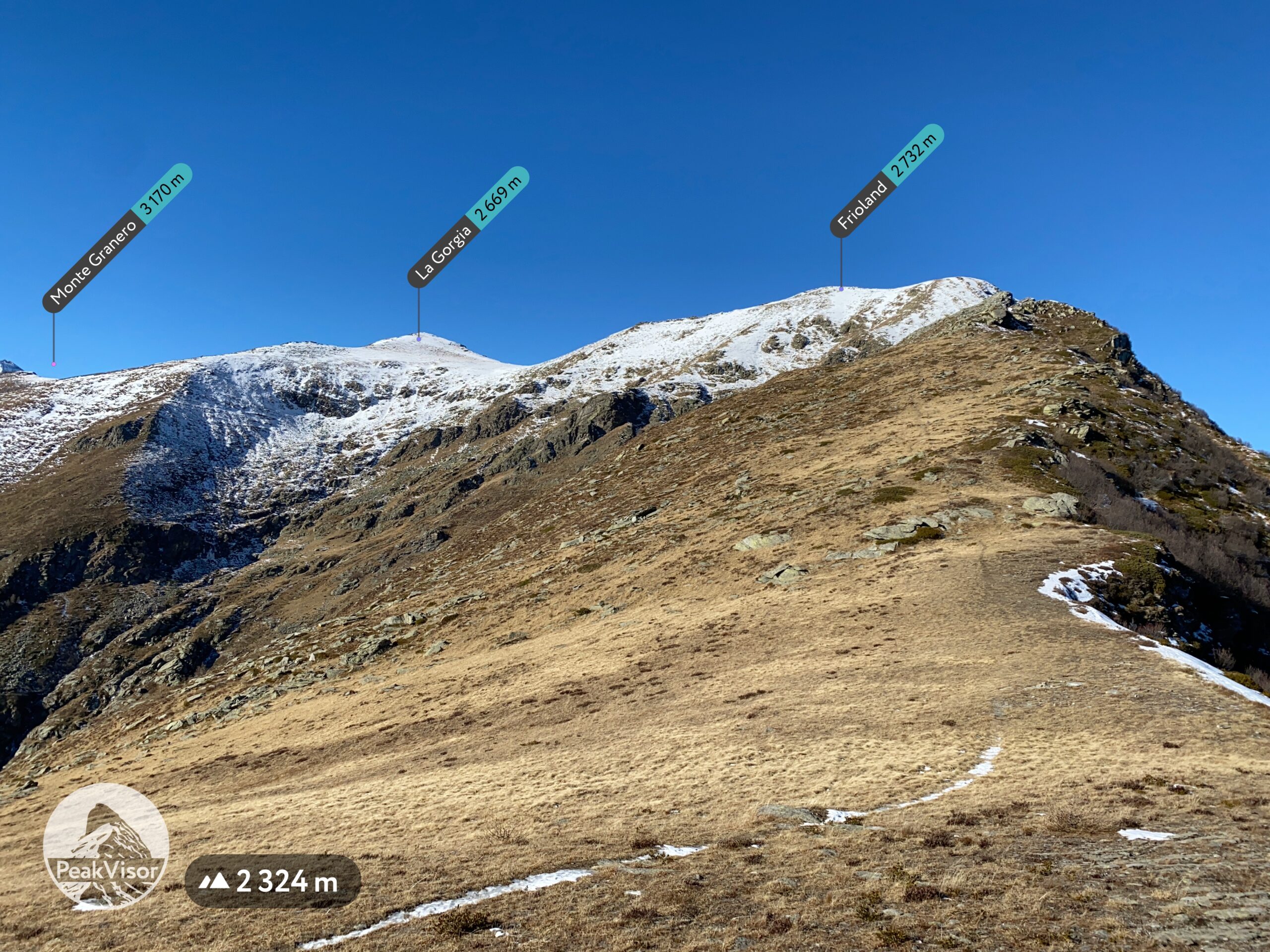 Qui terminano i segnali bianco-rossi recentemente ripristinati. Seguire quindi la traccia che si tiene in cresta o sul versante valle Po e con un ultimo tratto più ripido conduce prima all’anticima 2720 m e quindi per la breve e ampia cresta di blocchi alla vetta del Frioland m 2735 (due croci, grossi ometti e libro di vetta).