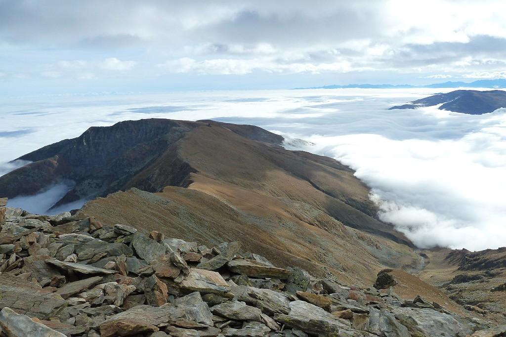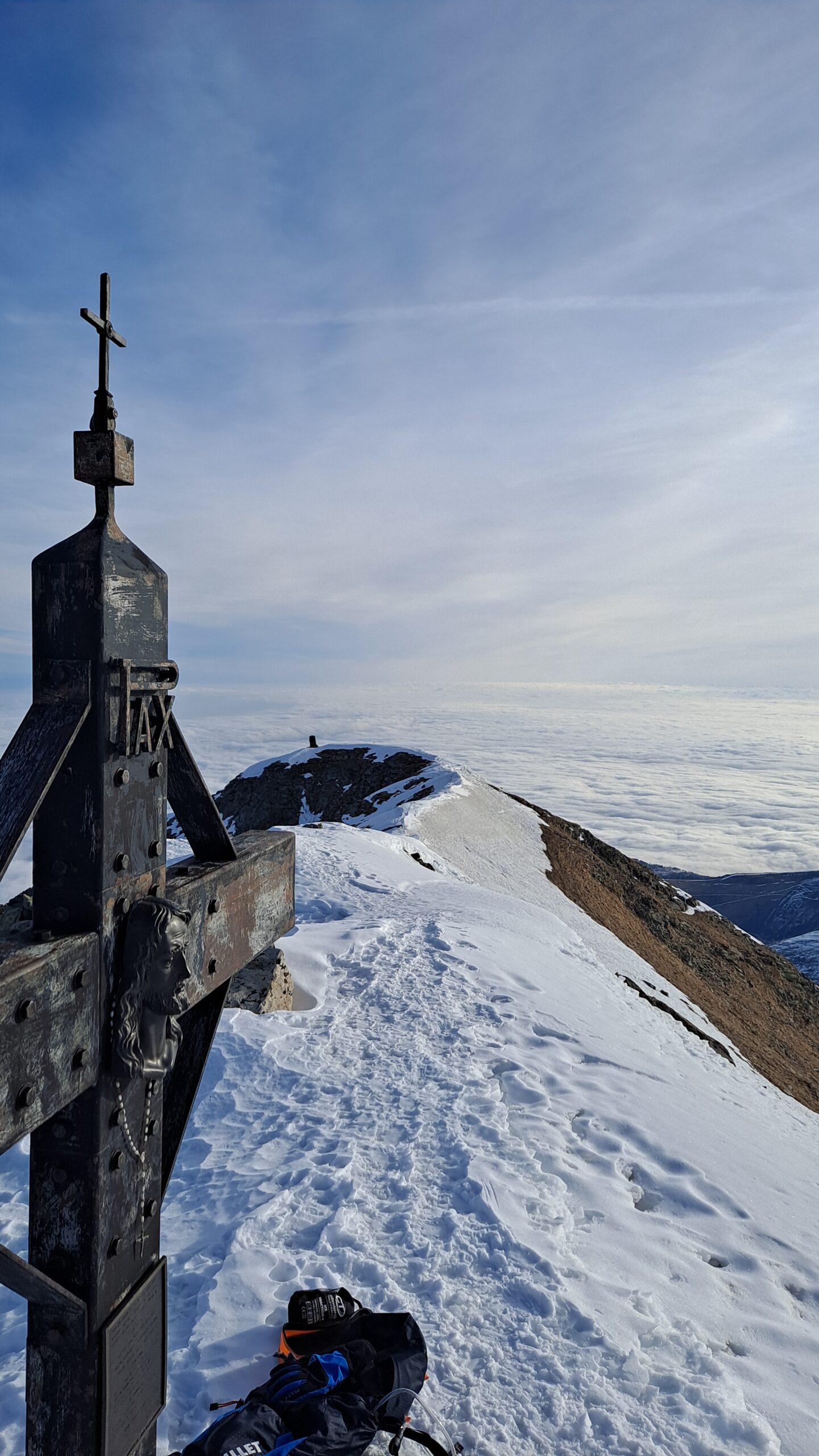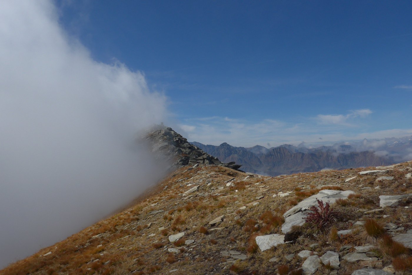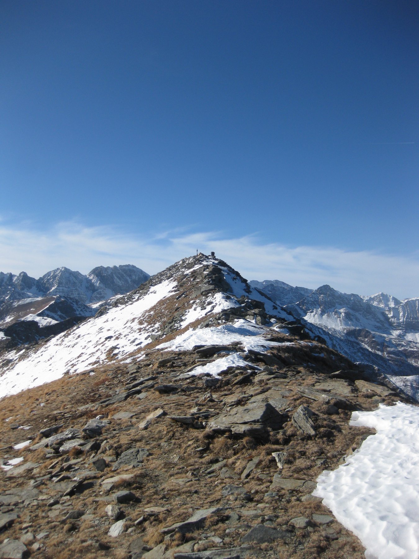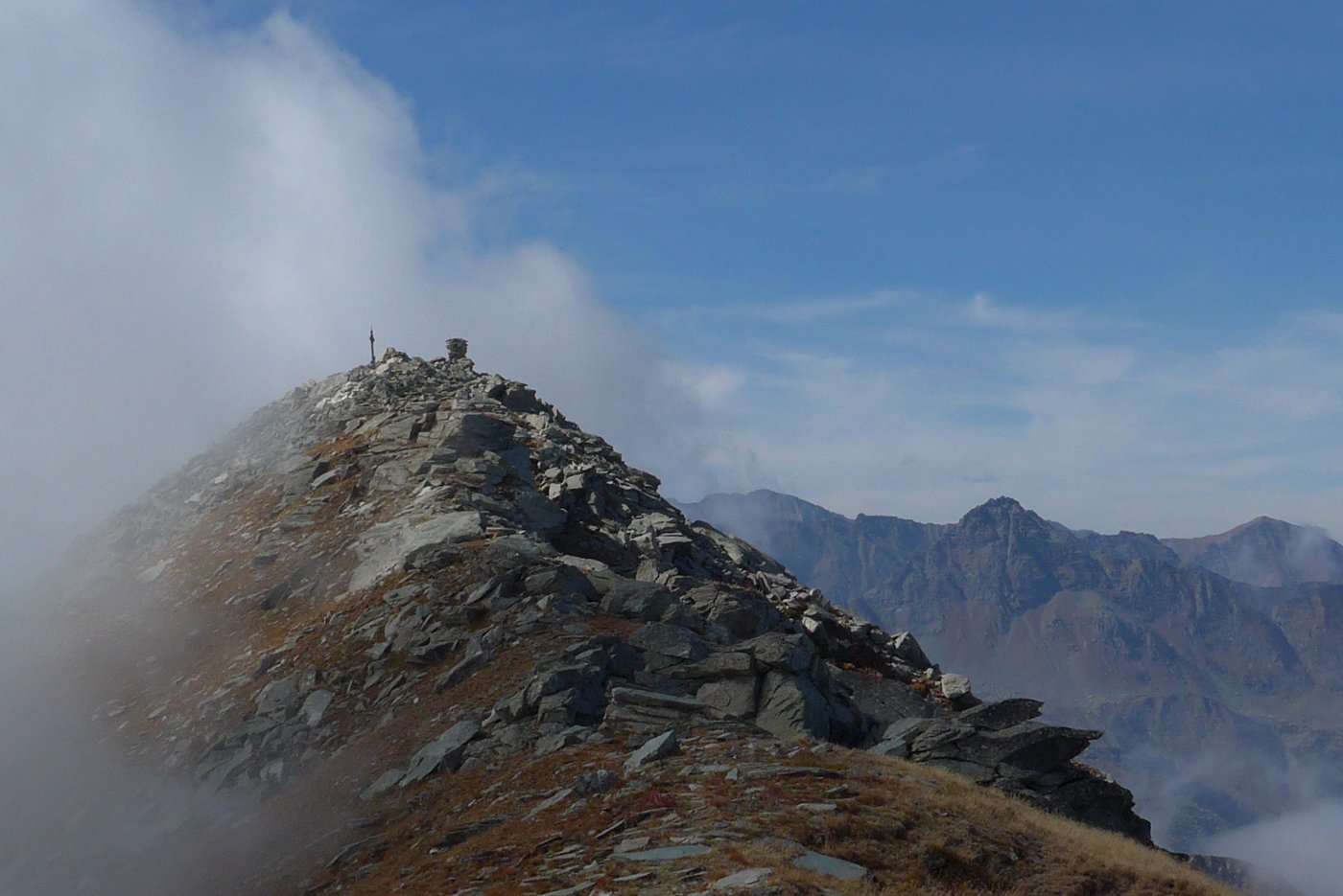 Qui terminano i segnali bianco-rossi recentemente ripristinati. Seguire quindi la traccia che si tiene in cresta o sul versante valle Po e con un ultimo tratto più ripido conduce prima all’anticima 2720 m e quindi per la breve e ampia cresta di blocchi alla vetta del Frioland m 2735 (due croci, grossi ometti e libro di vetta).