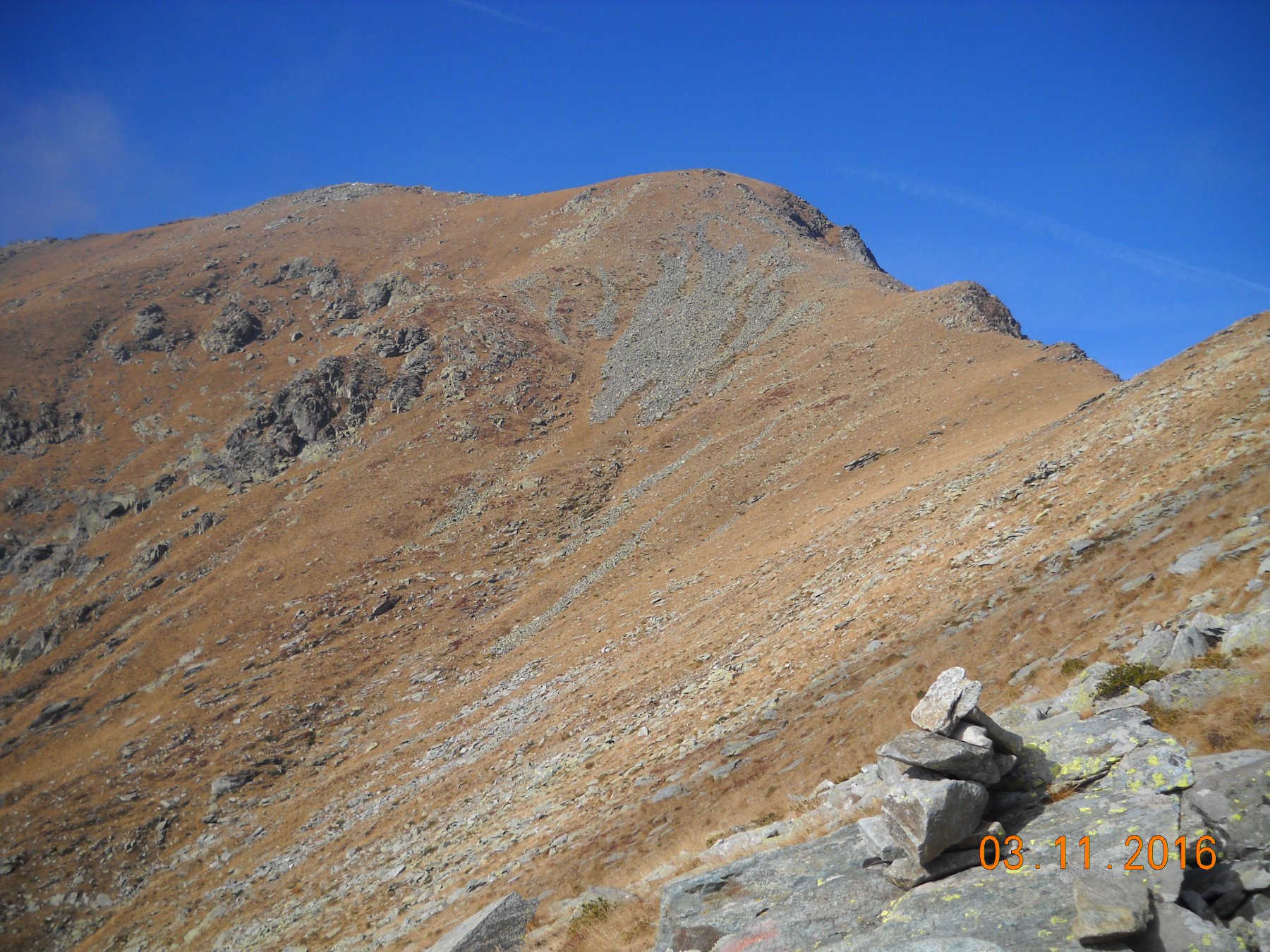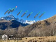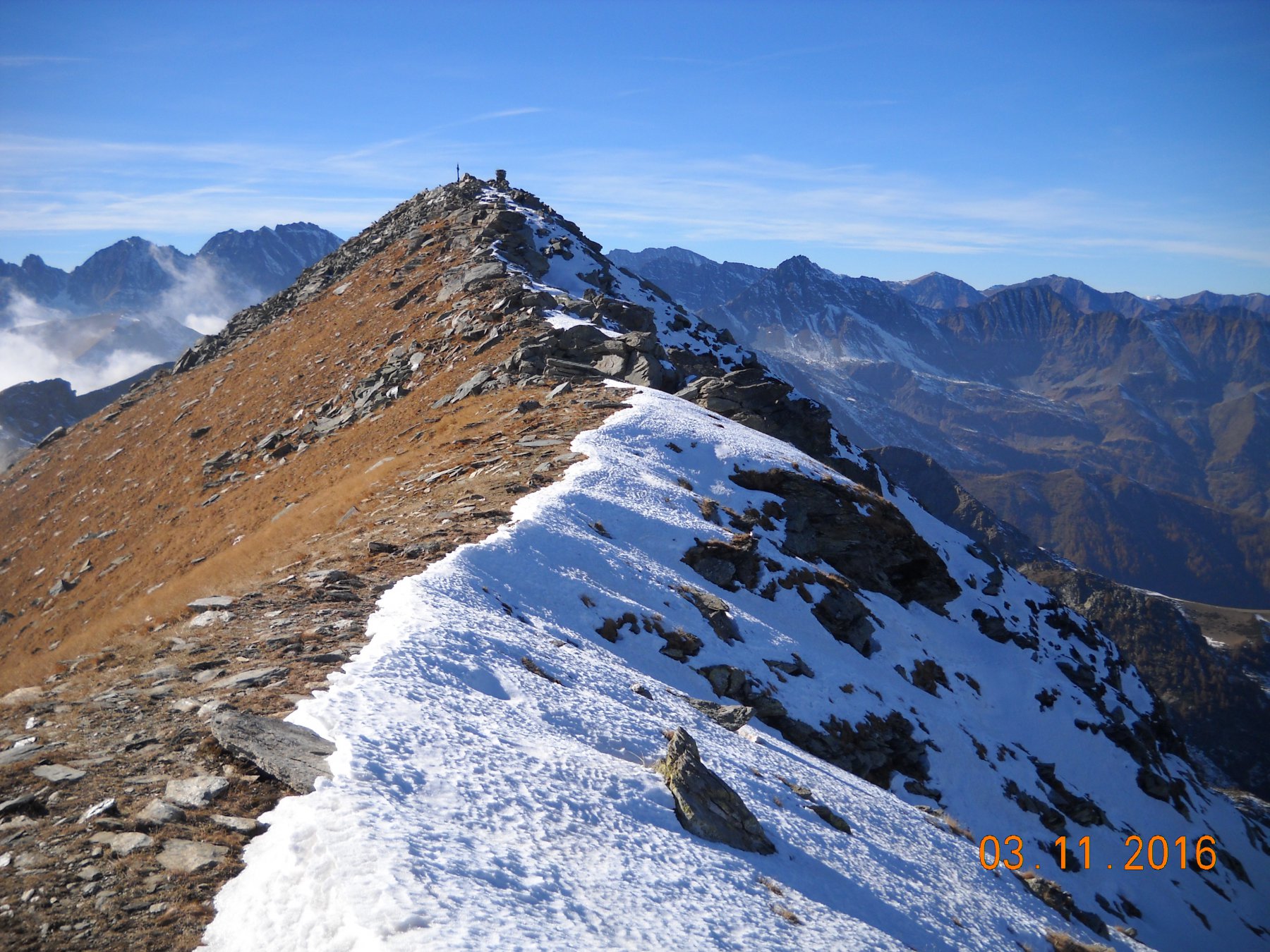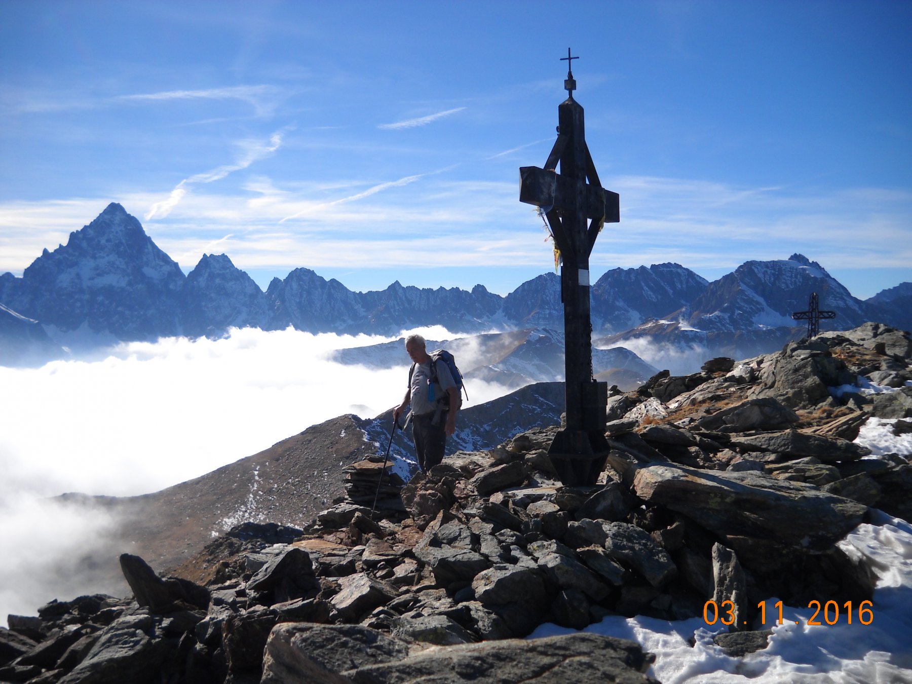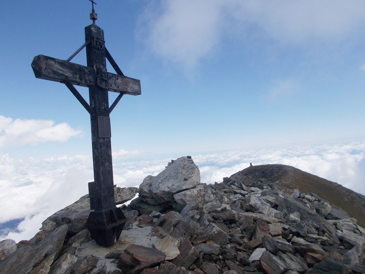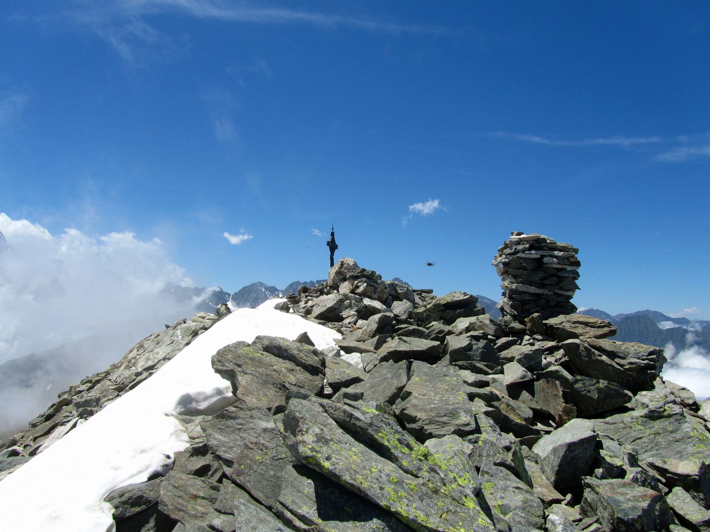 Qui terminano i segnali bianco-rossi recentemente ripristinati. Seguire quindi la traccia che si tiene in cresta o sul versante valle Po e con un ultimo tratto più ripido conduce prima all’anticima 2720 m e quindi per la breve e ampia cresta di blocchi alla vetta del Frioland m 2735 (due croci, grossi ometti e libro di vetta).