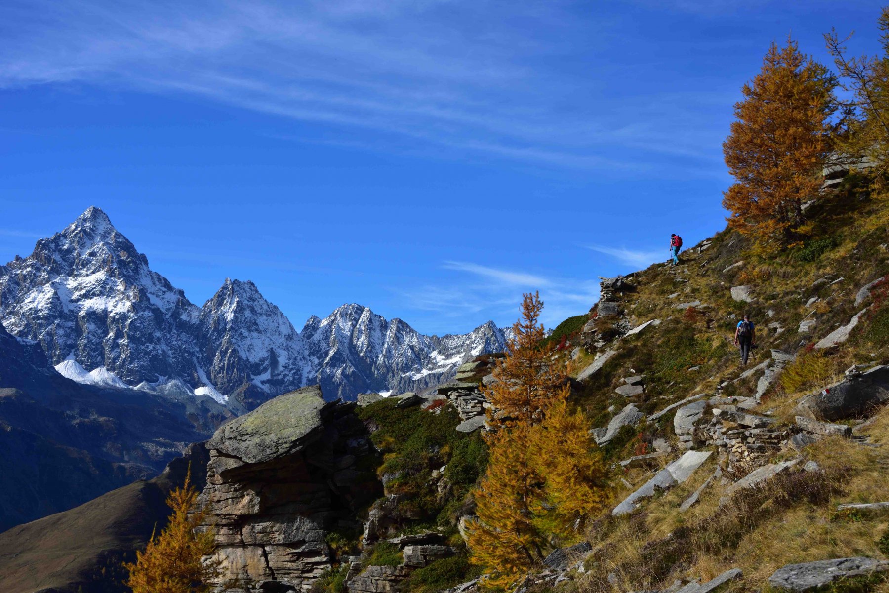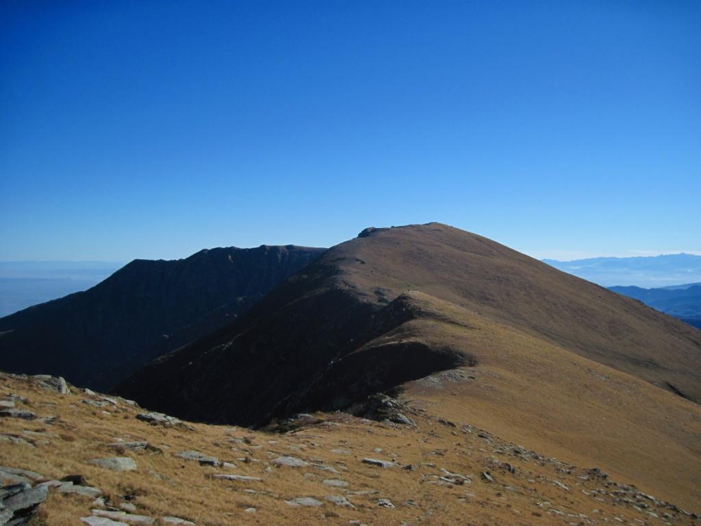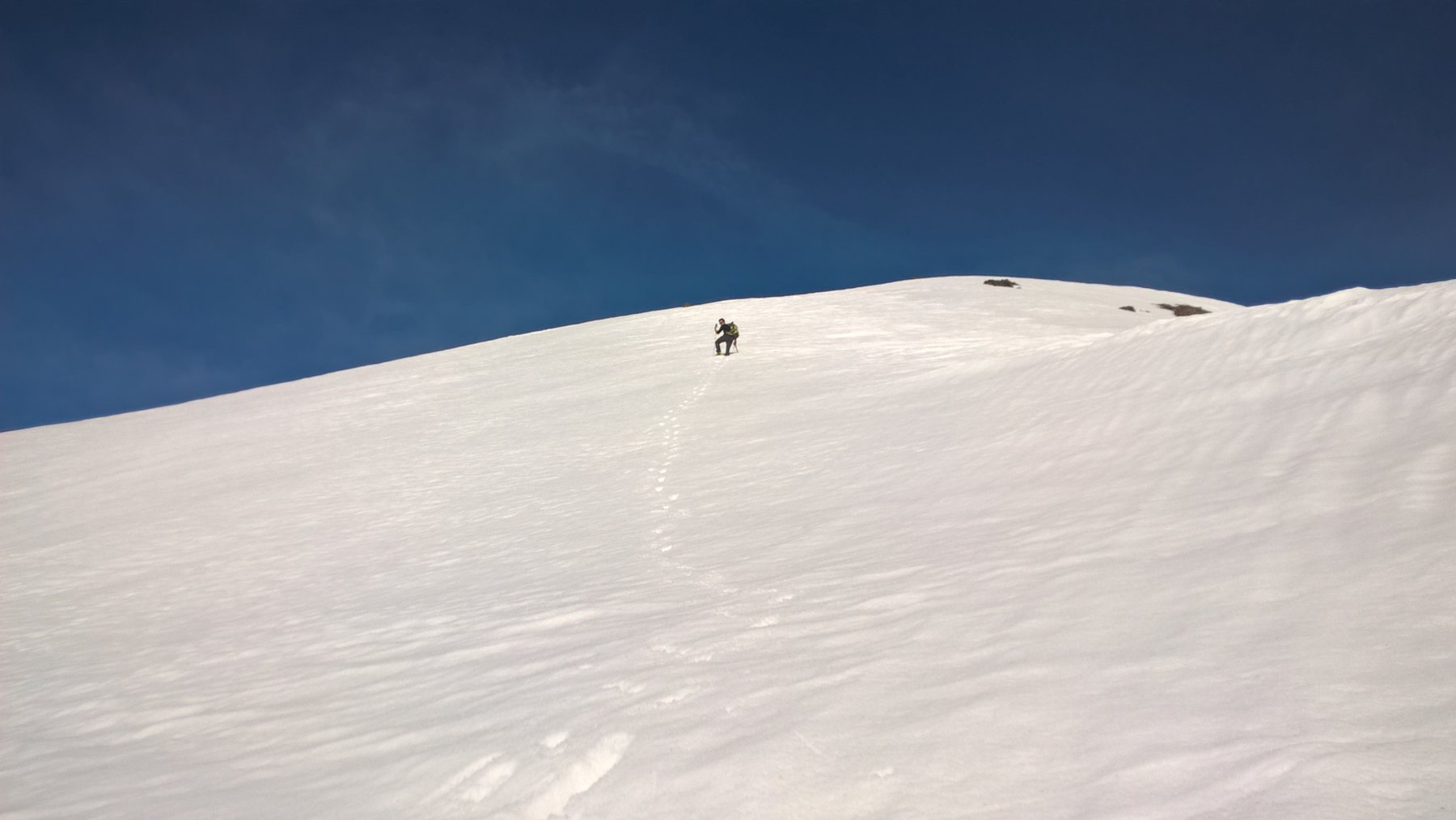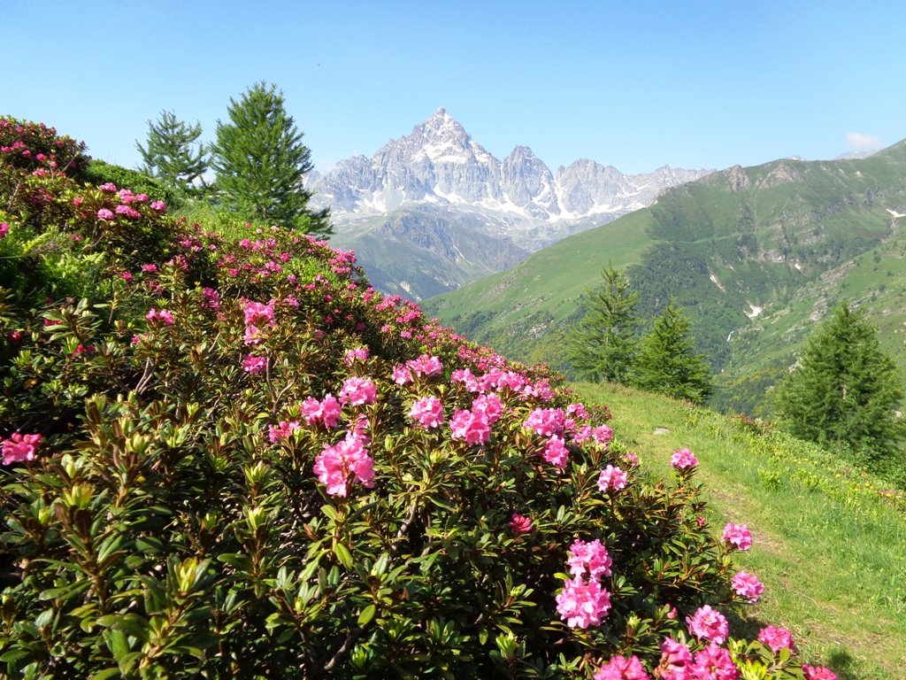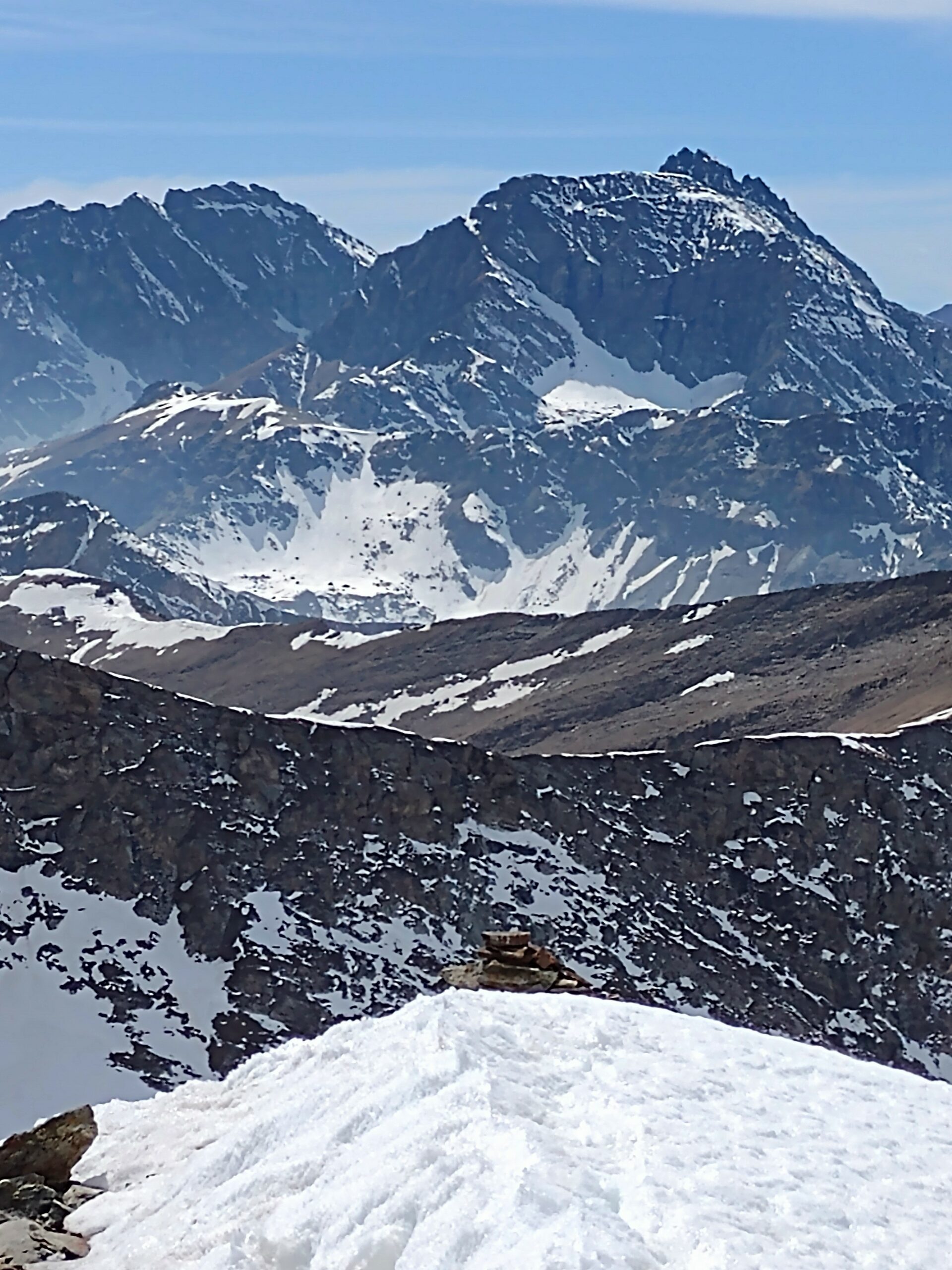 Qui terminano i segnali bianco-rossi recentemente ripristinati. Seguire quindi la traccia che si tiene in cresta o sul versante valle Po e con un ultimo tratto più ripido conduce prima all’anticima 2720 m e quindi per la breve e ampia cresta di blocchi alla vetta del Frioland m 2735 (due croci, grossi ometti e libro di vetta).