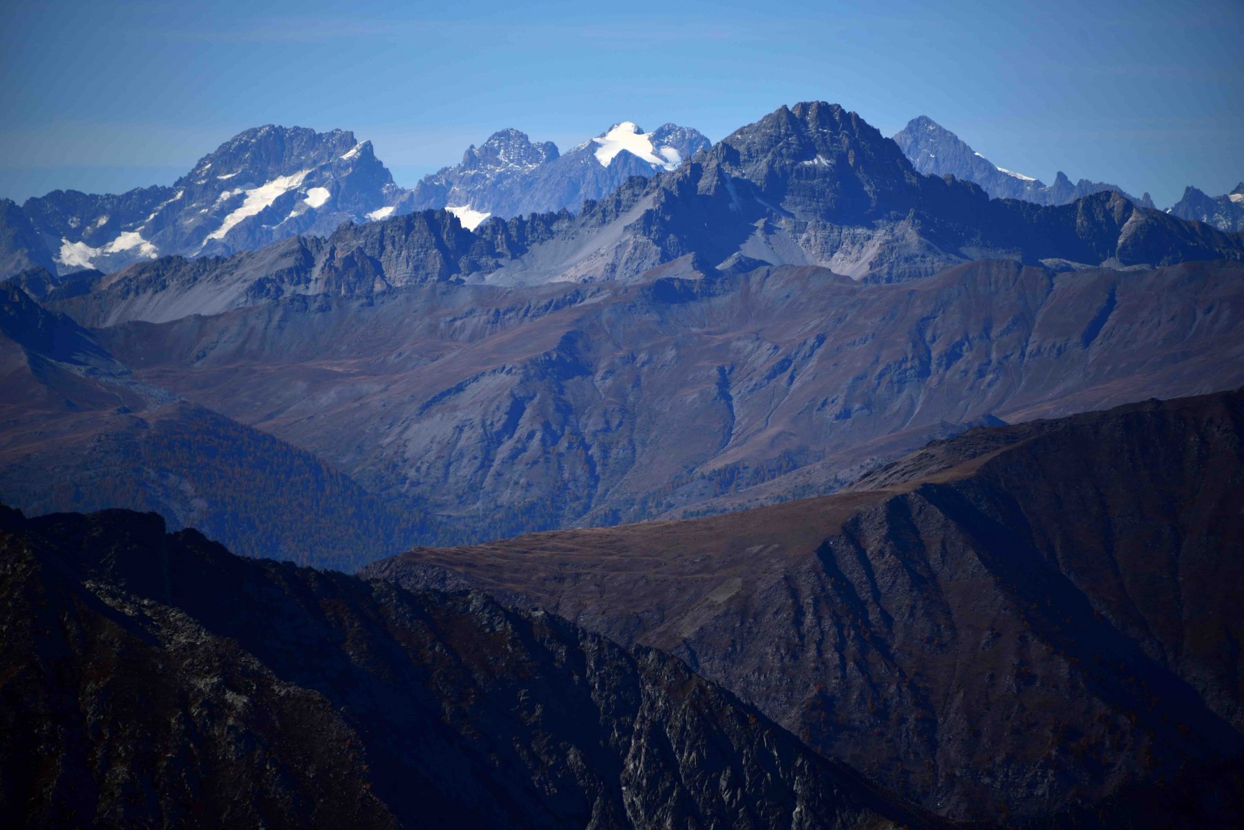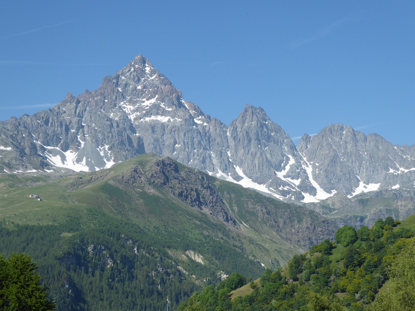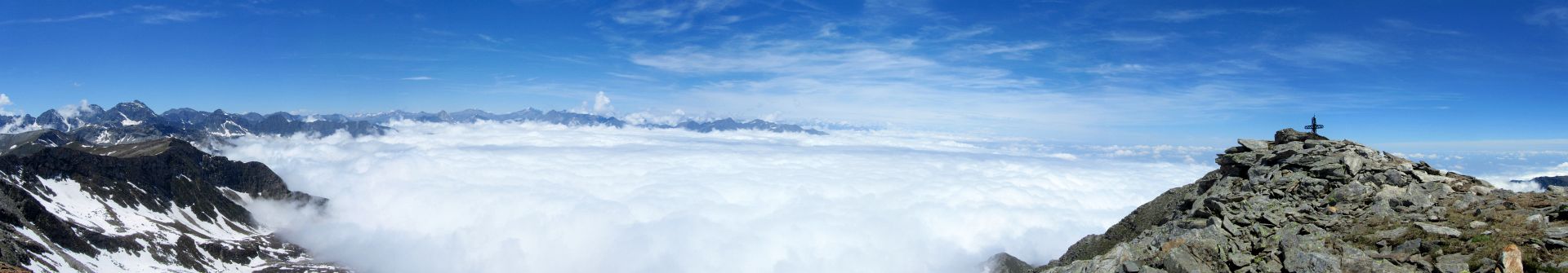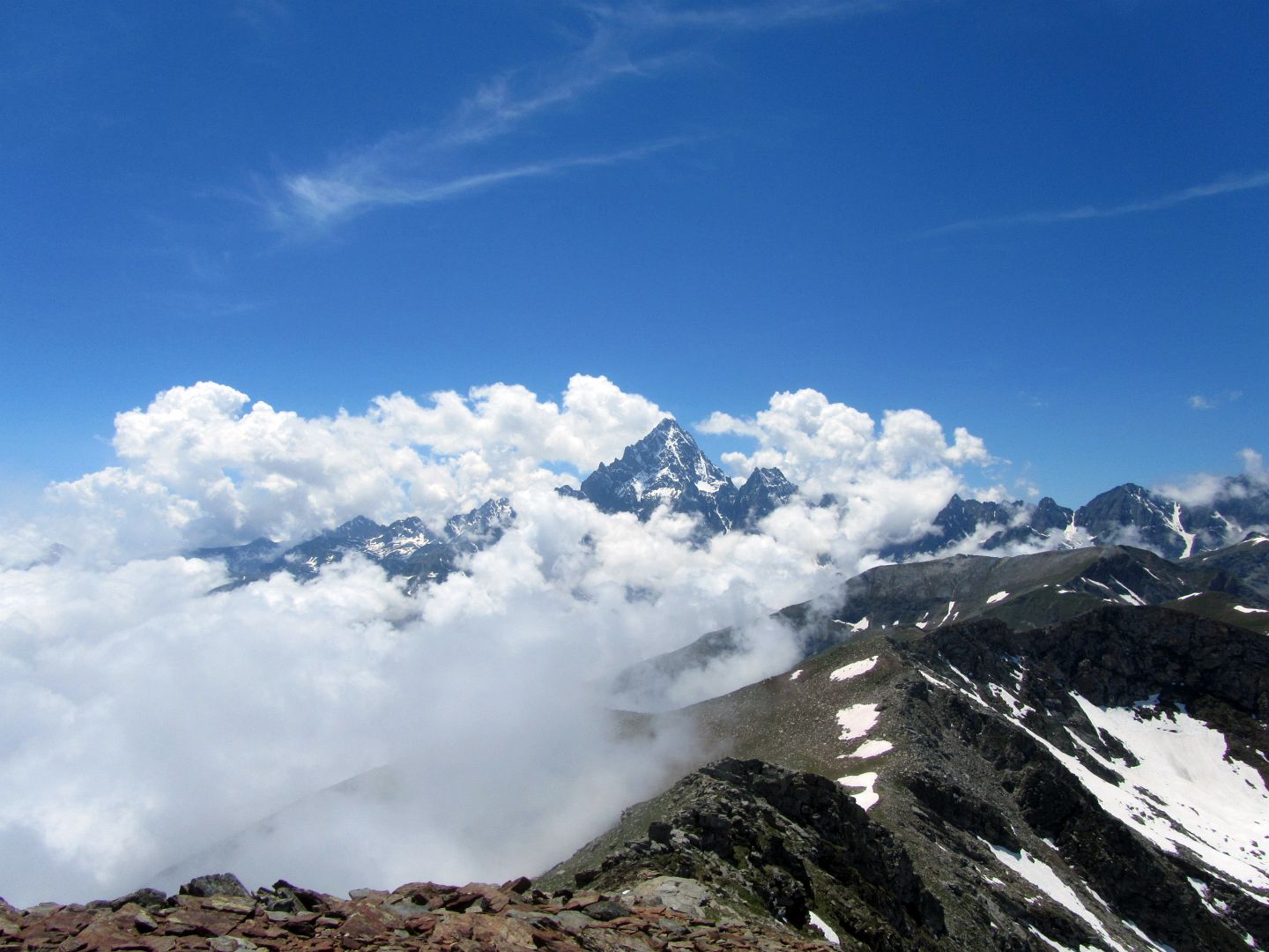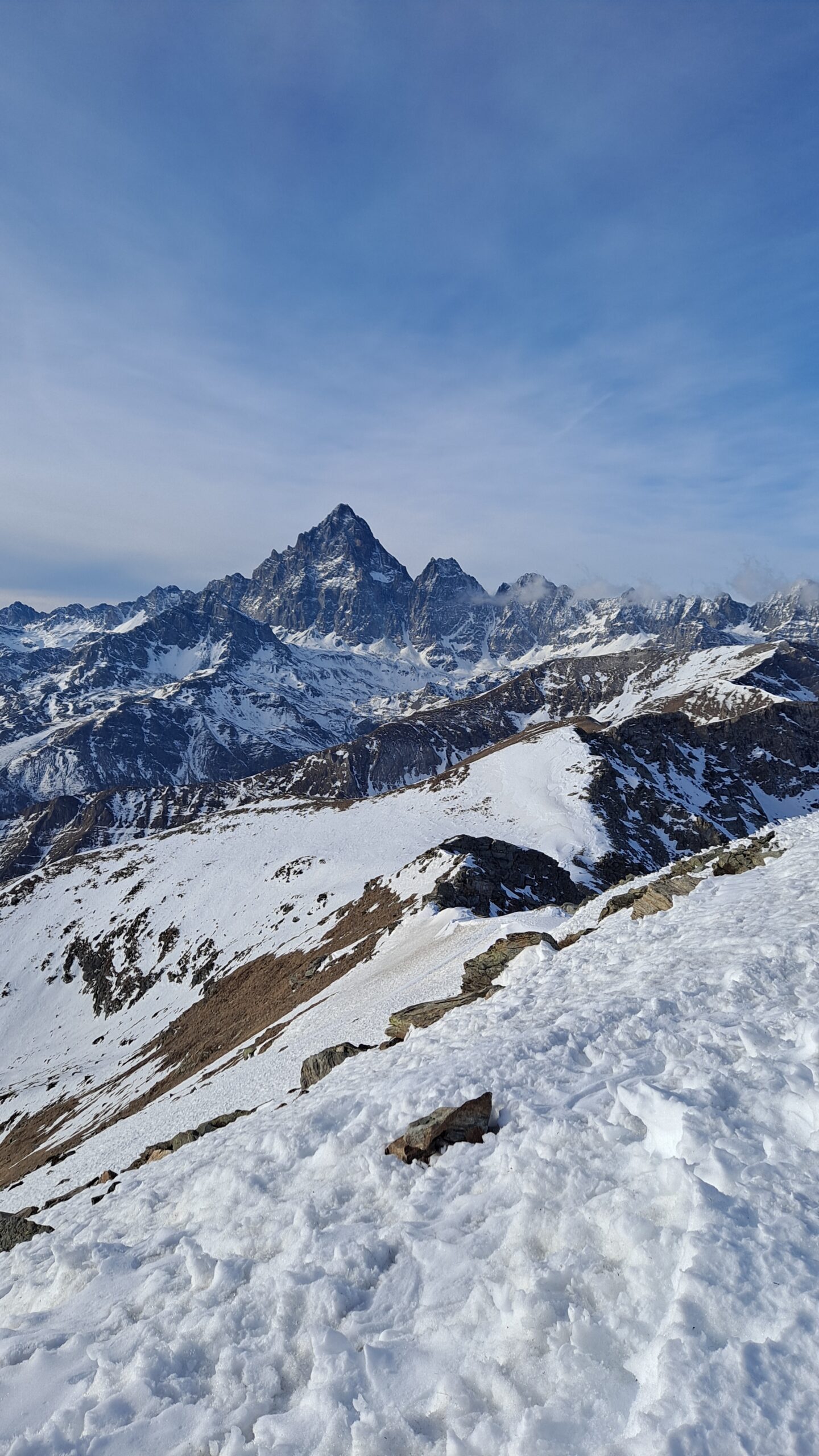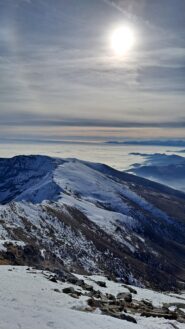 Dalla vetta spettacolare veduta della parete nord del Monviso. Nelle giornate terse il panorama si estende fino agli Appennini da una parte e fino al Monte Rosa e al Gran Paradiso (e oltre) dall'altra.