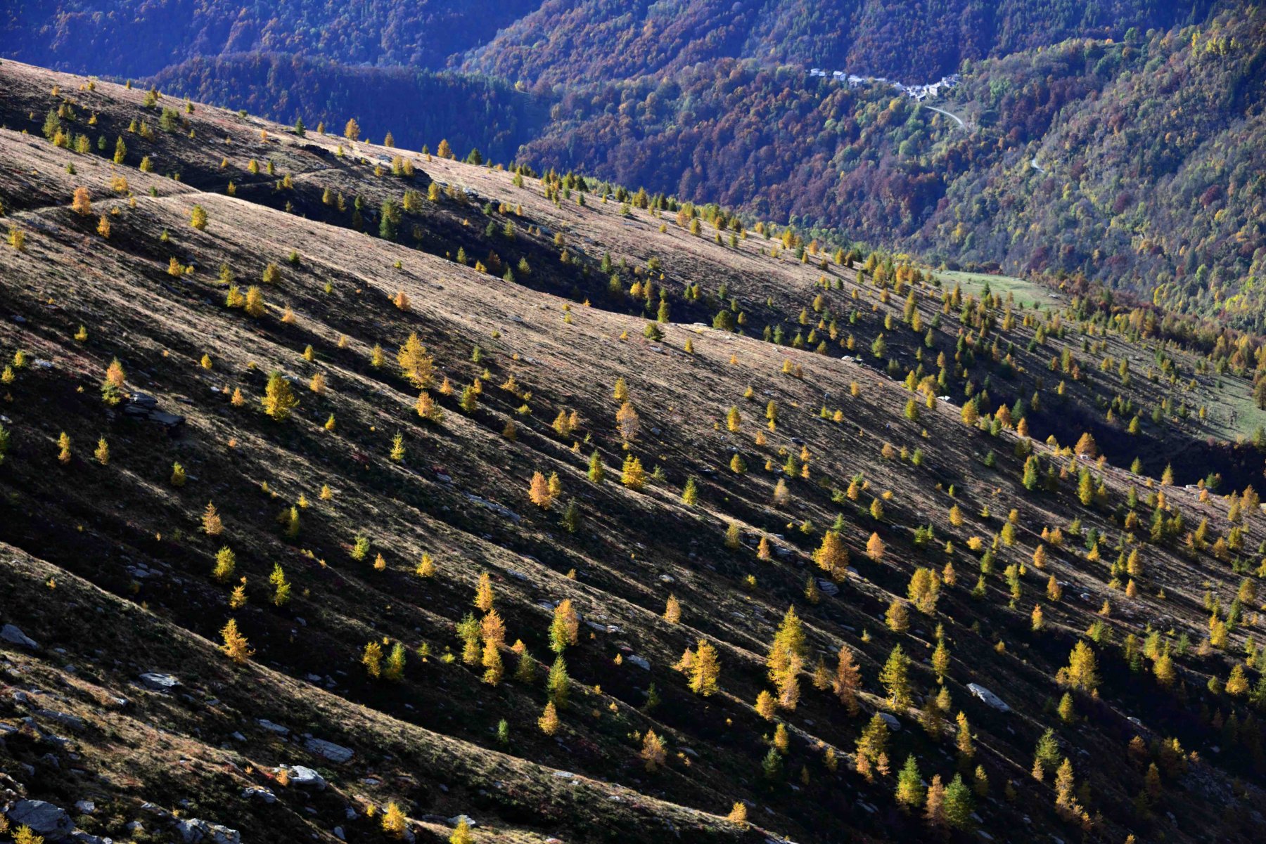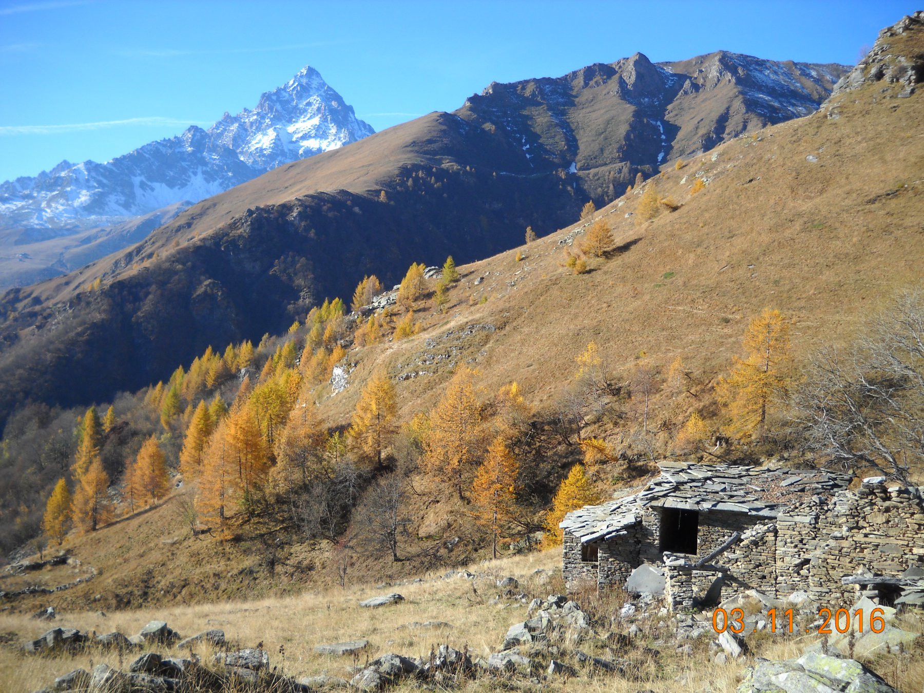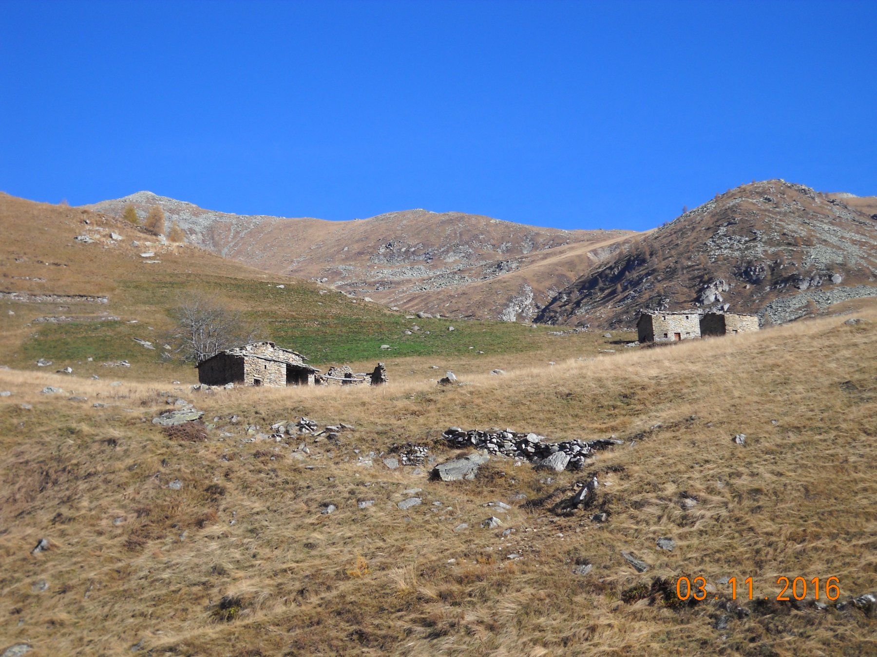 Parcheggiata l’auto si raggiunge la pista agro-pastorale sterrata a monte del paese e la si percorre, incontrando quasi subito una malga con bestiame. I segnavia tagliano la poderale e seguono l’antica mulattiera sempre visibile per prati e boschetti. In seguito il sentiero piega a destra, supera un torrente con cascatella, raggiunge due baite e compie un giro da destra a sinistra risalendo lungo il torrente.