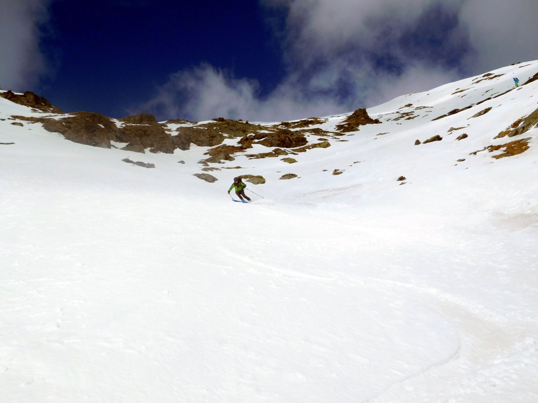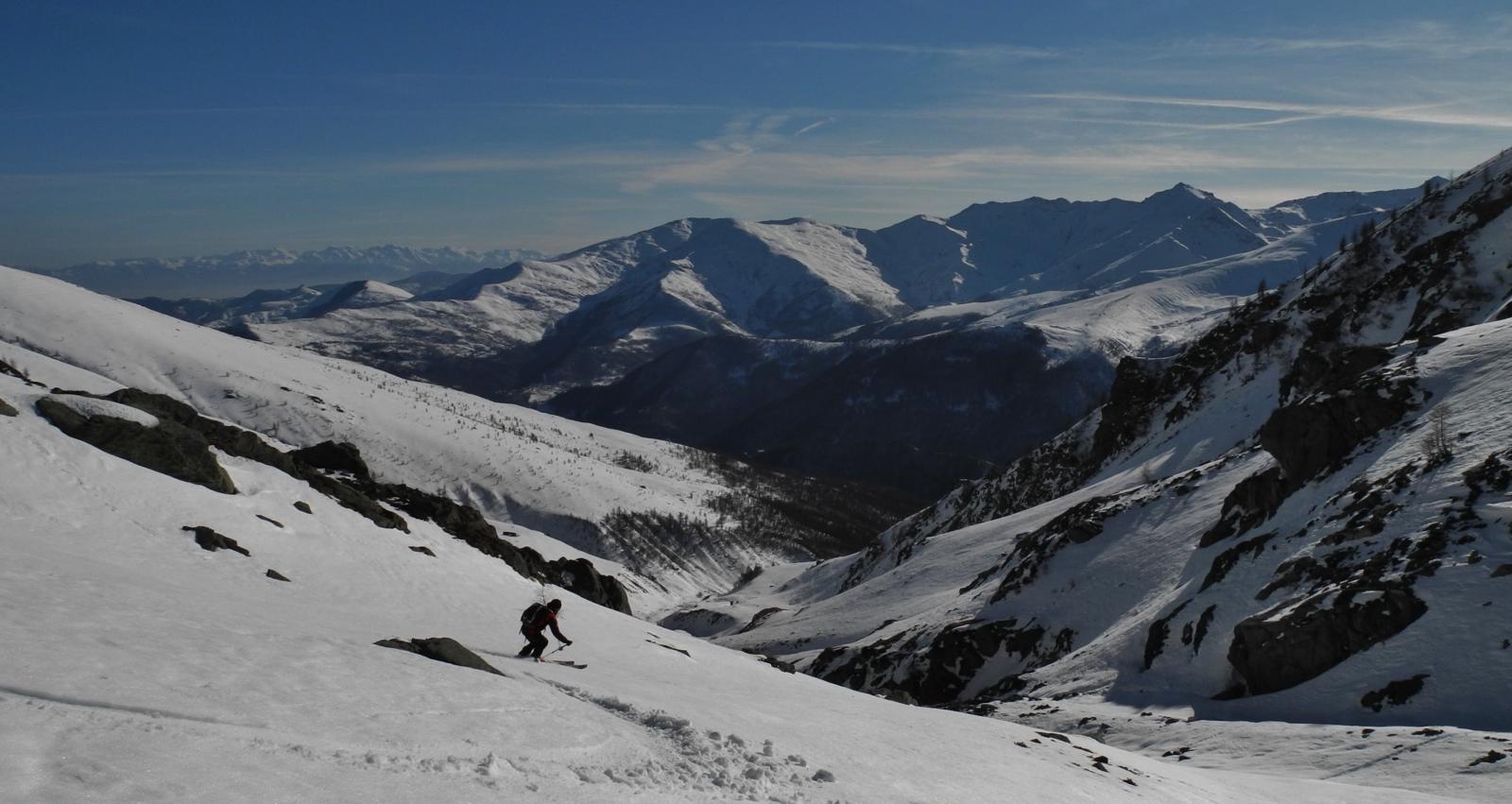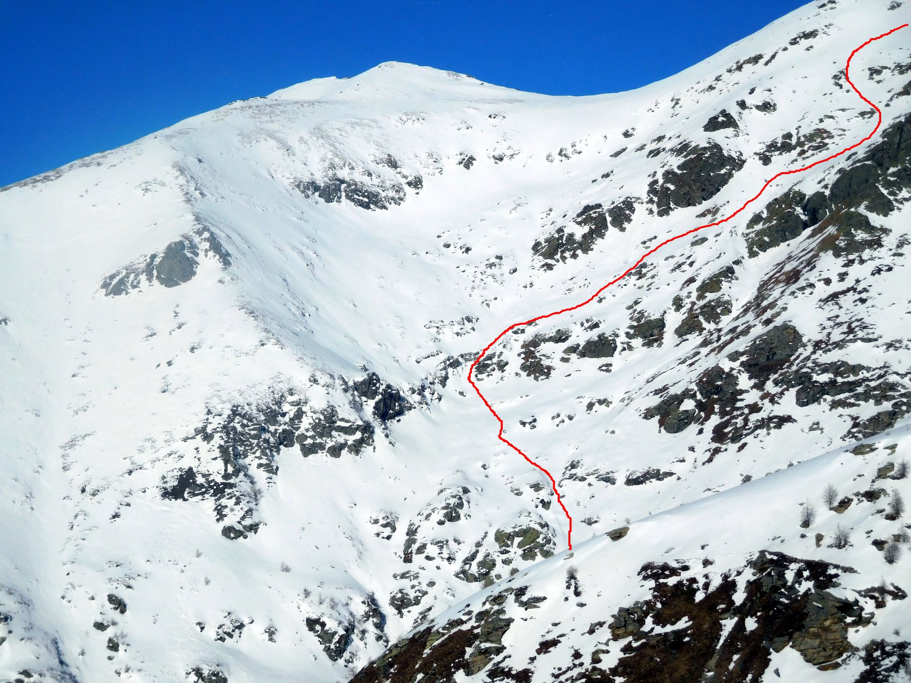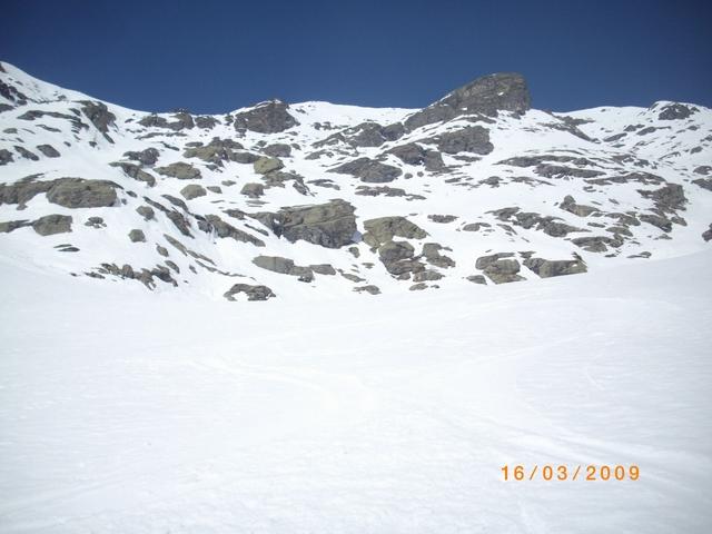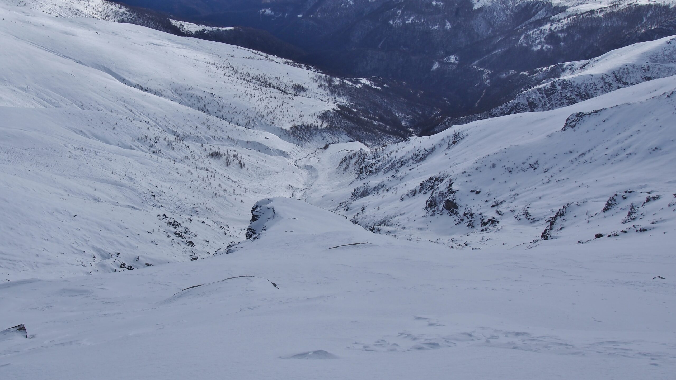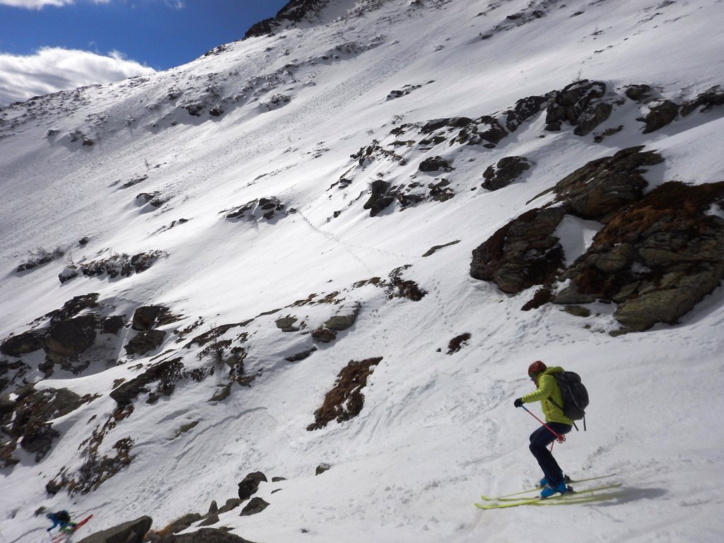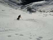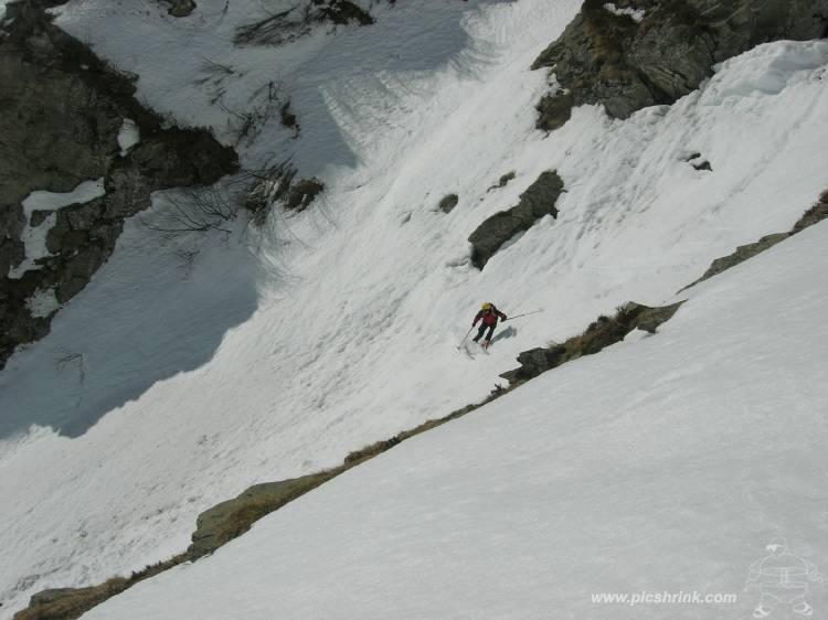 In discesa si evita la prima grande e alta barra rocciosa sulla destra, per poi rientrare a sx. e destreggiandosi tra altre barre e pendii di raccordo senza percorso obbligato si giunge agevolmente al conoide terminale, e con bellissima sciata sin sotto alle Meire Compercie, e da quì sino al ponte di q. 1477