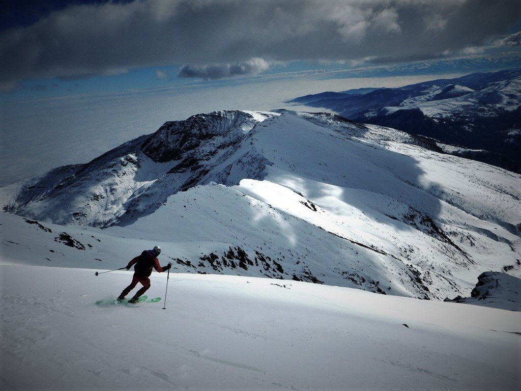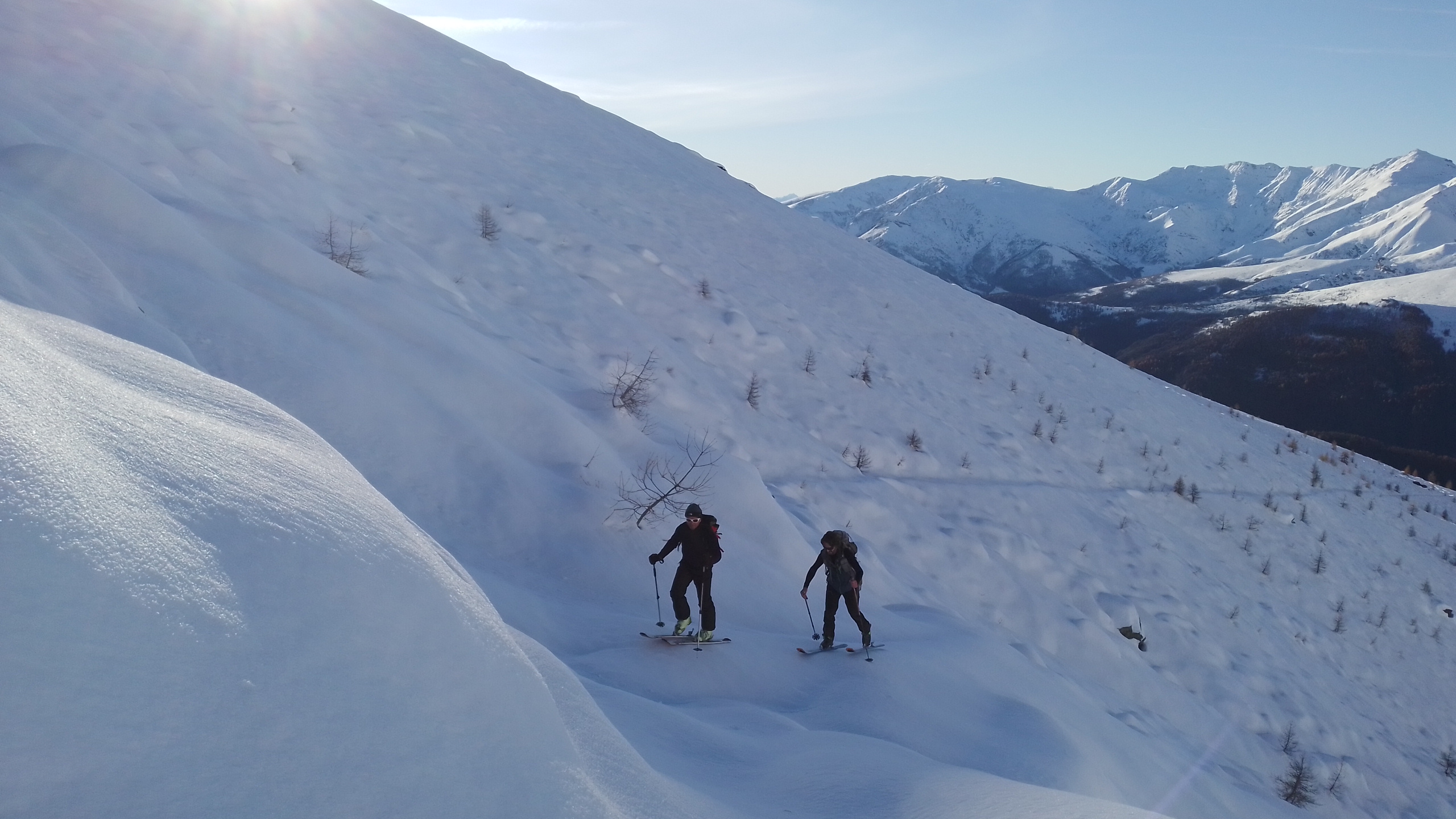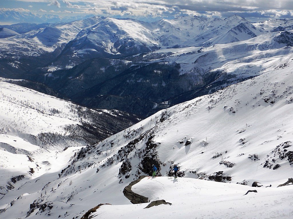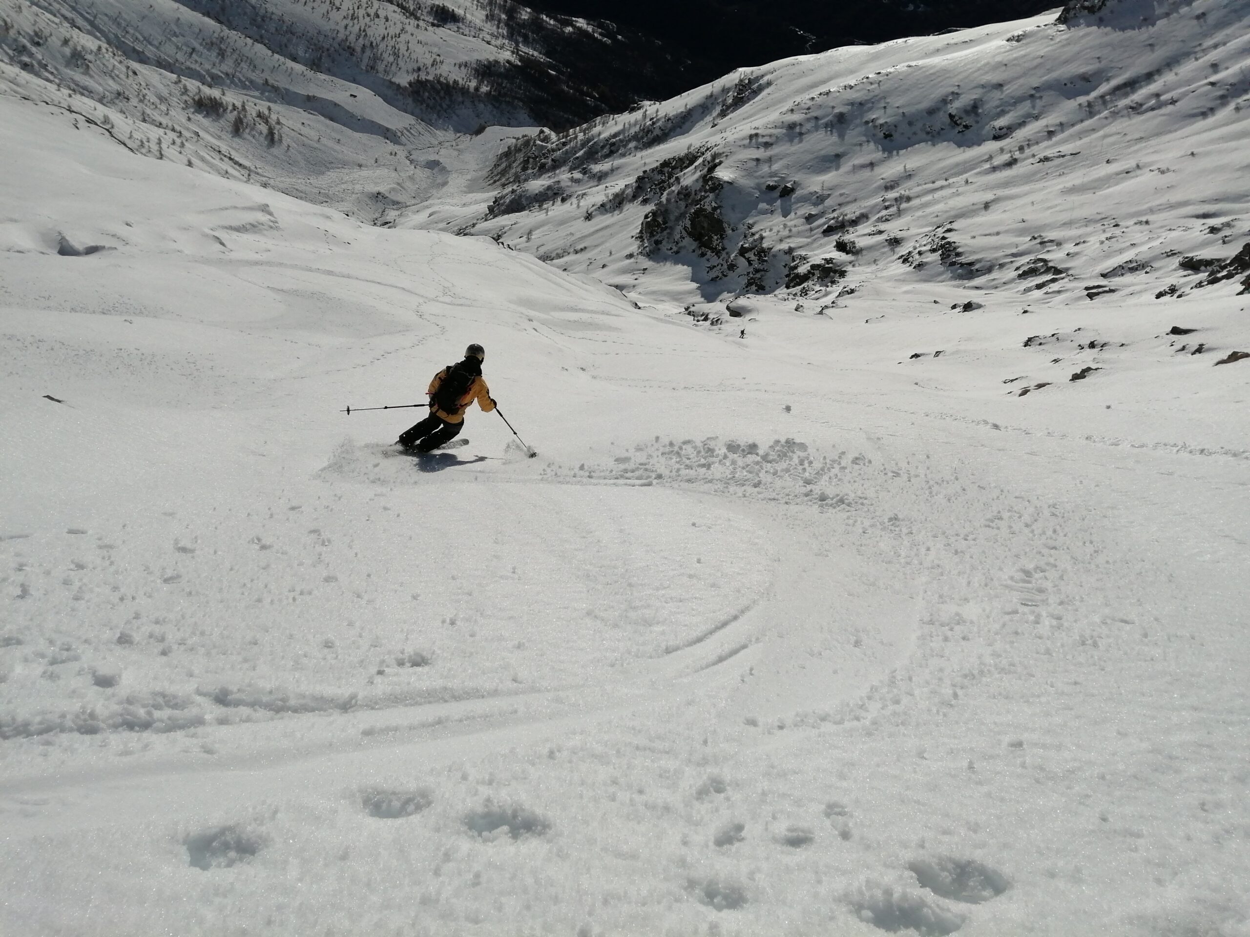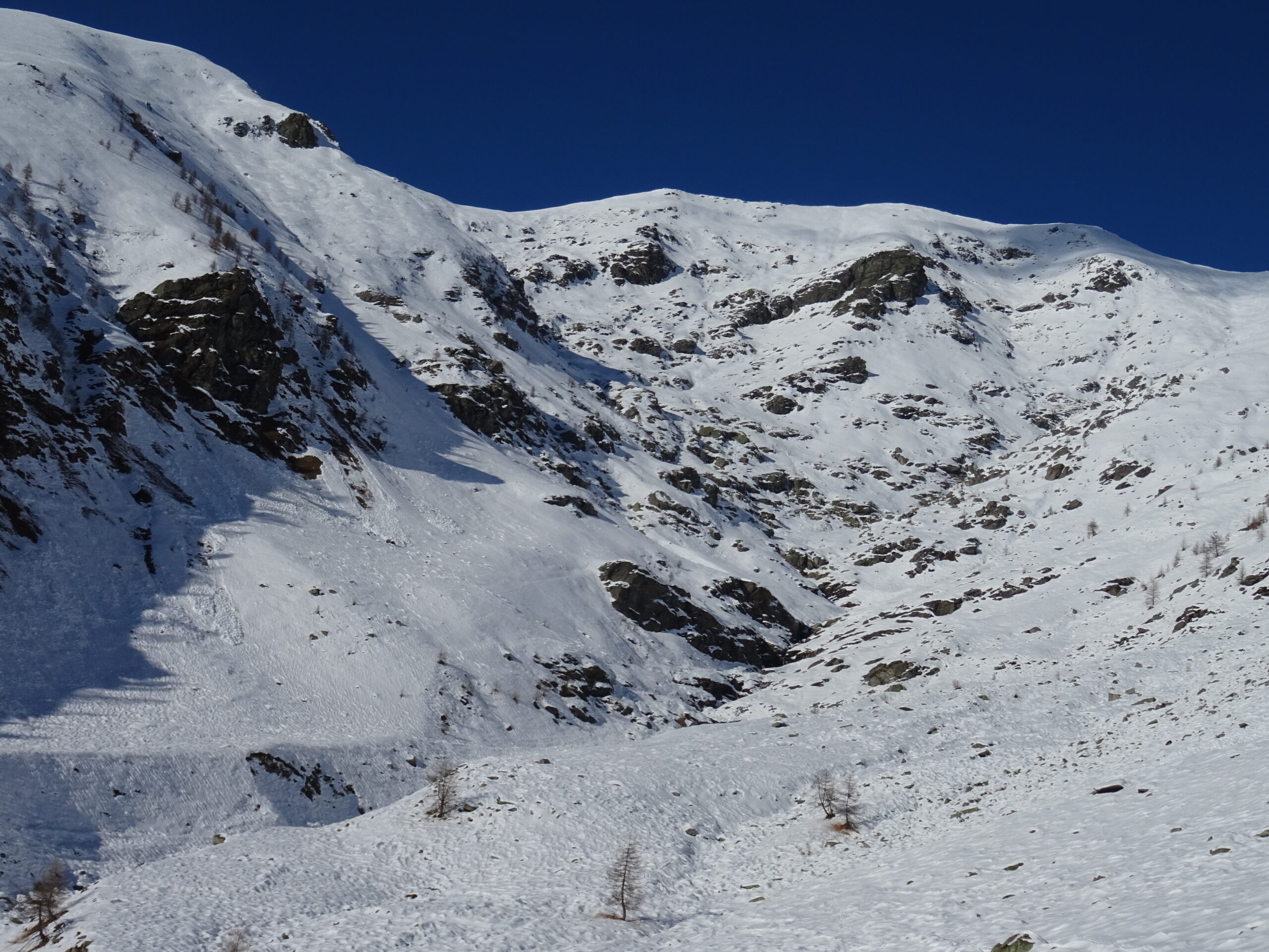 In discesa si evita la prima grande e alta barra rocciosa sulla destra, per poi rientrare a sx. e destreggiandosi tra altre barre e pendii di raccordo senza percorso obbligato si giunge agevolmente al conoide terminale, e con bellissima sciata sin sotto alle Meire Compercie, e da quì sino al ponte di q. 1477