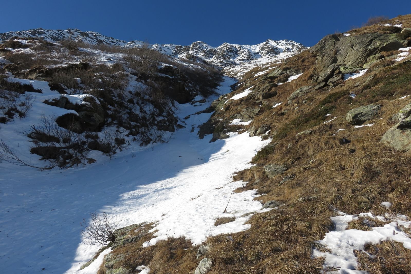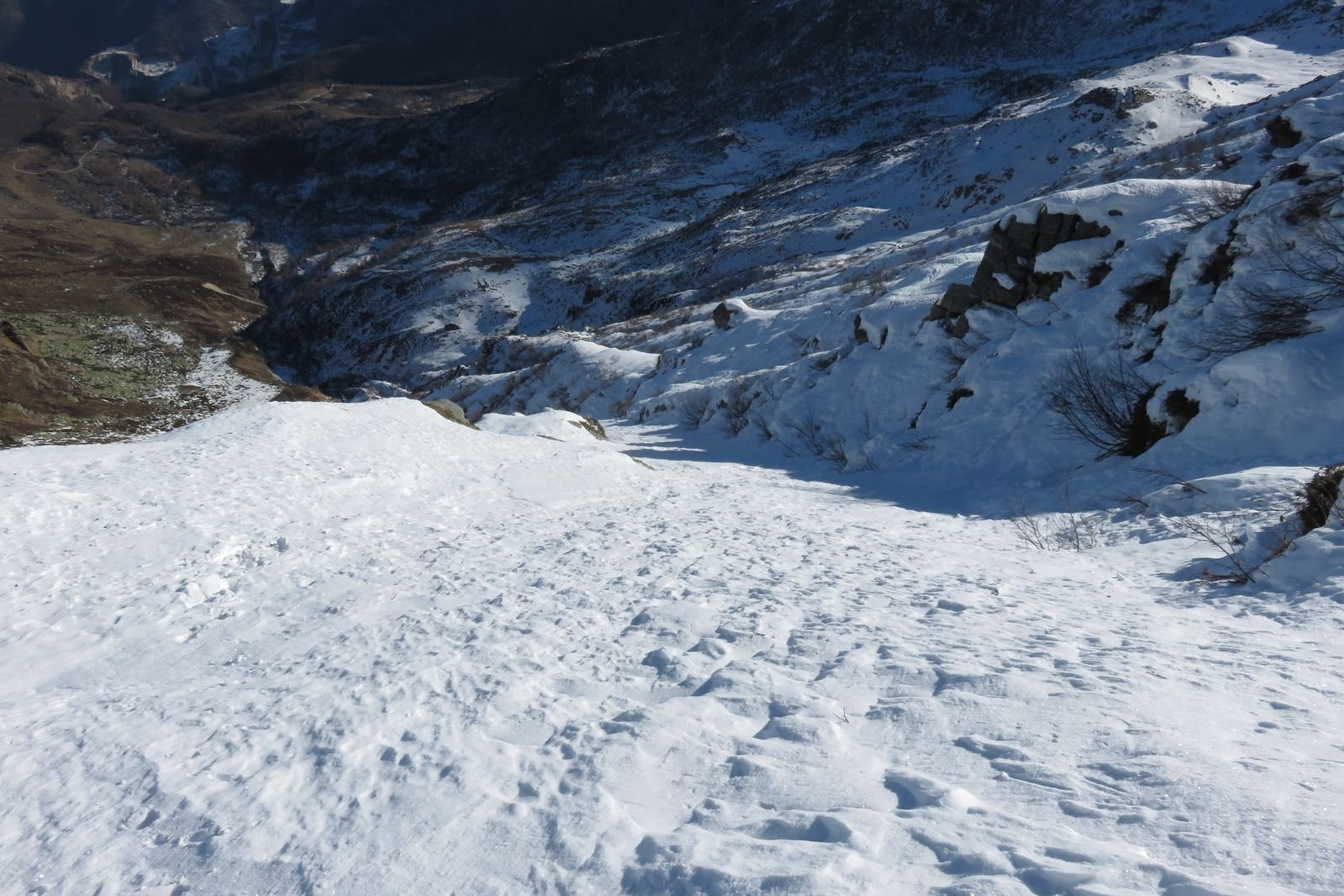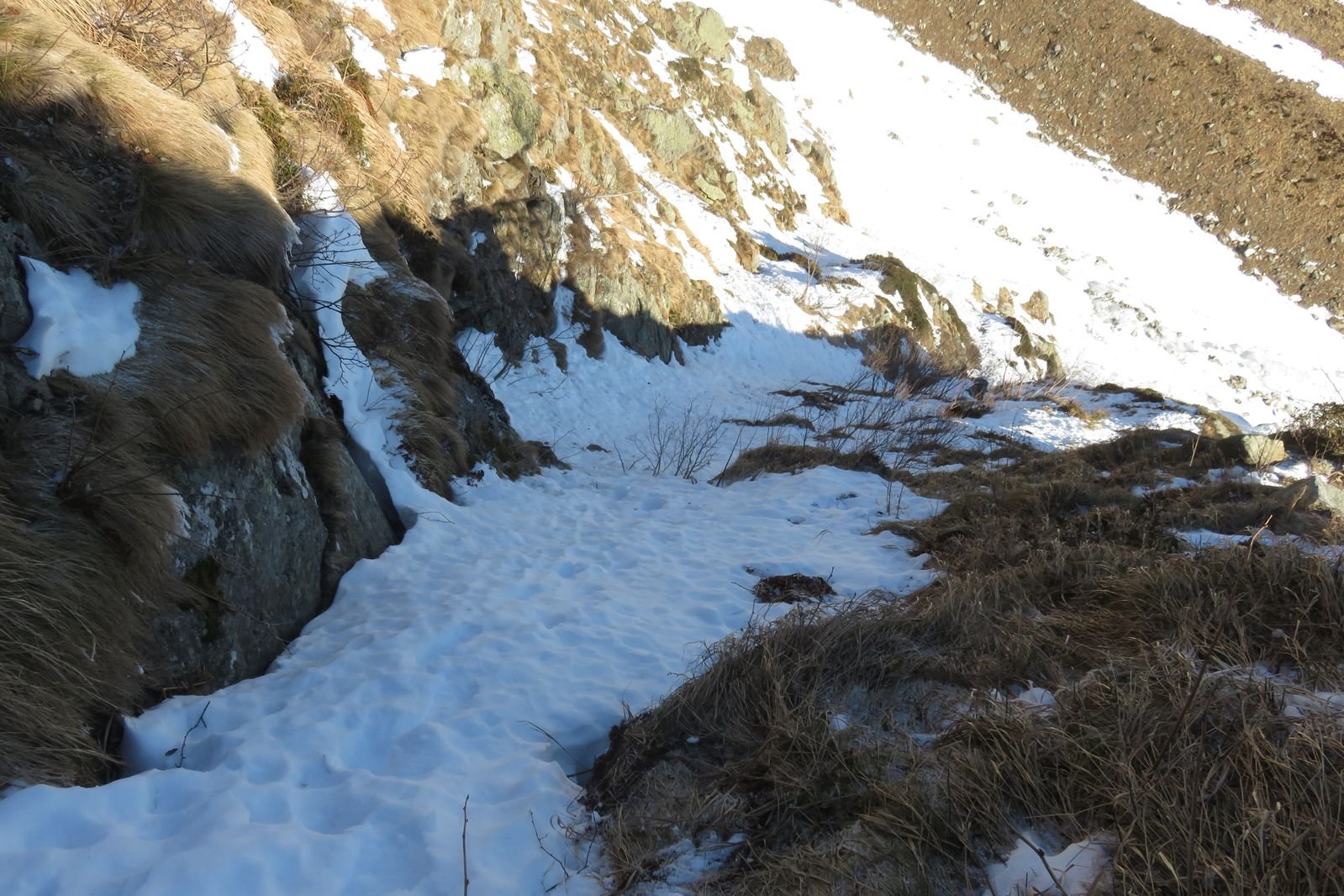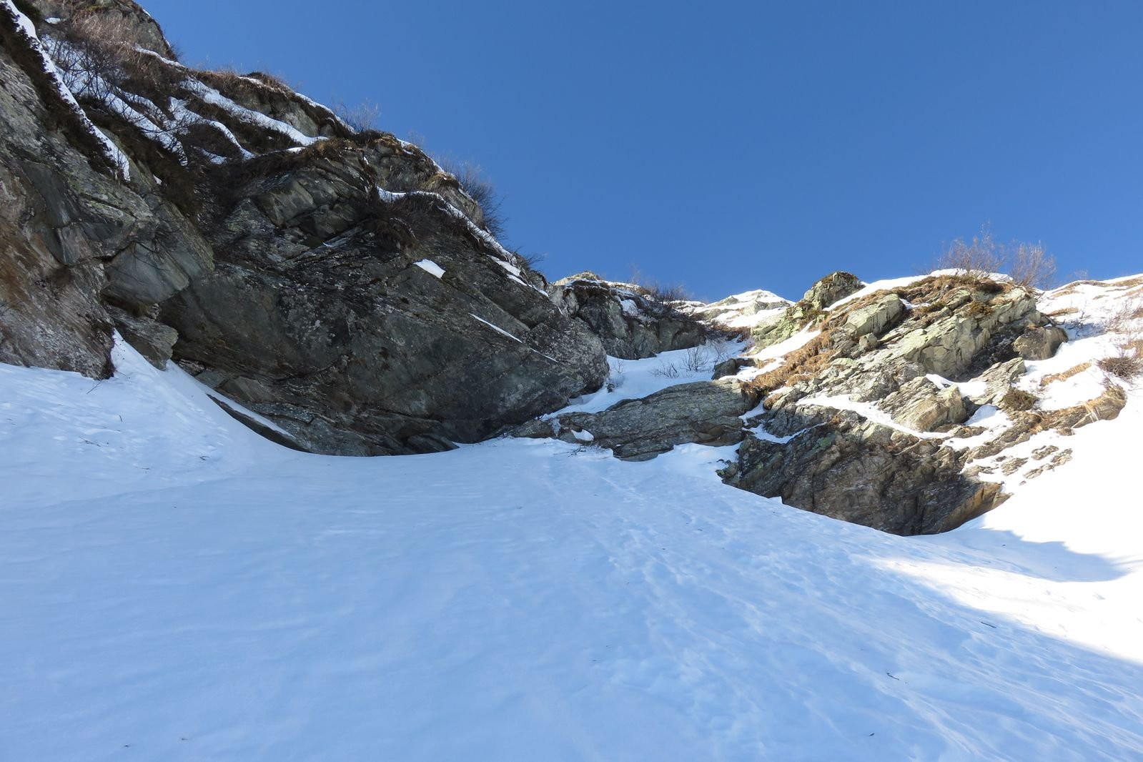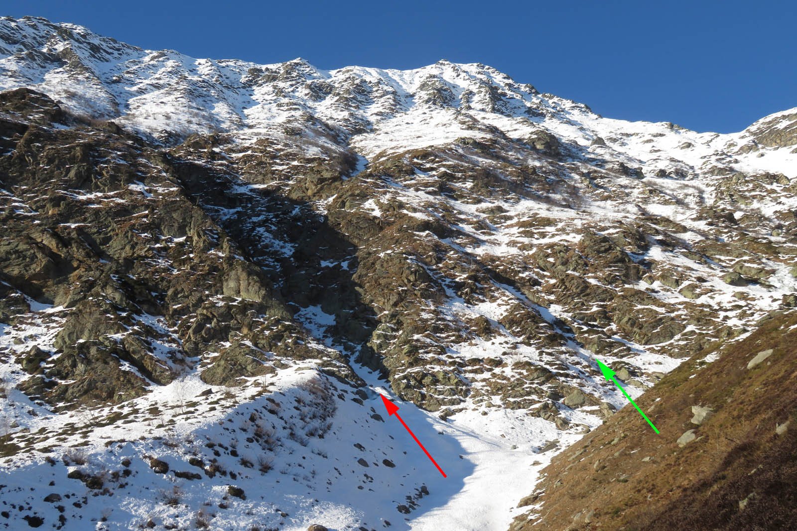 Se fatta per neve richiede condizioni assolutamente sicure (800 m 40/45°). Considerare l'orario vista l'esposizione. Con parete non troppo carica (ideale) possibili tratti di ghiaccio (aggirabili). Due piccozze consigliate.