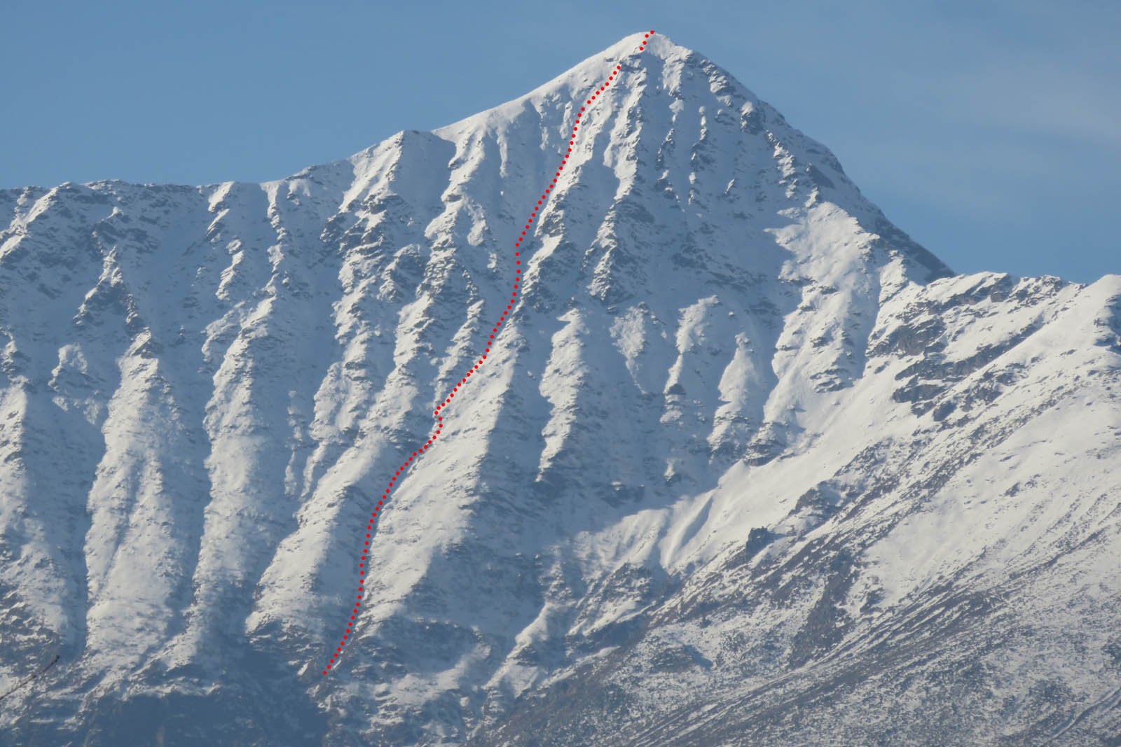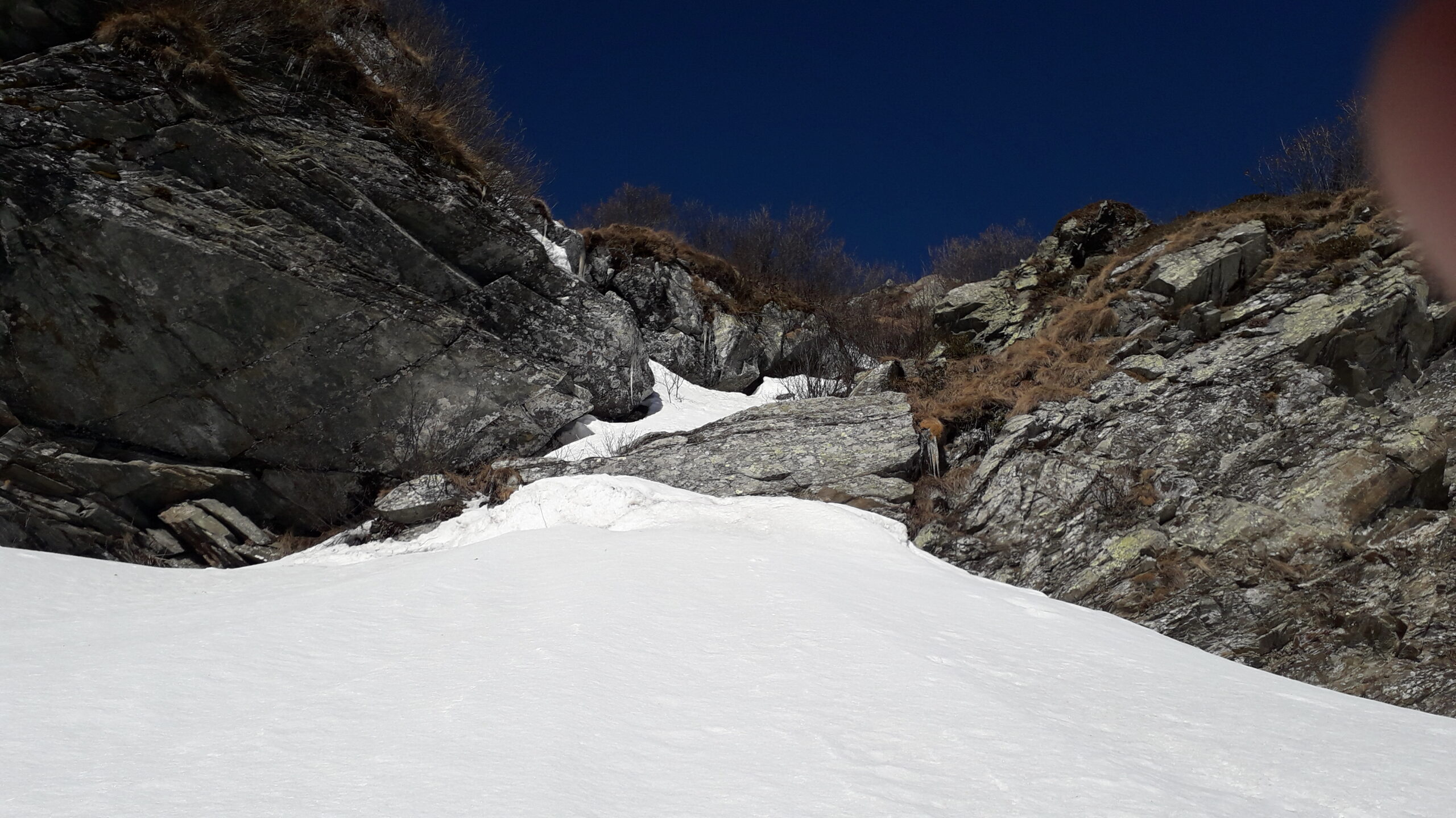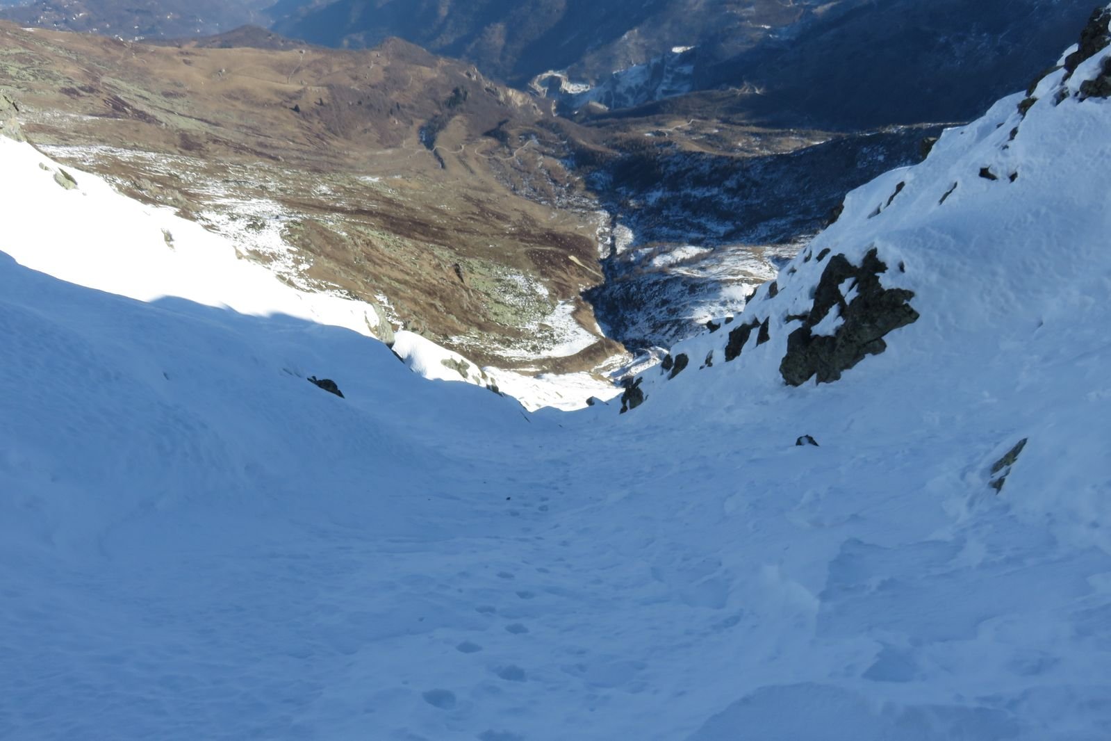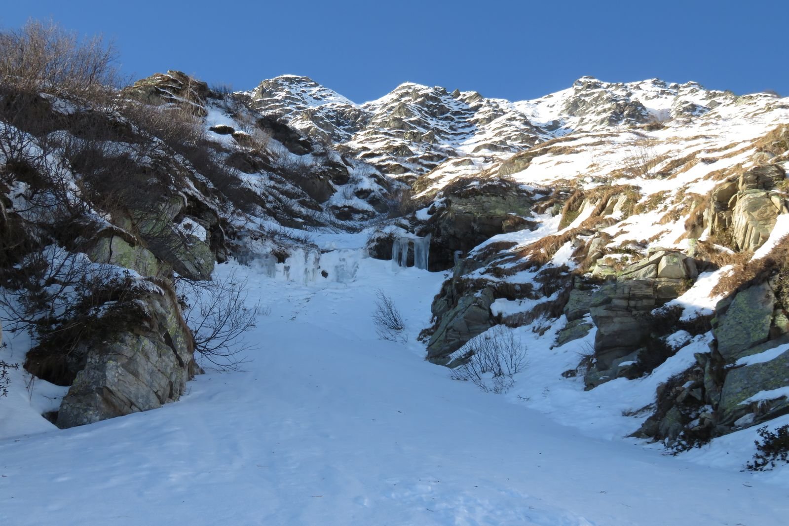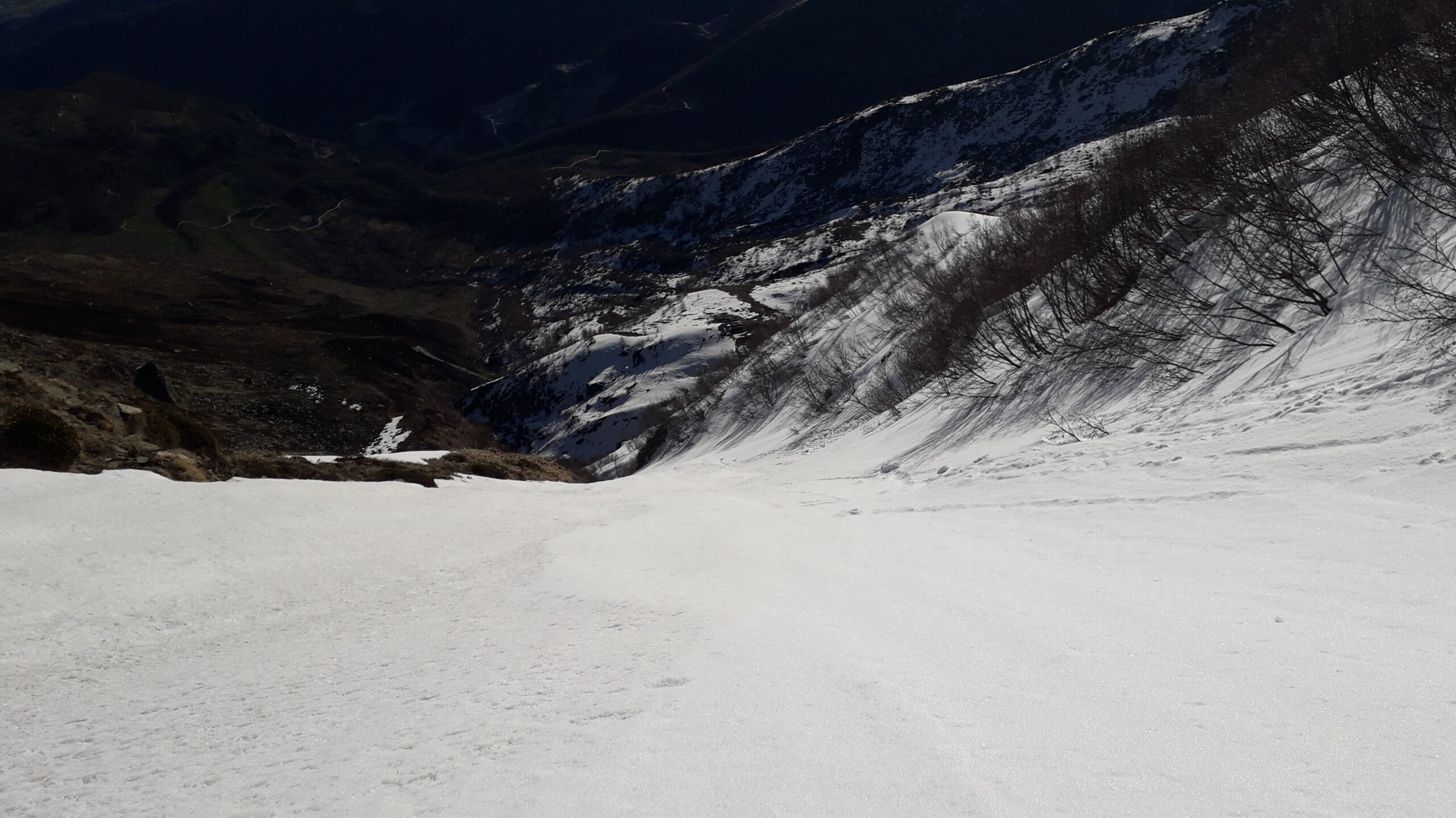 Se fatta per neve richiede condizioni assolutamente sicure (800 m 40/45°). Considerare l'orario vista l'esposizione. Con parete non troppo carica (ideale) possibili tratti di ghiaccio (aggirabili). Due piccozze consigliate.