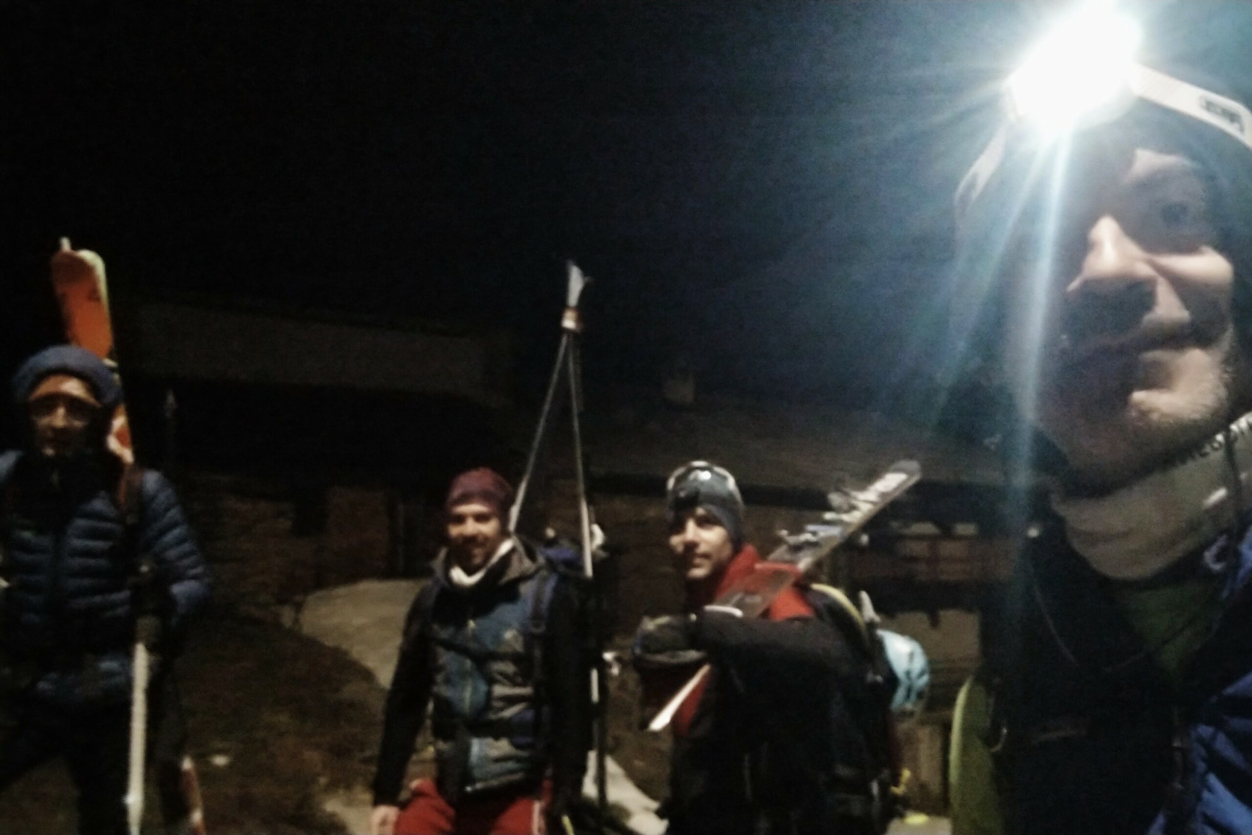 Partiti da Brich alle 5.20 con temperatura sopra lo zero, messi e tolti gli sci un paio di volte per superare tratti di prato.