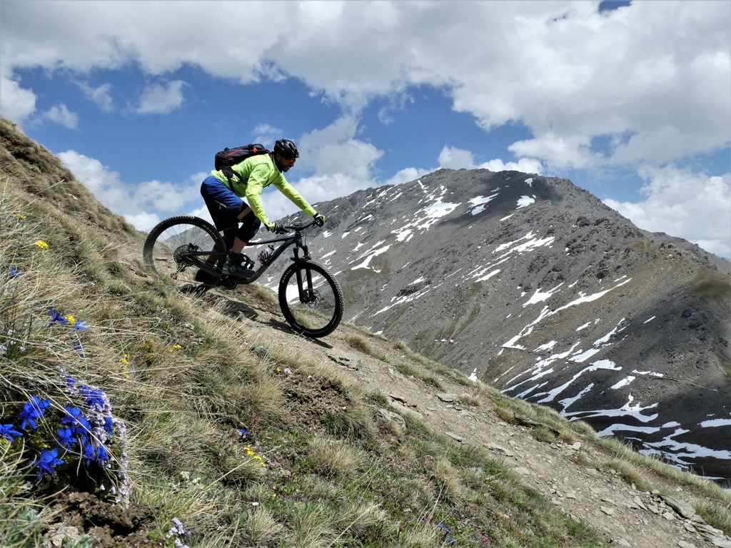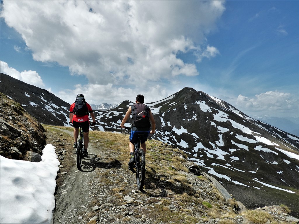 Giro stupendo, difficoltà molto contenute e panorami magnifici. La salita al col de Sollieres è su ottima sterrata, un pò più impegnativo il lungo traverso su sentiero che conduce al colle, dove abbiamo ancora attraversato qualche breve nevaio. Oltre il colle, portage sulla traccia che conduce in cima, nuovamente pedalabile nel tratto finale.
