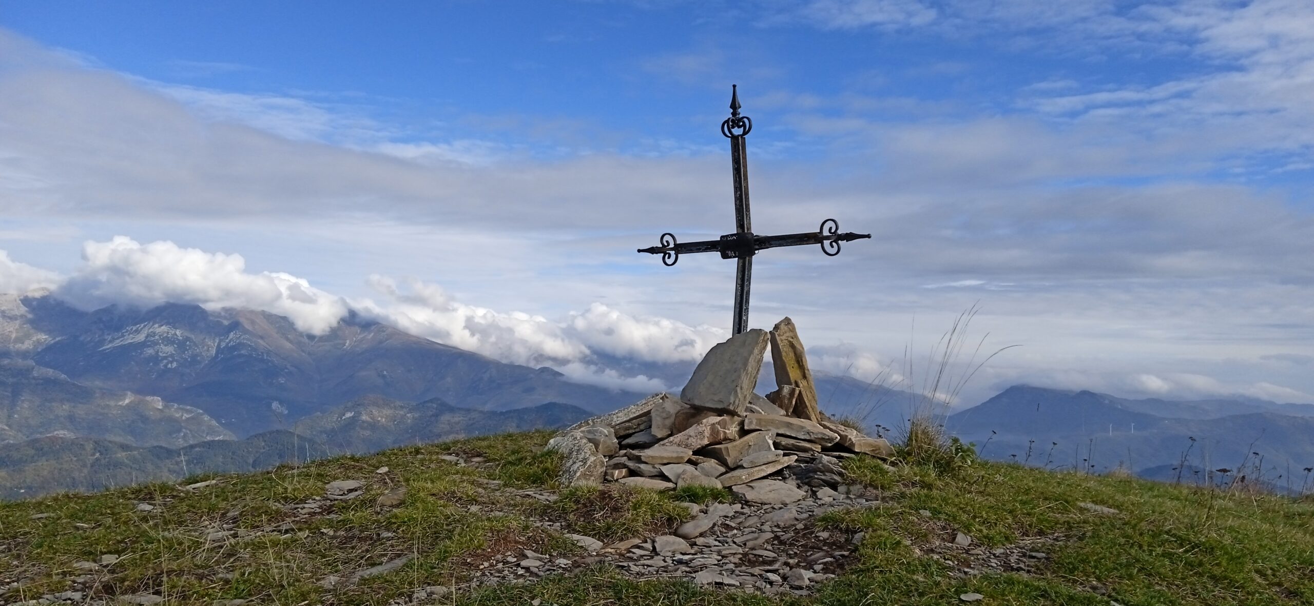 Raggiunto i casolari di Case Fascei, ho seguito la sterrata fino al corso d’acqua e con la mula scomparsa o quasi, sono salito direttamente nel bosco stile ravanage con qualche bollo e fettuccia che guida, per uscire dal bosco e seguendo la vecchia mula degli alpeggi, ad arrivare all’ Alpe Pian del Latte. Da li tra sterrata e tagli, ho raggiunto il Passo Pian del Latte da dove ho continuato la salita arrivando sul Monte Monega (m.1882) con ancora ampie aperture. Proseguito per il panoramico crinale verso il Colle del Garezzo passando per il Poggio Fearza e la Cima dell’ Ortica, sono salito decisamente e con le nuvole in formazione ad arrivare sul Monte Fronte’ (m.2153) dove mangio qualcosa. Ormai nelle nuvole con nebbia in alto, rientro al Colle del Garezzo per la mula e poi ho proseguito per la sterrata arrivando all’ Alpe Pian del Latte, da dove ho seguito la lunga sterrata tra favolosi colori autunnali fino ad arrivare alla macchina terminando la bella gita.