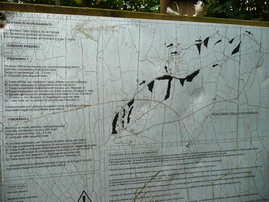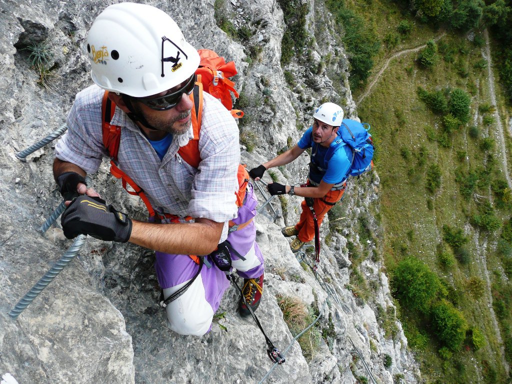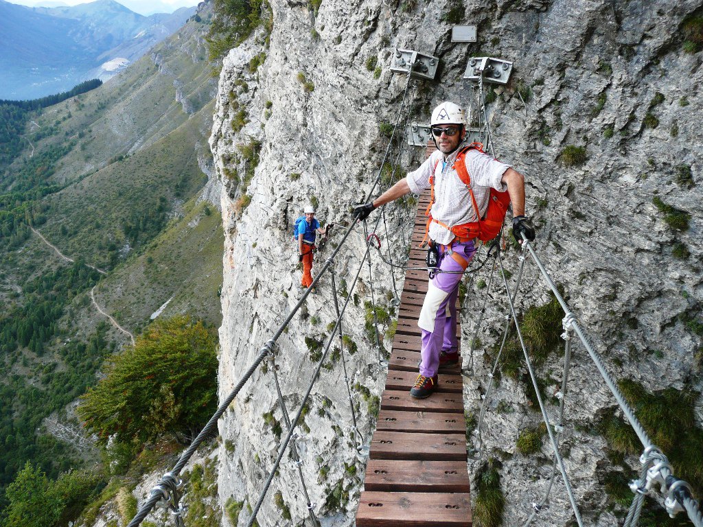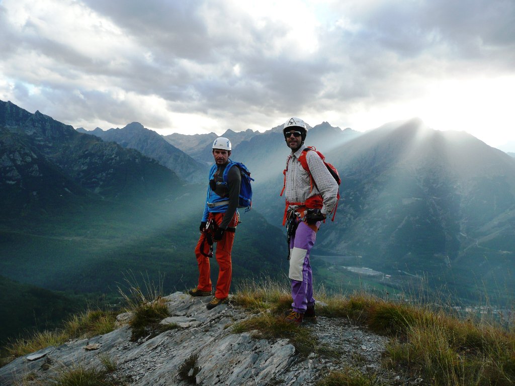 Anche qui molto bello l’ambiente e ferrata abbastanza fisica esattamente come me l’aspettavo. Percorsi tutti i tratti con varianti atletiche ed il ponte (itinerario 1). Molto ferro ed attrezzatura robusta ed impeccabile che appare perfino sovradimensionata per quanto riguarda il ponte passerella ed i suoi attacchi alla parete. Generosa anche la parte relativa alla discesa in quanto ad attrezzatura, praticamente una ferrata a se stante. Leggendo un po’ frettolosamente le relazioni, ho parcheggiato alla prima chiesetta poco dopo il distributore per poi scoprire a cose fatte che si può proseguire ancora fino ad una successiva chiesetta e poi, per strada molto più stretta, fino alla borgata Tetti Violino dove però i parcheggi sono molto esigui. Quindi abbiamo “vinto” 100 metri di dislivello col sentiero nel bosco durante la salita e 3 chilometri di asfalto per la discesa con ritorno al crepuscolo. Con Atoki e Fabrizio N.A. dopo avere percorso la nuova ferrata al Bec Valletta, in modo da sfruttare al meglio questa trasferta per noi abbastanza impegnativa e riempire bene la giornata.