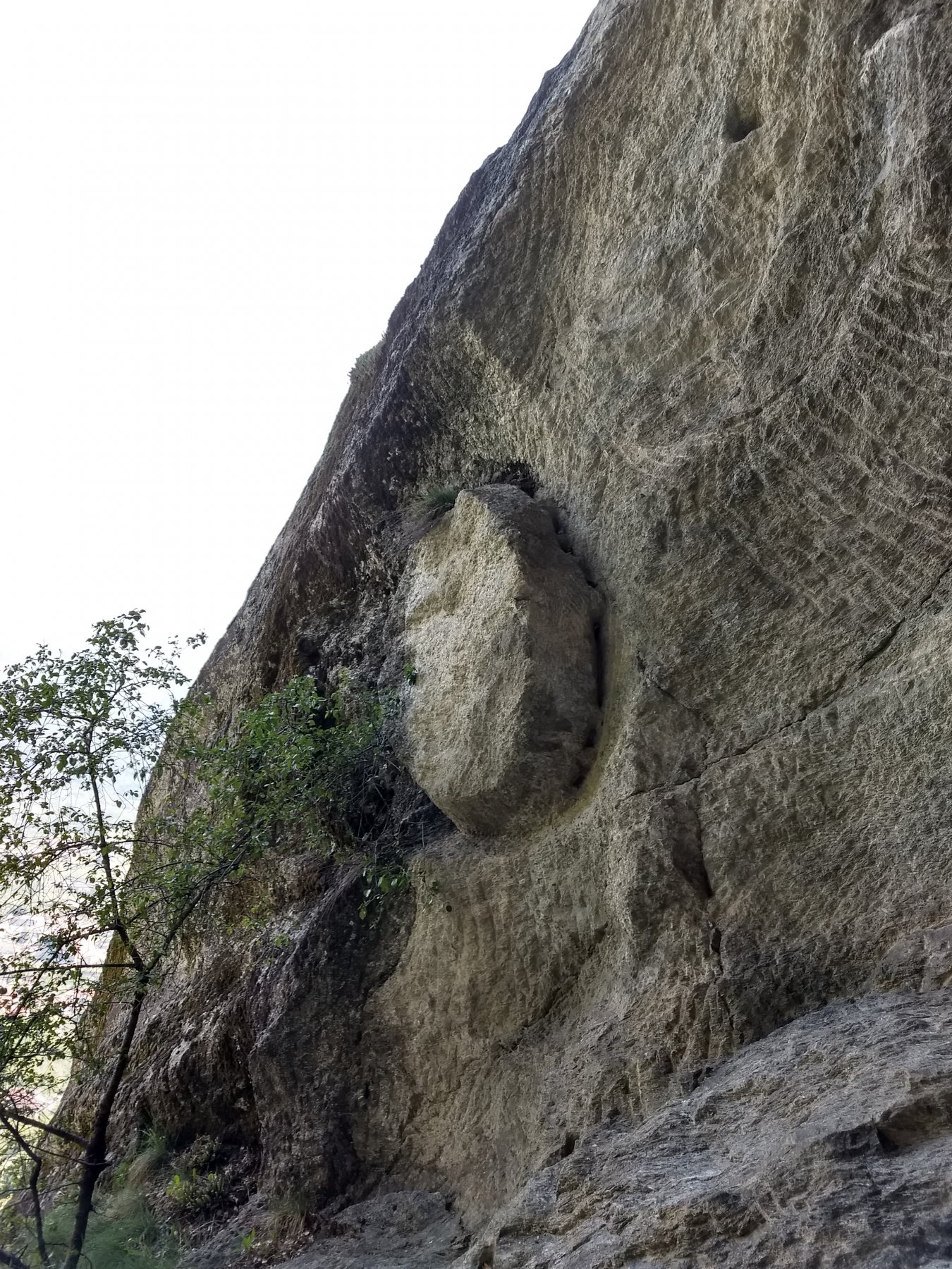 - L2: risalire il muretto e seguire la placca abbattuta con chiodatura distanziata, fino alla sosta posta alla base della parete verticale (IV, 35 m);