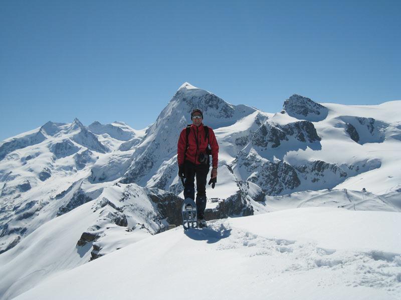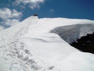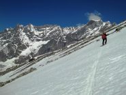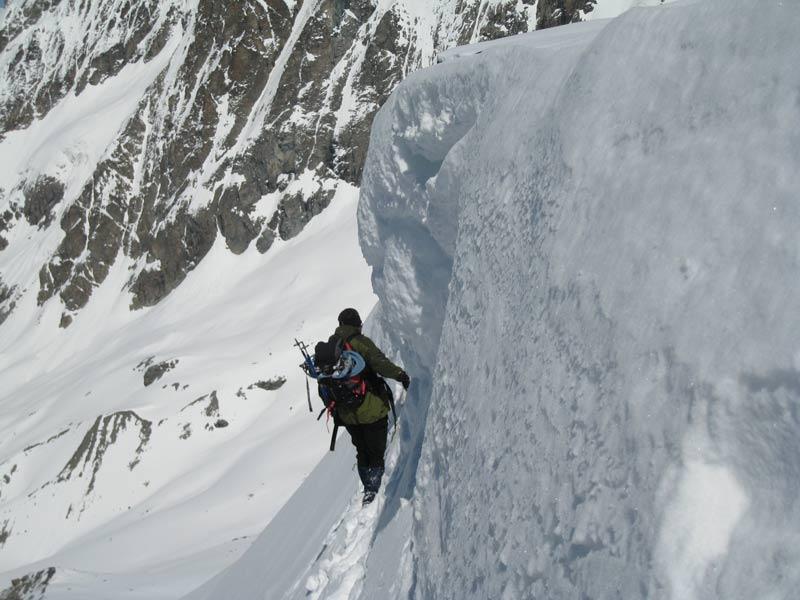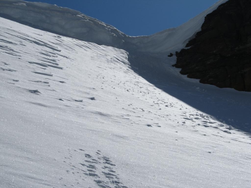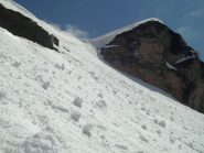 Si raggiunge una piccola conca sospesa proprio sotto all’ultimo breve pendio molto ripido che porta al colle 3420 m sotto la cima. Questo pendio va percorso con ramponi e piccozza, circa 50 m con pendenze tra 45°e 50 °, prestare molta attenzione in quanto l’uscita al colletto è presente una grossa cornice da superare.