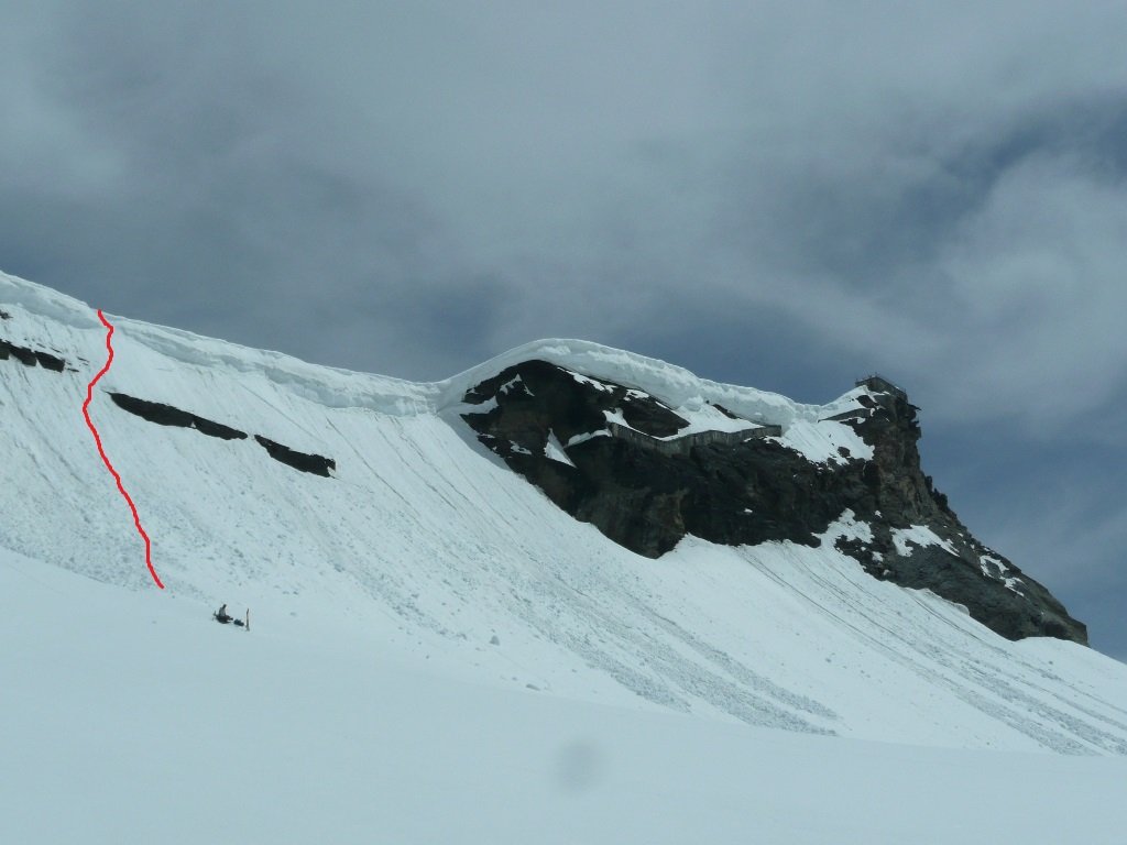 Partendo da Plan Maison (m 2550 circa) si percorre in falsopiano il segnavia n. 35 (direzione nord, verso il Rifugio Duca degli Abruzzi all’Oriondé) per quasi due chilometri (direzione nord), attraversando l’intero fronte delle piste da sci, fino alla stazione dismessa della vecchia seggiovia del Pancheron (m 2600 circa). Si comincia quindi a salire in modo più evidente e dopo circa duecento metri si può scegliere se percorrere per circa trecento metri la pista di sci del Pancheron e poi svoltare a sinistra sulla vecchia pista del Furggen, oppure proseguire con il sentiero 35 (direzione NW), fino a raggiungere la cresta morenica dell’antico ghiacciaio del Cervino, seguendone quindi la linea di cresta (direzione NE), e ricongiungersi alla stessa pista del Furggen (a quota m 2800 circa). Si prosegue per altri 600 metri (e 150 m di dislivello) lungo la morena, fino all’ampia conca dei colli del Breuil e del Furggen, dove generalmente inizia la quota neve (almeno fino a metà estate). Anziché proseguire nella conca verso i colli, si piega invece a destra (est) puntando direttamente la cima del Furggen, lasciandosi sulla sinistra i residui del ghiacciaio della Forca (o Forclaz), si superano alcune balze più ripide (35°), aggirando eventualmente a valle (in leggera esposizione) l’ultima rampa che conduce alla conca sotto l’uscita del tunnel della vecchia funivia (m 3350). Qui, a seconda delle condizioni di innevamento, si concentrano tutte le possibili difficoltà della via: indispensabili ramponi e piccozza; si risale il breve pendio via via più ripido (fino ad oltre 50°) che copre un dislivello di circa 80 metri fino alla sella che precede la cresta finale (a 200 m e 60 m di quota sotto la stazione). Il passaggio migliore si trova normalmente sulla destra, a fianco della bastionata rocciosa del tunnel, ma gli ultimi due metri potrebbero essere del tutto verticali e la cornice sommitale talmente aggettante da risultare insuperabile, a meno di un lungo e paziente lavoro di scavo. Nell’eventualità un possibile passaggio alternativo, anche se più esposto (da verificare) consiste nell’aggiramento del bastione roccioso a sinistra della sella. Segue l’ampia dorsale che in breve conduce al terrazzo panoramico della cima (m 3490).