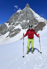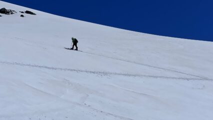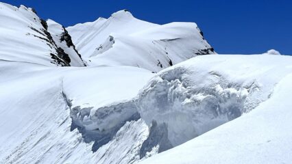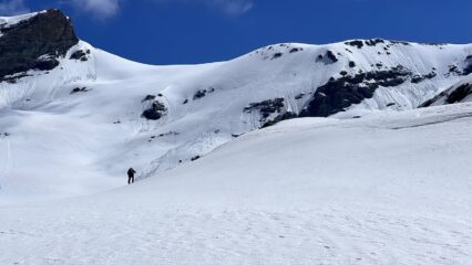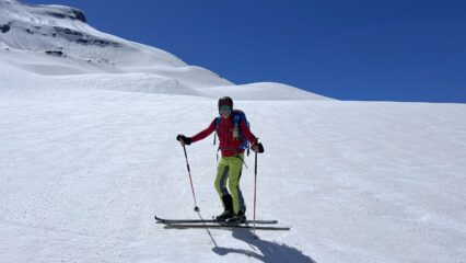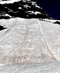 Furghen fatto negli anni precedenti , i pendii del colle sembrano perfetti ed allora dopo salita con funivia , breve discesa , poi bwella progressione sino in cima . Coltelli utili . Mai in questa stagione trovato così innevato ! I pendii in alto un biliardo , poi tutta sciabile . Con Bruno e Roberto , un saluto a Ermanno e Max chehanno fatto i Breitohorn
