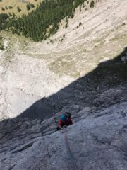 Bella via in ambiente un po’ selvaggio che rende tutto più interessante. Spittatura medio lunga nei tratti facili e più ravvicinata in quelli difficili; roccia abbastanza buona con alcuni punti delicati. Usciti lungo la cresta in conserva e poi per il canalone, discesa eterna fino a Thures