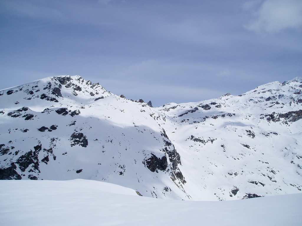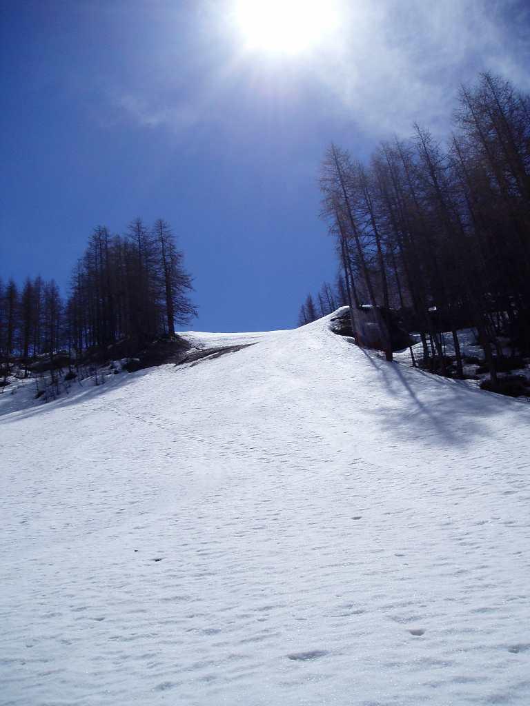 Dallo sgancio dello skilift raggiungere la diga o attraversando il lago (occhio!!!) o costeggiandolo sulla dx, quindi scendere il bel vallone evitando alcuni salti di roccia.