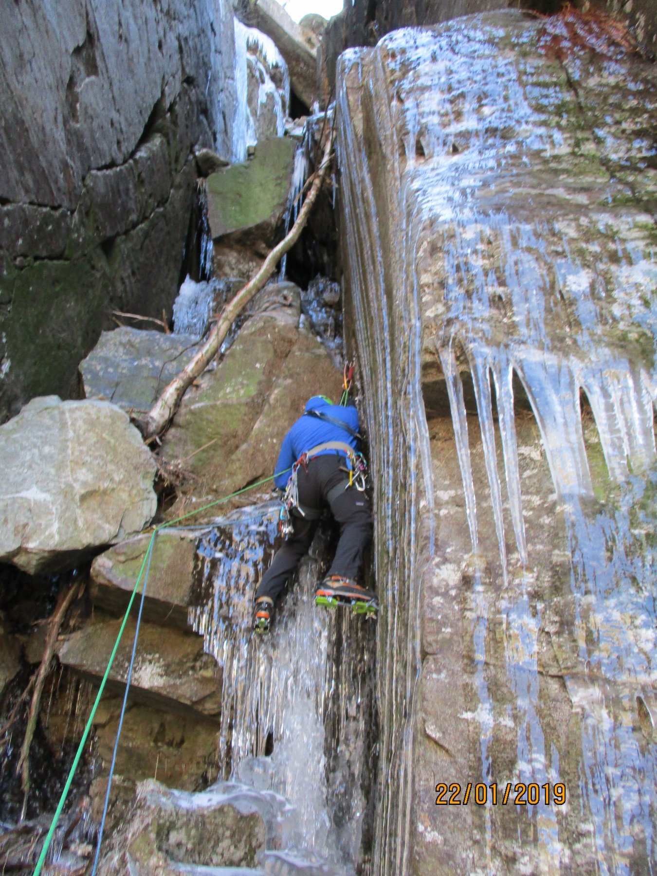 Attaccare la colata di sn molto magra o quella a dx un po piu chiodabile (3) a saltini, sosta a 60 m su albero. Proseguire seguendo il flusso ghiacciato tratti di trasferimento su ghiaccio poco ripido si alternano a divertenti muretti di 20 metri, uno con passi di misto. Puntare alla forra in alto a sn. da li tre tiri con ribaltamenti su massi incastrati , ultimo tiro usciti a sn (faccia a monte) su ghiaccio sottile e roccia poi.