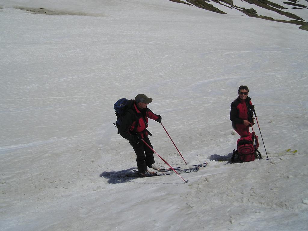 Partiti relativamente tardi da Engiloch intorno alle 8.30 con una temperatura di +12.5, si fanno dieci minuti a piedi giusto per attraversare il torrente sul ponticello e risalire sul pianoro sovrastante, il primo tratto si fa sulla neve delle valanghe, trovata neve dura sotto la cascata, ma il passaggio della cascata presentava neve primaverile umida, a tratti non facile. Saliti senza incontrare vento che era previsto per fortuna, arrivati in vetta intorno alle 11.30 siamo poi scesi alle 12 dal ripido canale di Ritzbach con esposizione sud-est, trovando un firn fantastico, veramente ottimo ci siamo poi portati sulla sinistra nella parte bassa per poi traversare in piano verso il vallone che scende dalla cascata, ottima discesa, straconsigliabile con queste condizioni.