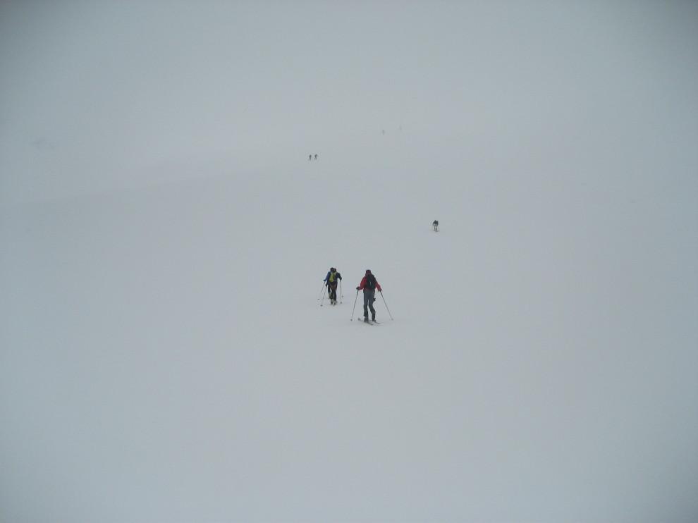 Siamo arrivati a Engiloch con l’idea di percorrere un altro itinerario, ma le nubi e il forte vento che ci hanno accolti al parcheggio, ci hanno fatto capire subito che la giornata non era quella propizia. Dieci minuti circa di “spalleggiamento”, poi neve pressochè sempre dura e sul primo pendio ripido, una imponente valanga da superare in parte a piedi, anche in discesa. Durante salita, freddo e vento sopportabili, ma la visibilità in diminuzione ci ha indotto -dopo i laghi di Sirwolte- a prendere la direzione del Galehorn o Sirwoltehorn. Tuttavia arrivati al Sirwoltehorn, non abbiamo avuto il problema (e privilegio…) di scegliere la cima da raggiungere: la visibilità si è annullata, e l’unica scelta logica è stata quella della discesa, che con queste condizioni di visibilità è stata di semplice trasferimento, anche se con neve sostanzialmente buona, dura e sciabile. Con Roberto C., GianPiero S. e il fuoriclasse Franco F..