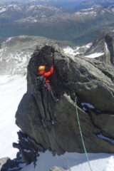 Con 7 tiri non particolarmente lunghi (30m c.ca) si arriva alla parte finale: facili roccette di II fino alla cima nevosa. Da qui in breve si arriva alla croce di vetta.