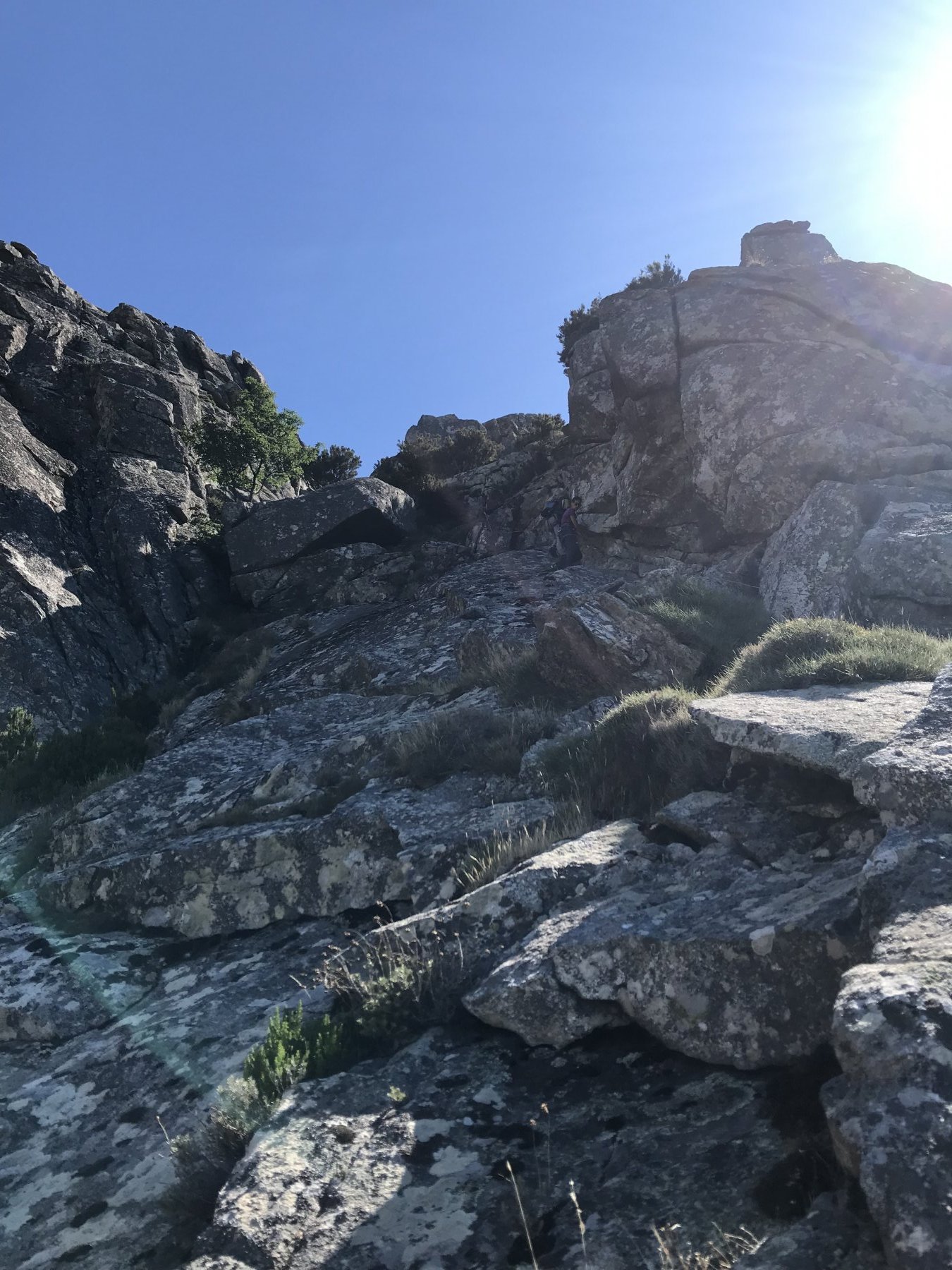 Salire per la cresta in cima al primo risalto, scendere nel canalone seguendo l’evidente corda d’acciaio e poi contornare per sentiero ben segnalato un costolone e risalire ad un colle. Salire per cresta il successivo risalto e scendere ad un nuovo colle da cui parte un’altra corda d’acciaio che conduce fino in vetta.