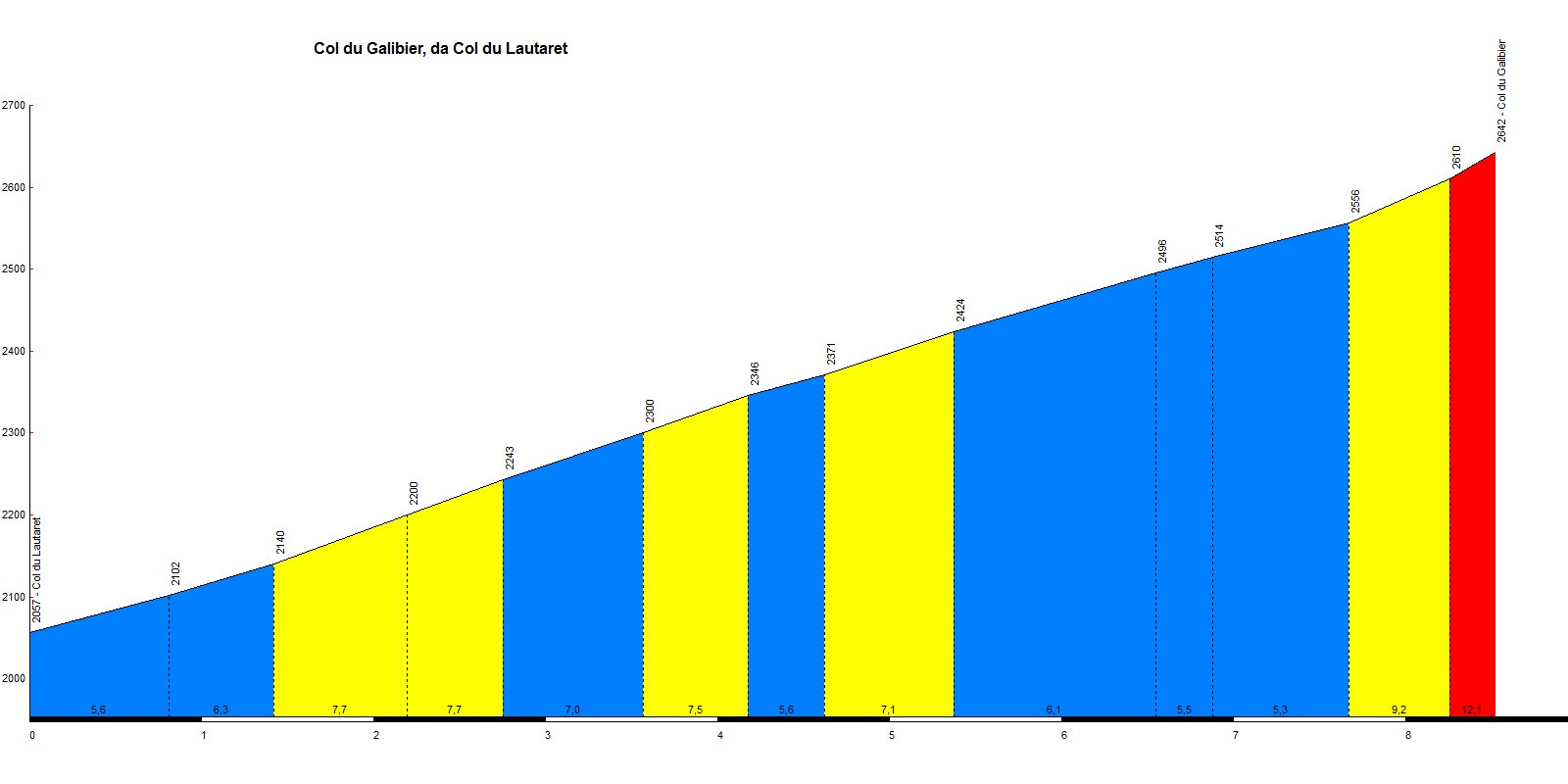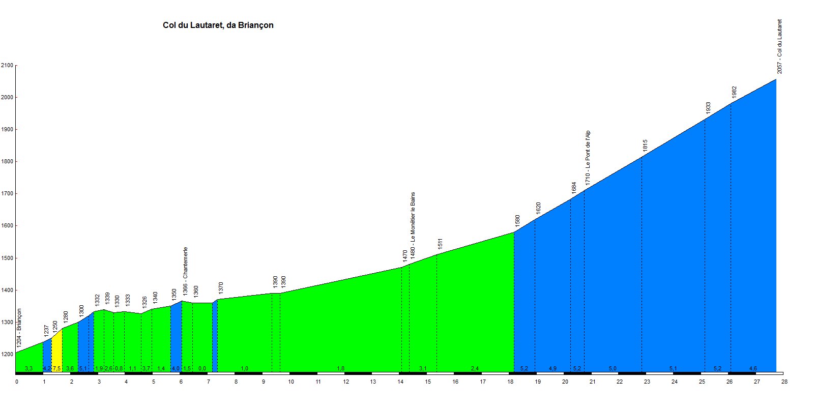 Da Briançon si imbocca la ruote national per il Col du Lautaret, che dopo i primi strappetti iniziali prima di Saint Chaffrey (max 7%) poi presenta un lunghissimo tratto con pendenze molto dolci alternate a tratti pianeggianti fino a circa 1600 m. Da qui si ritorna a salire, sempre in modo piuttosto blando (5-6%) fino a raggiungere il Col du Lautaret 2057 m.