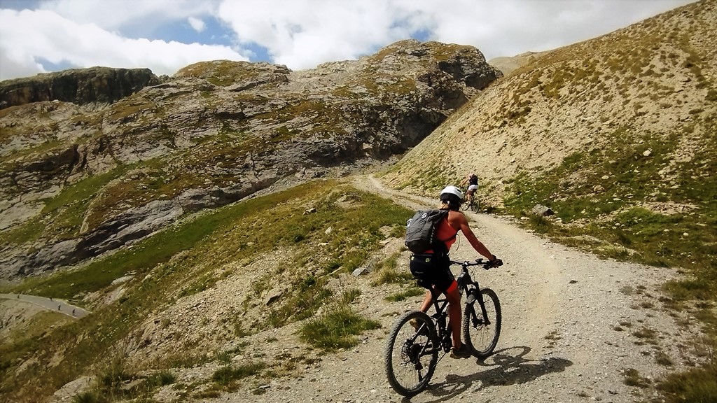 In discesa, circa un paio di km (detto a occhio, ma si vede bene) sotto il colle prendere un ampio e divertente sentiero che porta alla loc. Sestrieres, dove partono le gite di skialp per il Pic Blanc, che però pare poco pedalabile in salita a chi non è veramente abile e allenato.