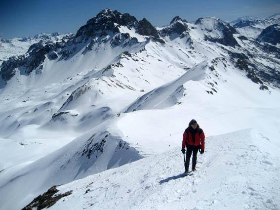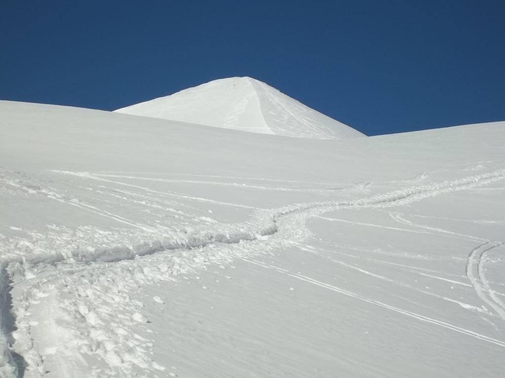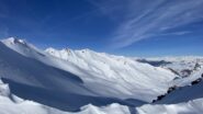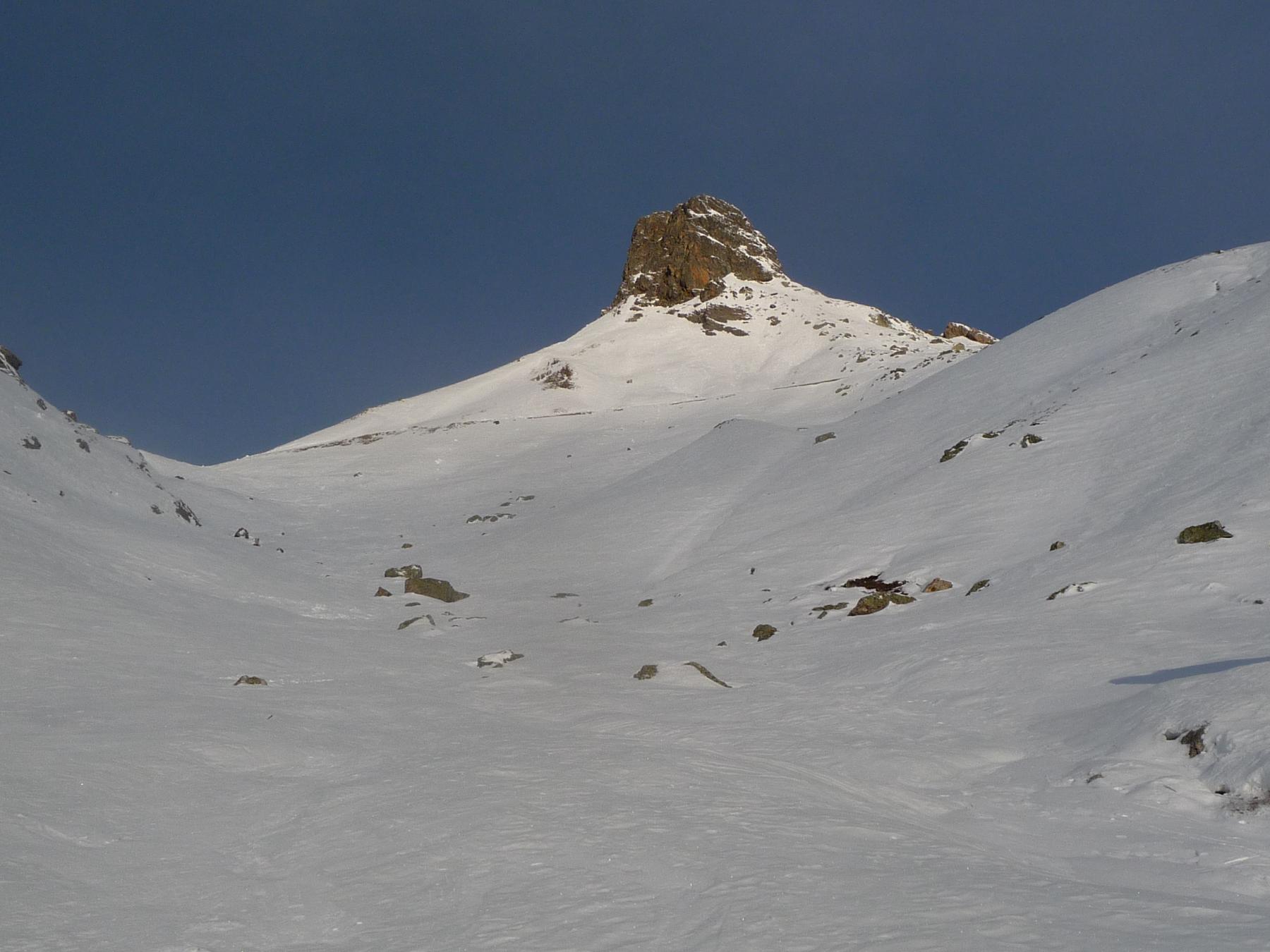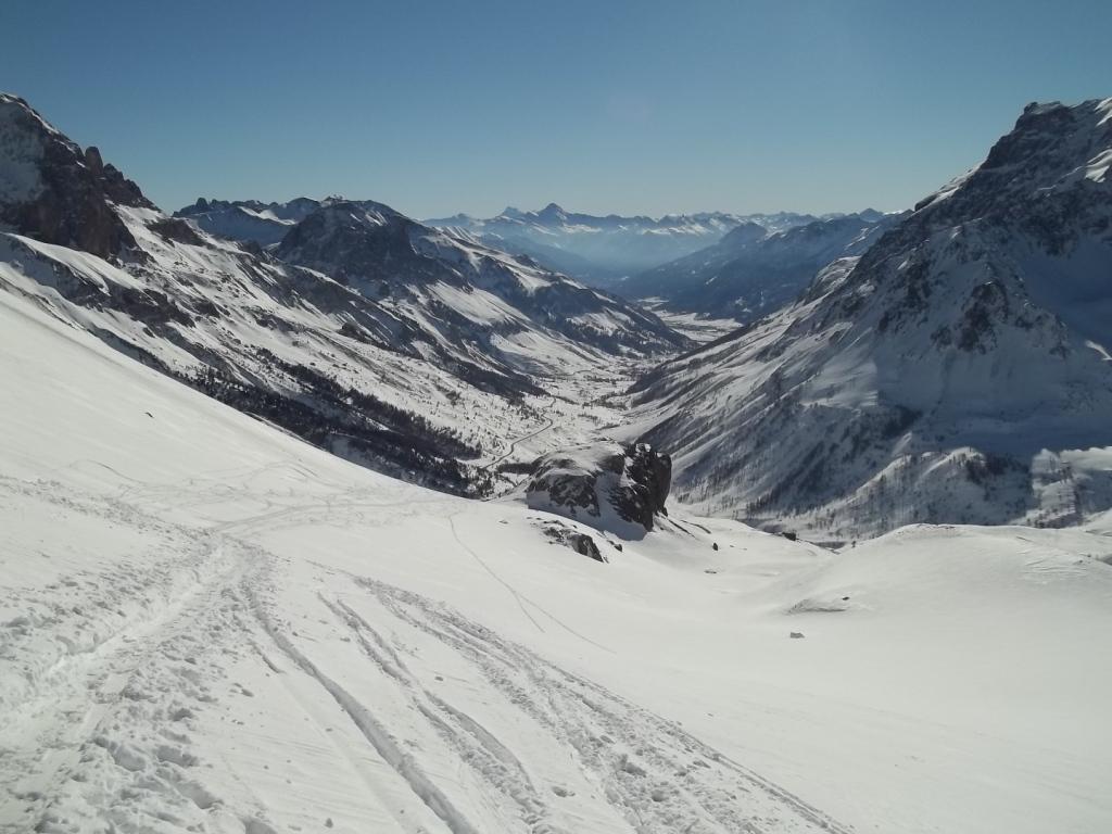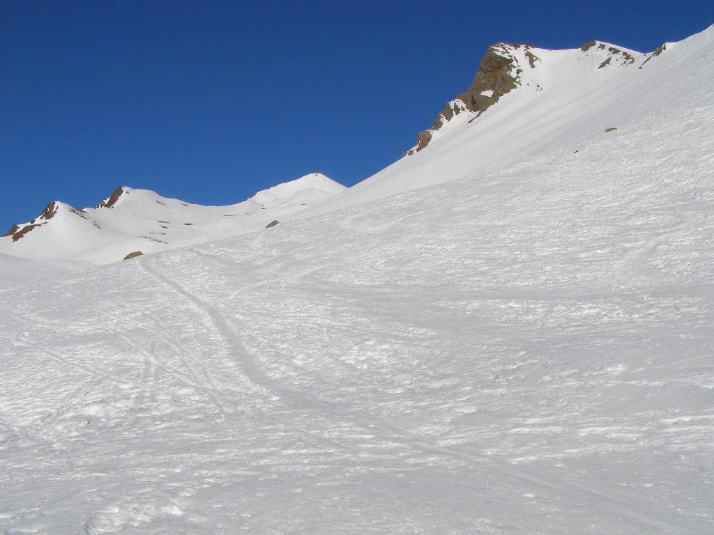 Superato il traliccio a sinistra si entra in un valloncello e si attraversa la strada che d’estate porta al Col du Galibier; si si risale tenendosi al centro del vallone, fino a raggiungere una spalla nevosa a quota 2435 m dove i pendii si allargano e si vede la vetta del Pic Blanc du Galibier sullo sfondo.