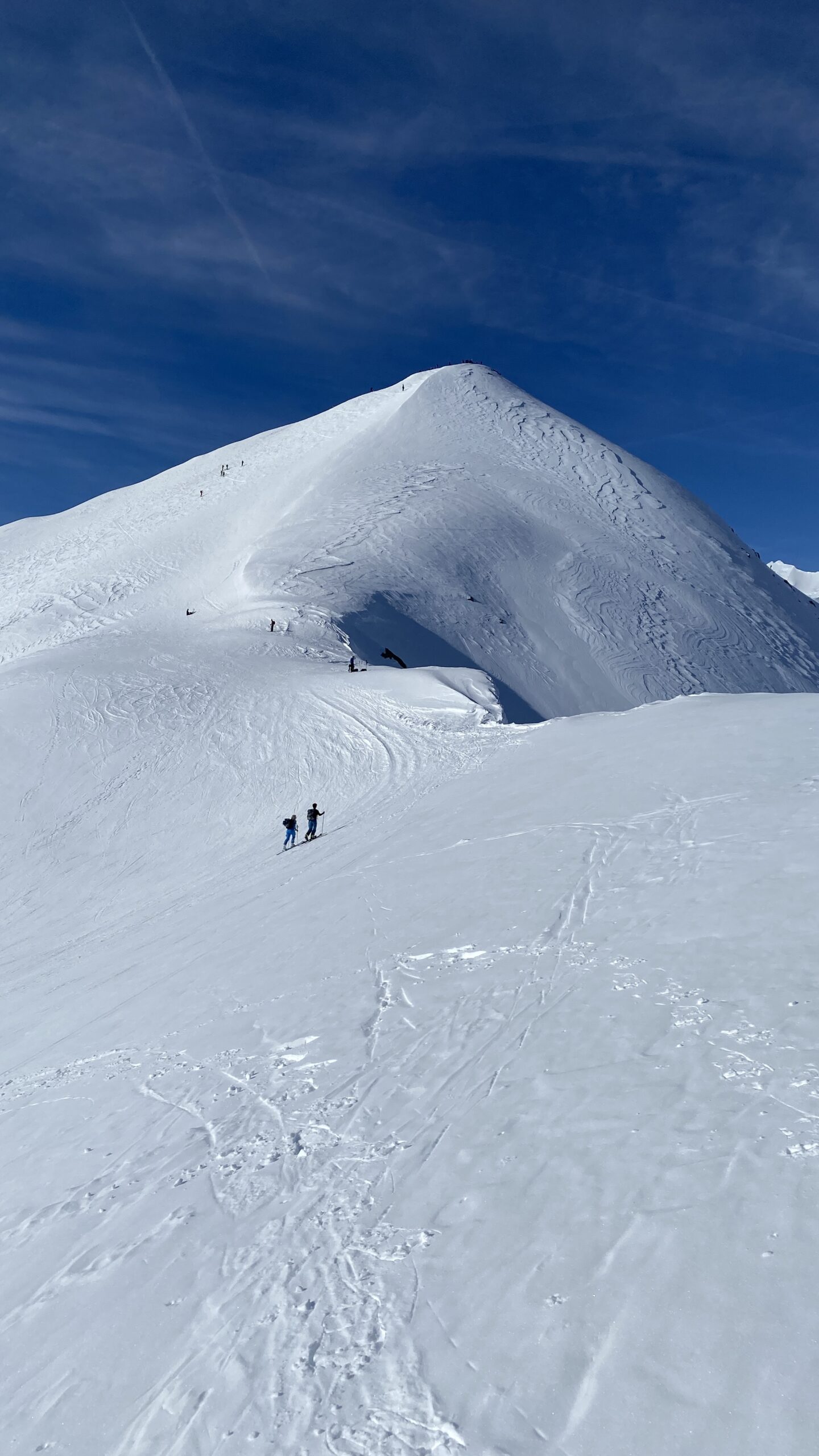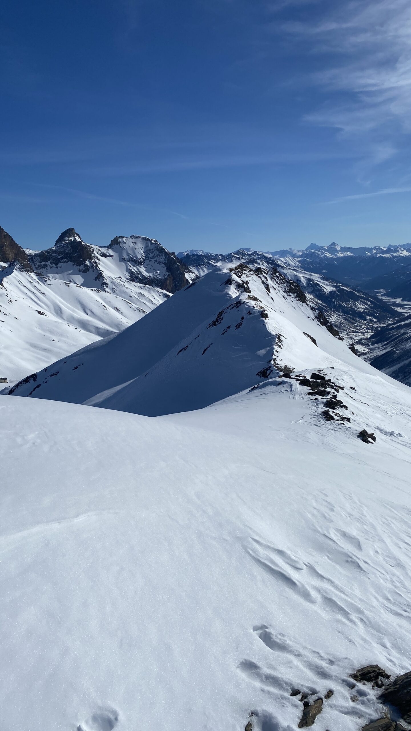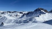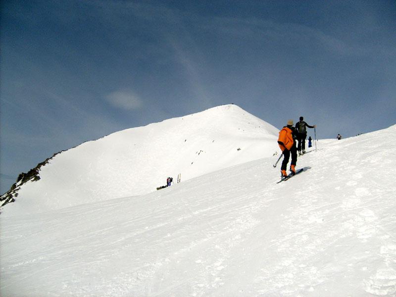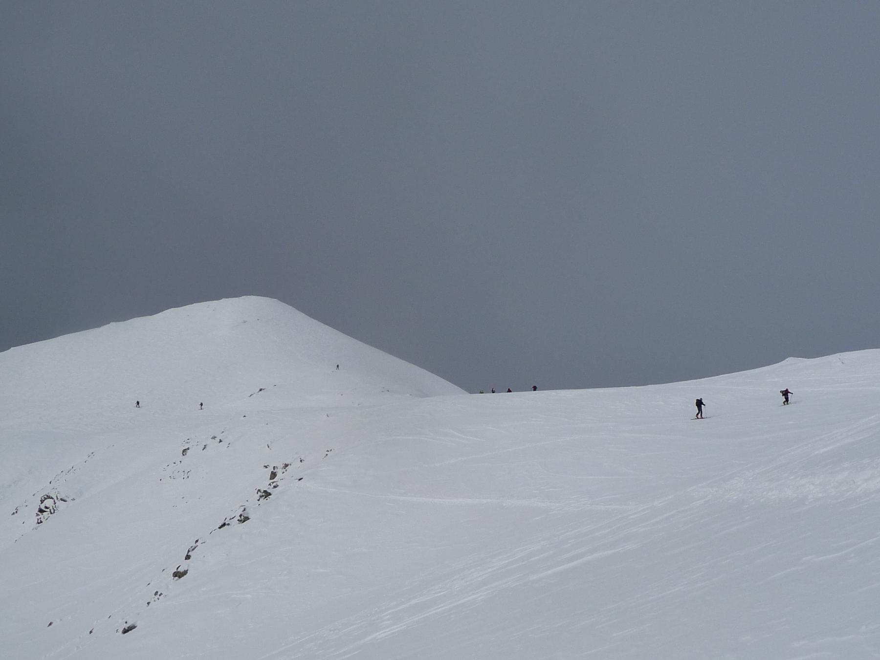 Superato il traliccio a sinistra si entra in un valloncello e si attraversa la strada che d’estate porta al Col du Galibier; si si risale tenendosi al centro del vallone, fino a raggiungere una spalla nevosa a quota 2435 m dove i pendii si allargano e si vede la vetta del Pic Blanc du Galibier sullo sfondo.