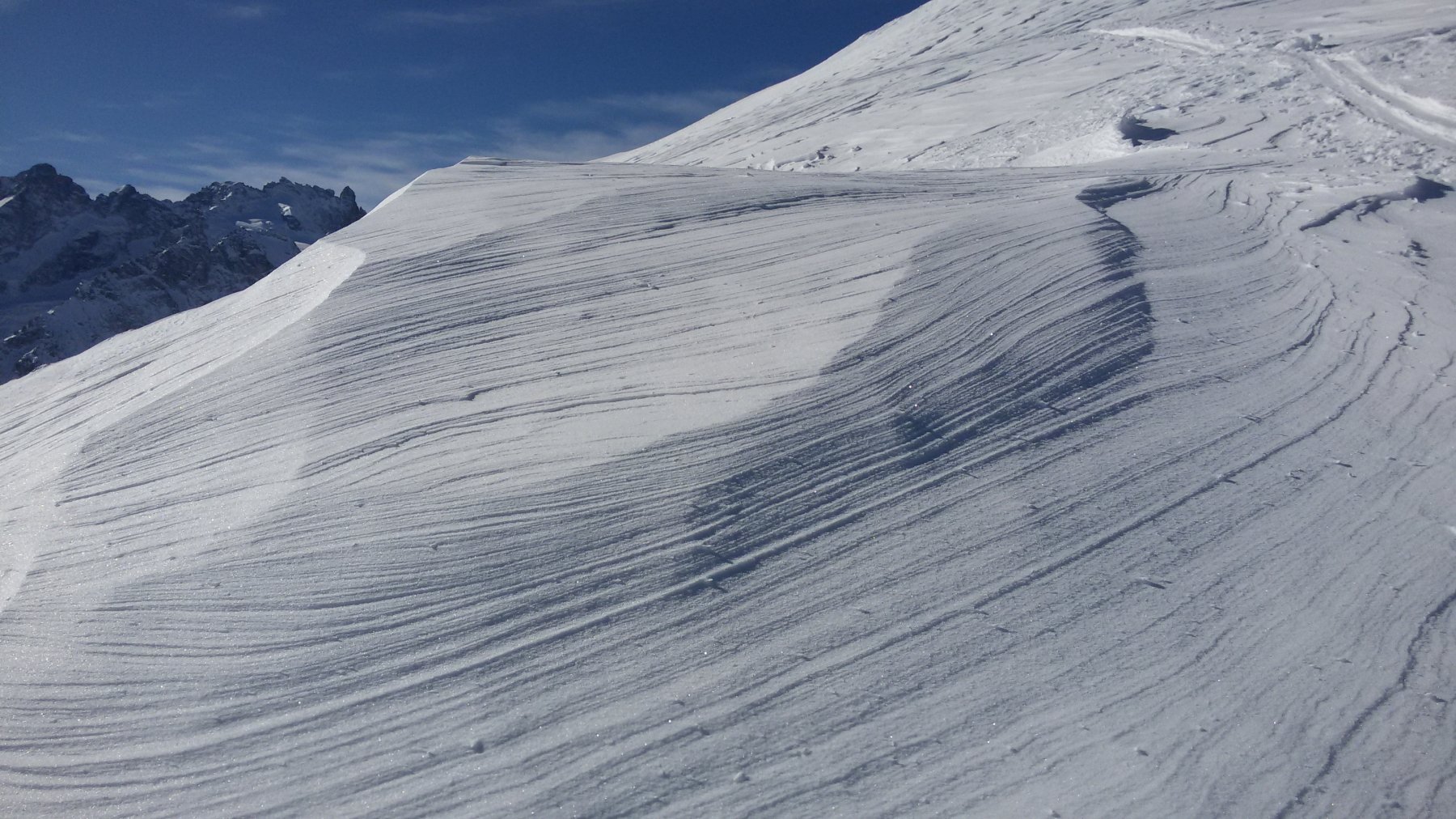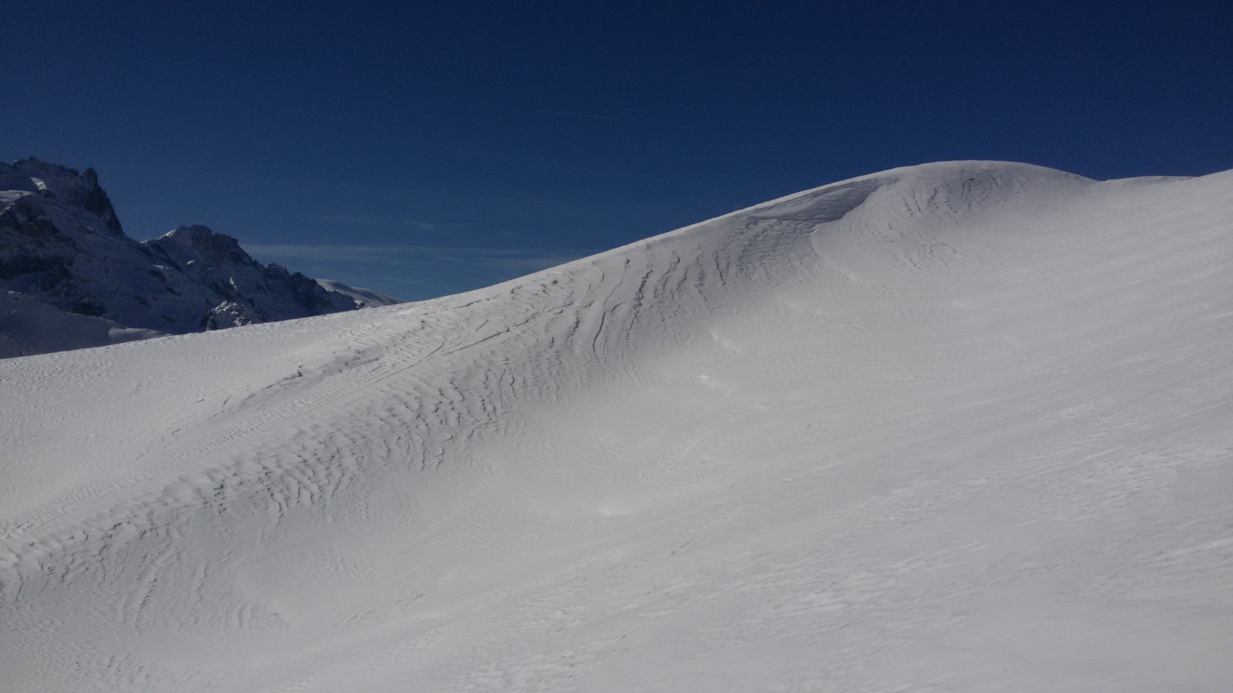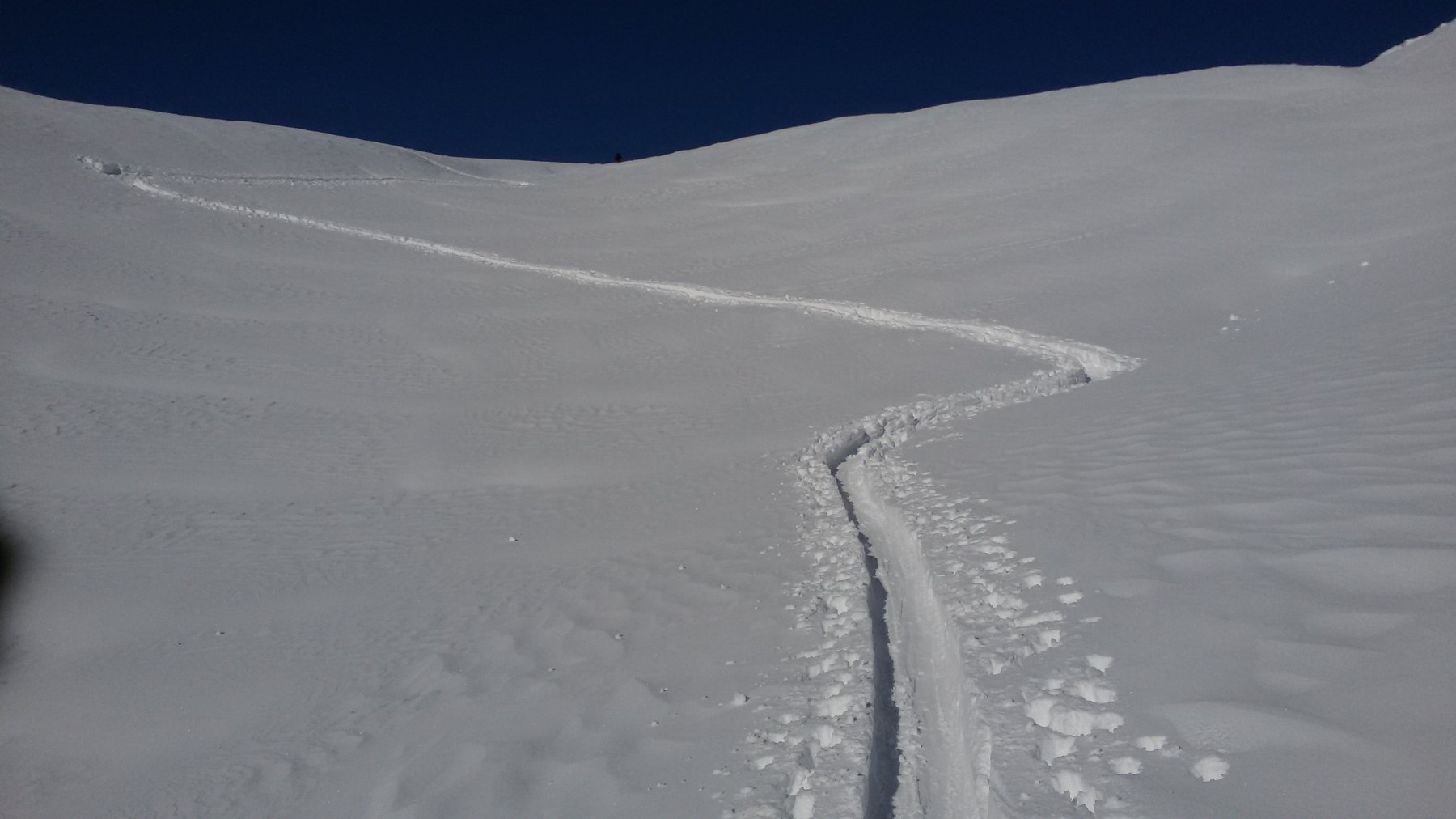 Anche di la del Monginevro tanta neve anche a bassa quota. Giunti alla partenza, oltre la galleria prima del Colle, vediamo auto parcheggiata e traccia fresca. Il francese si ferma alla sella in cima alla valletta ma intanto arriva un plotone di 20 militari francesi e li facciamo passare. Tracciano una trincea fino in cima che naturalmente apprezziamo! Discesa sulla bellissima pala sempre visibile durante la salita su farina veloce. Dalla sella in giù più pesante per il sole a palla, caldo e spietato ma non ci lamentiamo. Ambiente e meteo fotonico.