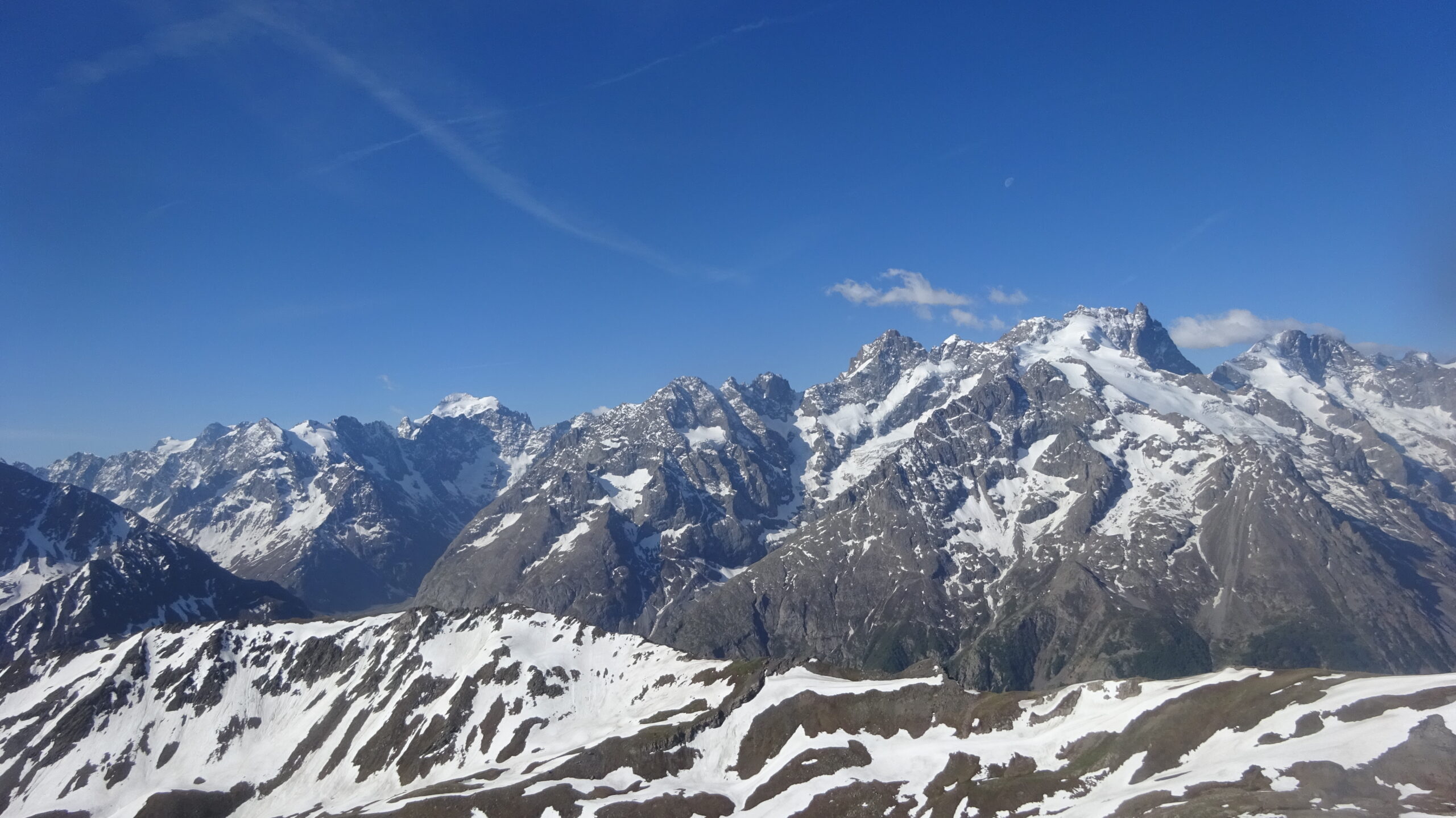 Abbiamo parcheggiato sullo slargo della strada Col du Lautaret – Col du Galibier a quota 2.430 m. Il portage è limitato a poche centinaia di metri lineari, poi si raggiungono le prime lingue di neve che consentono di calzare gli sci. Siamo partiti intorno alle 8, con temperatura mite ma accompagnato da un vento fastidioso. Una volta addentrati nel vallone, dopo un centinaio di metri di dislivello il vento è cessato, e lo abbiamo ritrovato, molto meno forte, in cima. La salita è scivolata via piacevolmente in un’oretta, nonostante l’assenza di rigelo la neve non ha mai sfondato, e la copertura nevosa è ancora continua, tranne un breve interruzione di una quarantina di metri lineari. Gli ultimi 150 metri di dislivello li abbiamo fatti con lo sguardo sempre rivolto sugli Ecrins: cielo terso, nessuna nuvola sulle cime, prati verdi in basso e ghiacciai ancora bianchi, un vero spettacolo. Una volta in vetta ci siamo ancora goduti la vista sugli Ecrins, e sulle montagne più vicine, mentre verso la Savoia il panorama era limitato da nuvole e foschia.