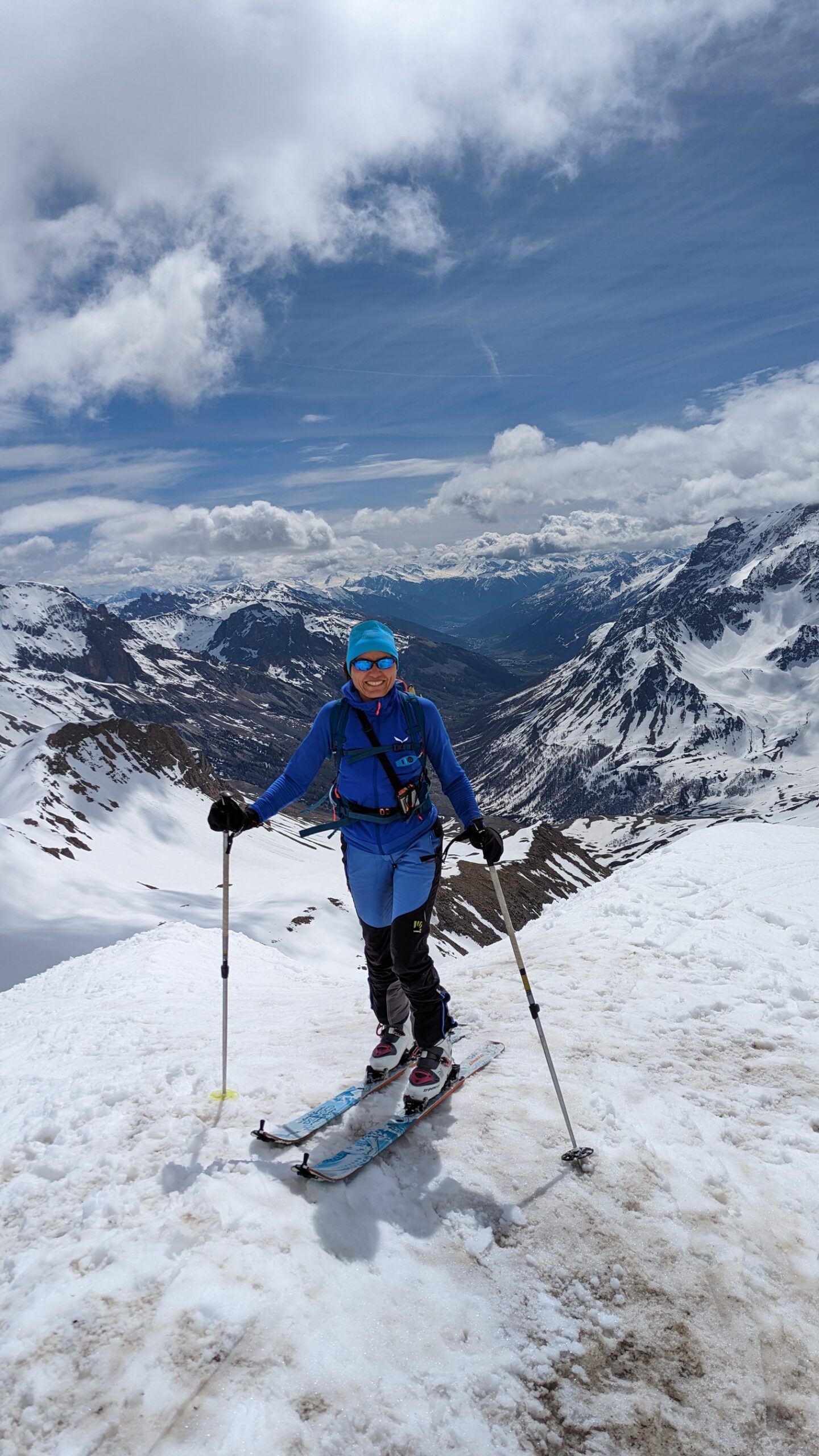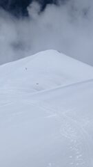 Dal park prima della galleria si cammina agevolmente 25′ . Attenzione ad attraversare il ruscello… siamo passati senza bagnarci ma la neve sfonda! Purtroppo poco rigelo notturno questa notte. Salita piacevole con gran caldo e nuvole in forte movimento. In discesa neve un po’ pesante ma divertente; giunti sulla route du Galibier, abbiamo seguito due francesi che ci hanno fatto arrivare alla galleria sci ai piedi. Chiaccherando abbiamo scoperto che uno dei due era il prete di Monetier!