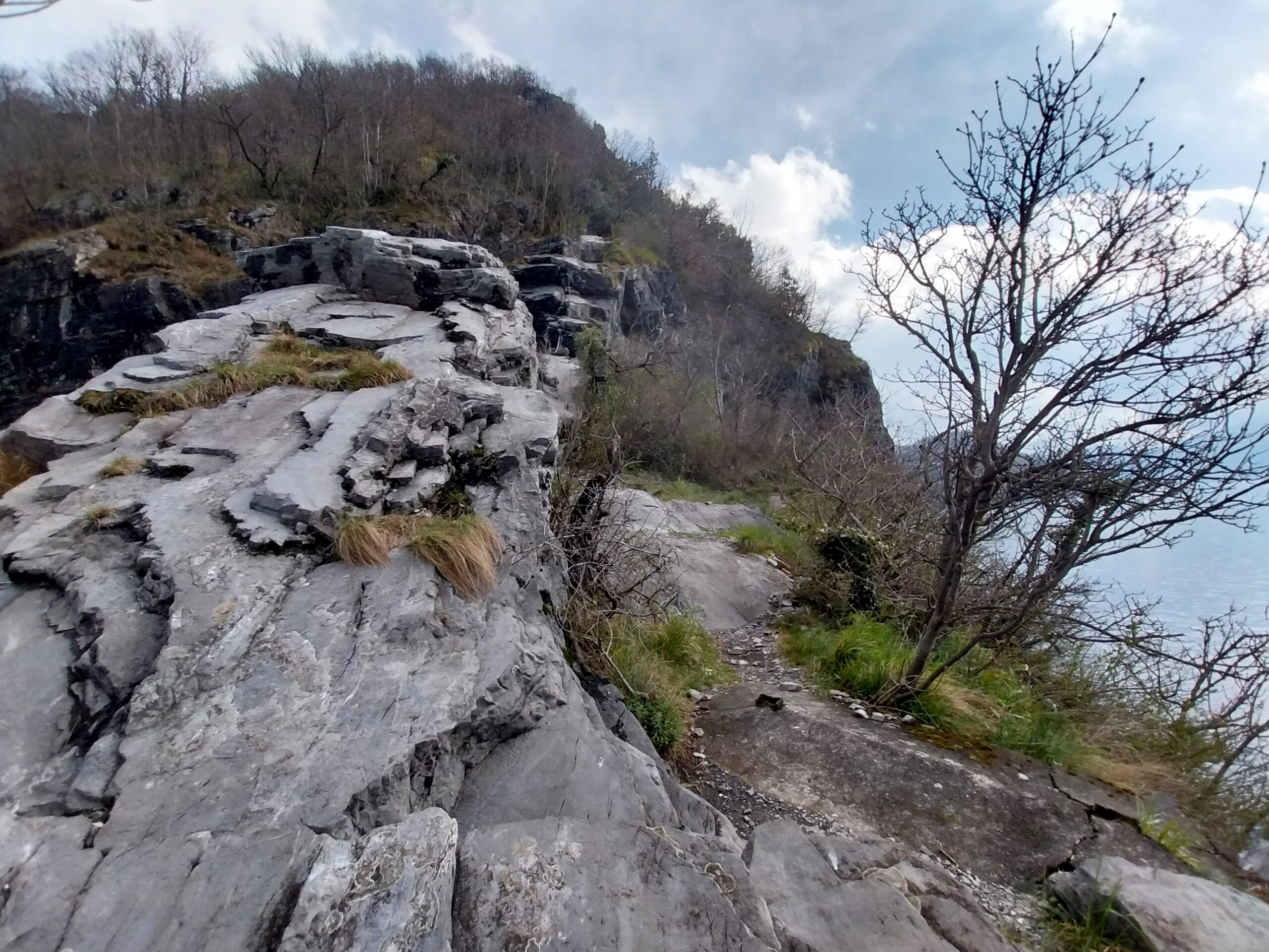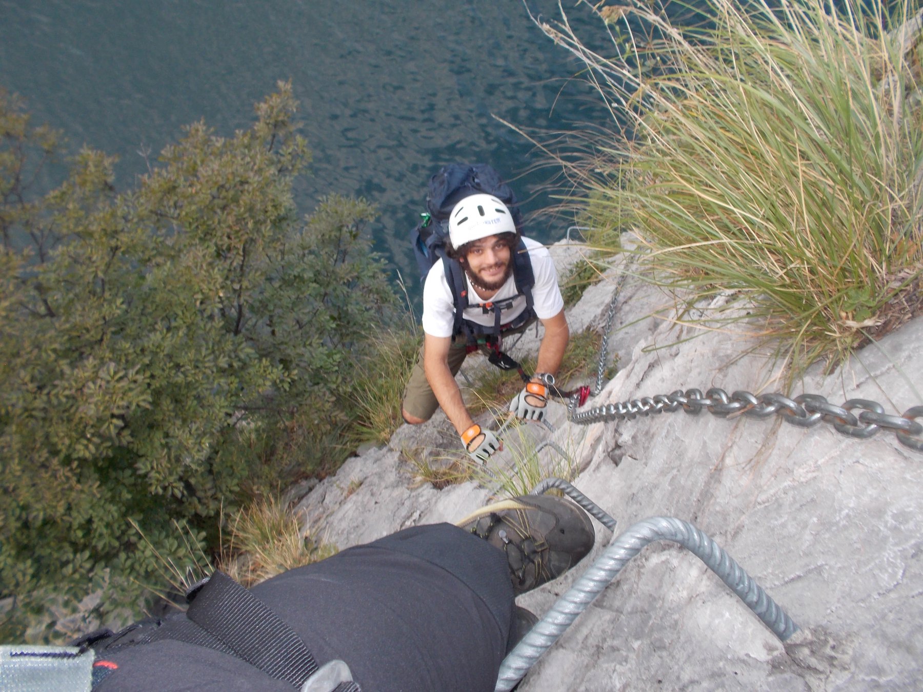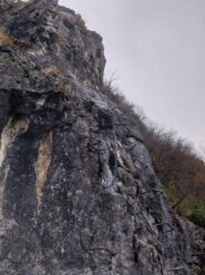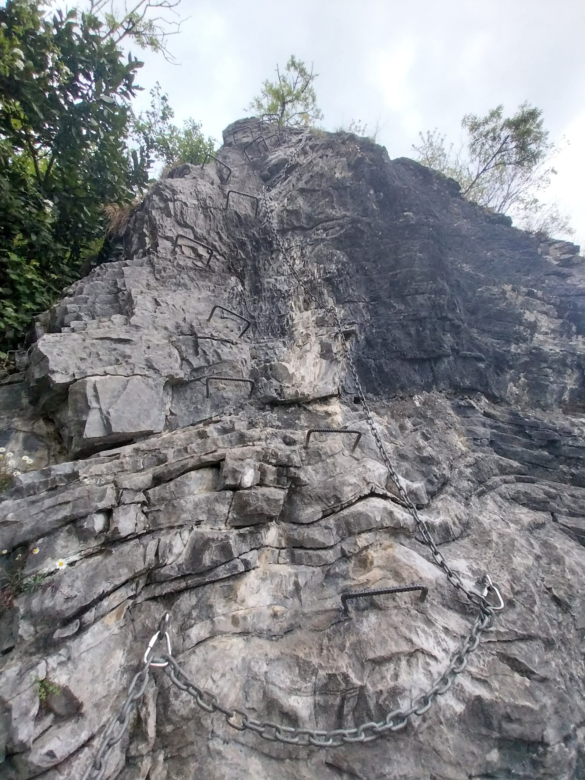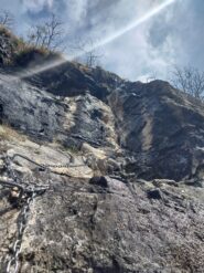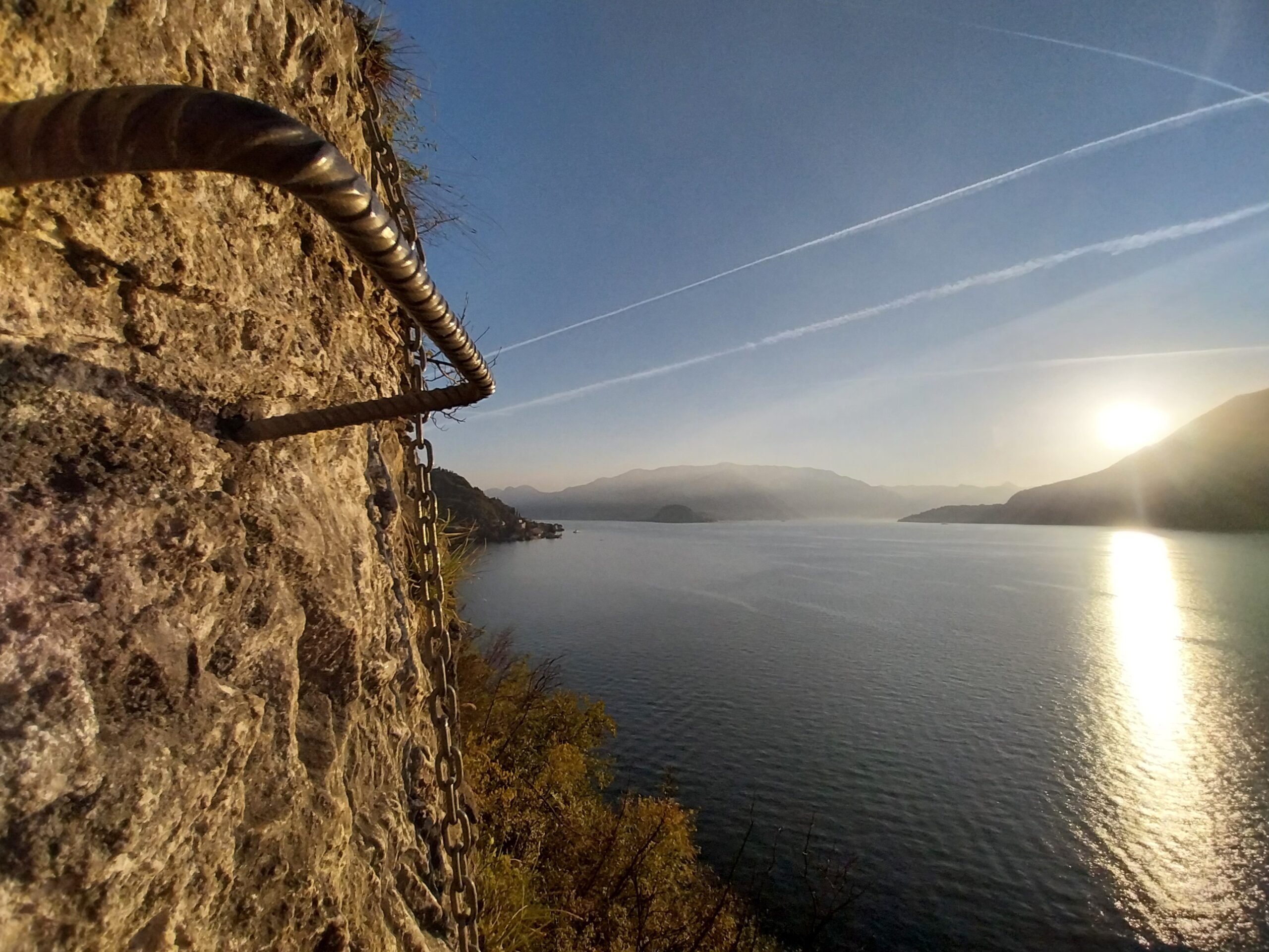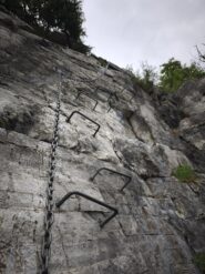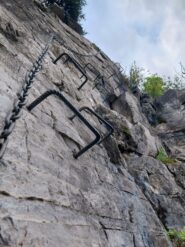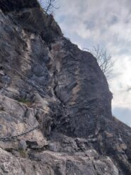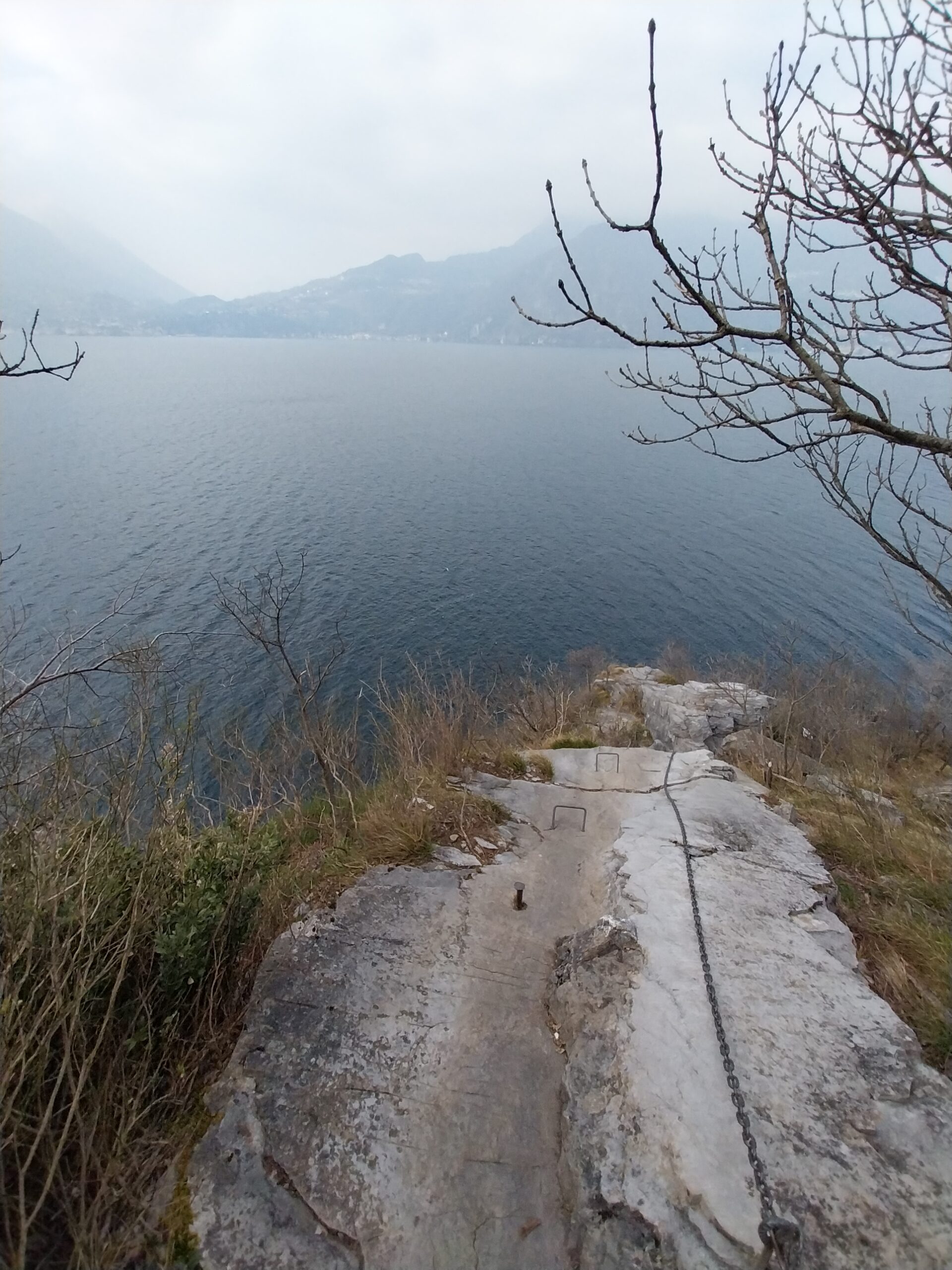 Dall’attacco traversare a sinistra e abbassarsi sfruttando i gradini, superare un primo muretto e portarsi poi a destra per superarne uno più verticale, quasi strapiombante. Raggiunta la sommità della galleria salire in obliquo verso sinistra alternando passaggi su roccia a tratti con terra ed erba. Proseguire lungo un sentiero con cavo sino a raggiungere un muretto attrezzato con vecchi pioli arrugginiti oltre i quali si raggiunge un bivio. Sulla sinistra corre il rientro (possibile via di fuga). Prendere la destra e superare alcuni muretti verticali sino ad un traverso verso destra cui segue un’ultima paretina verticale superata la quale si giunge alla fine della ferrata su un balcone panoramico a picco sul lago.